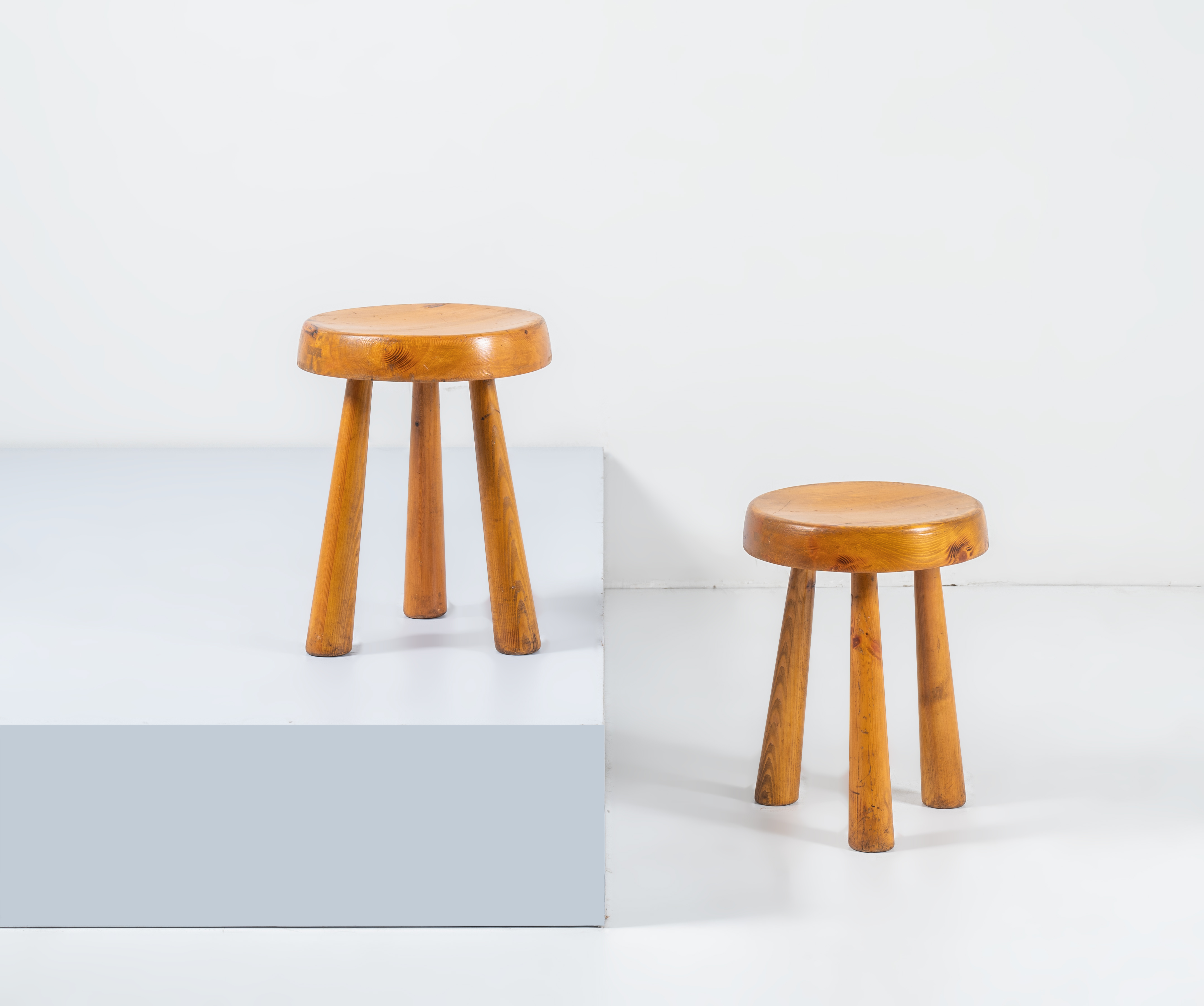 Due sgabelli in legno di quercia, seduta circolare, piede tripode.