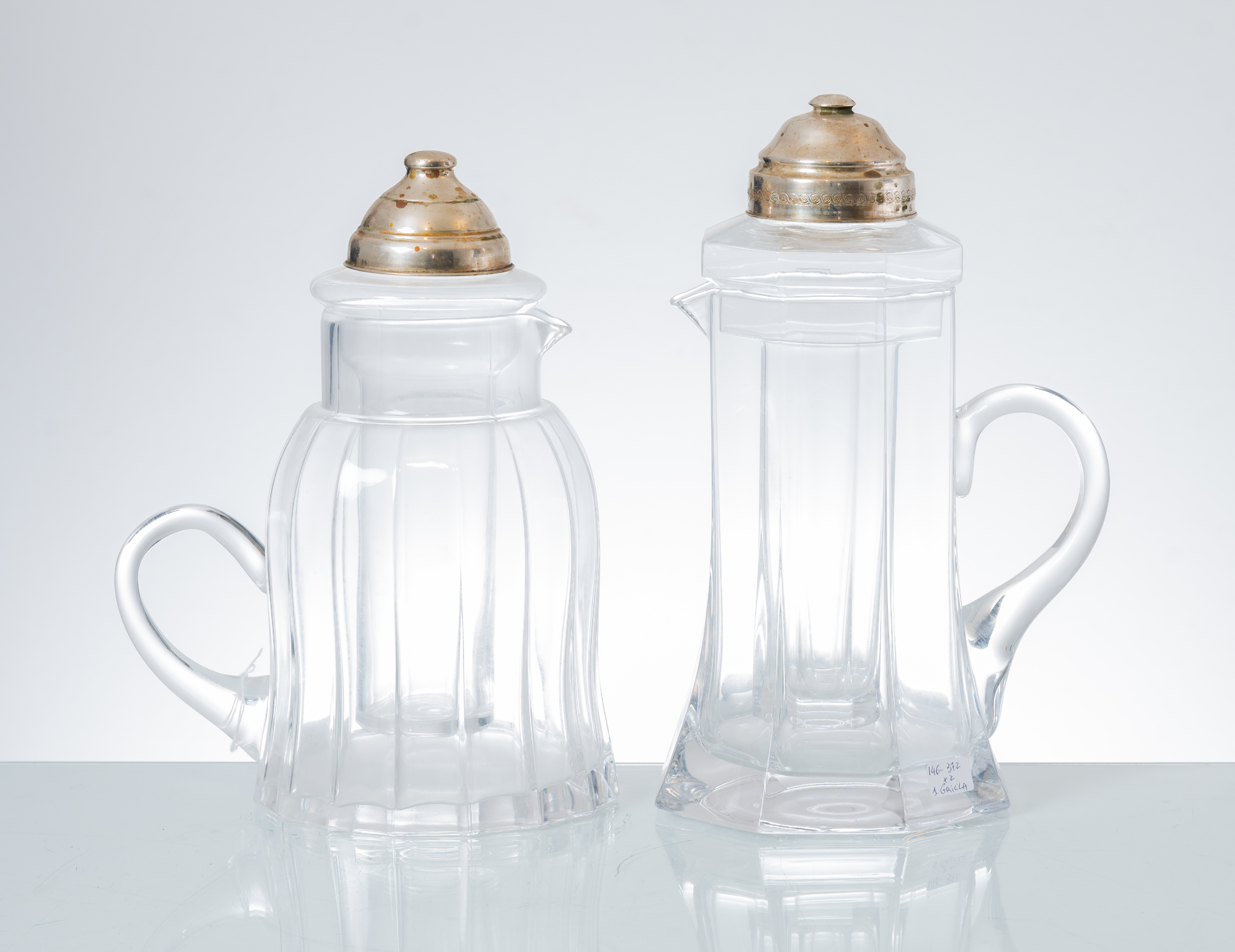 DUE CARAFFE da bibita in vetro con tappi in argento