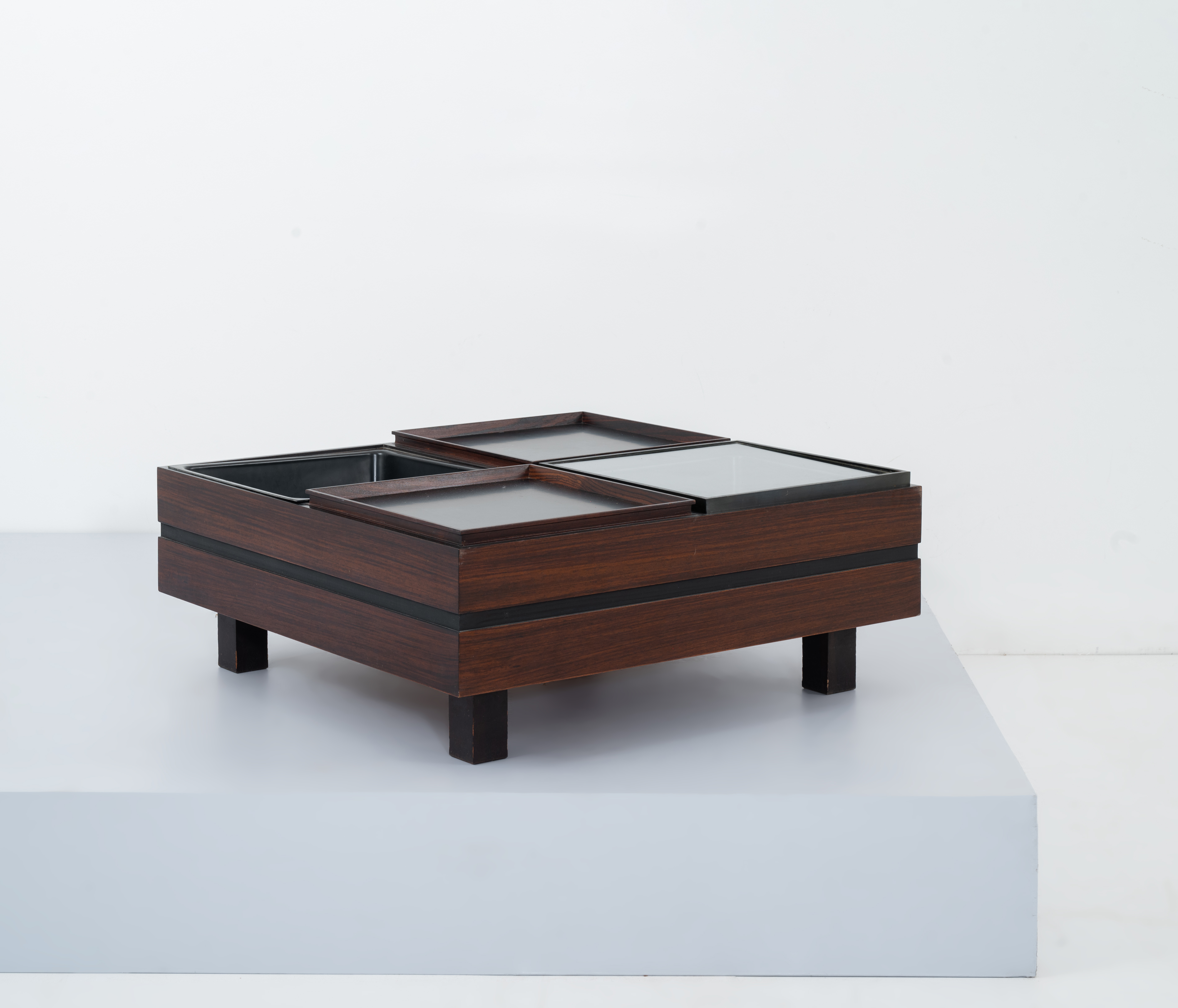 Tavolo da salotto quadrato con struttura in legno impiallacciato teak e legno esotico, piano con quattro incavi porta-oggetti a giorno e tre coperchi amovibili. Lievi usure.