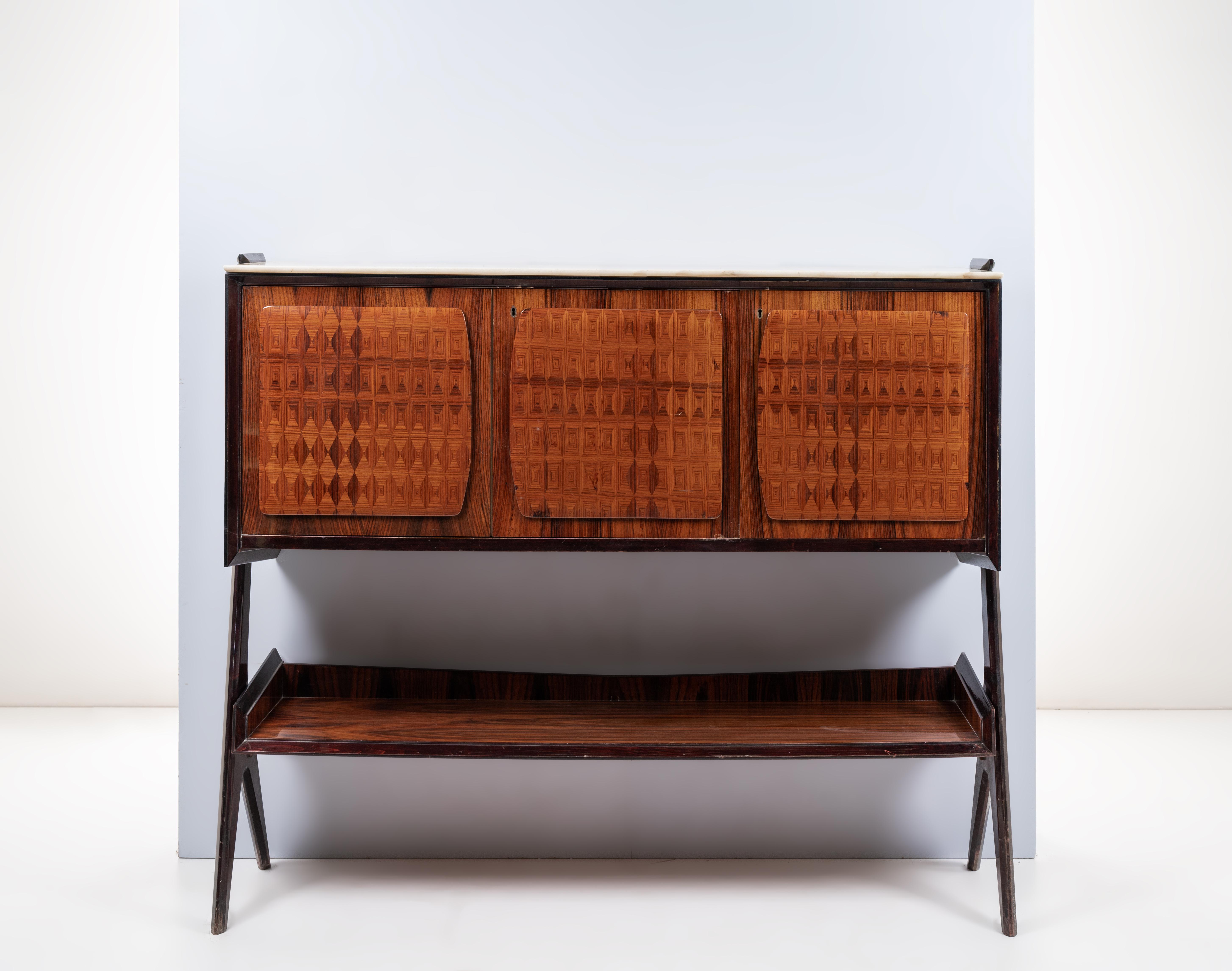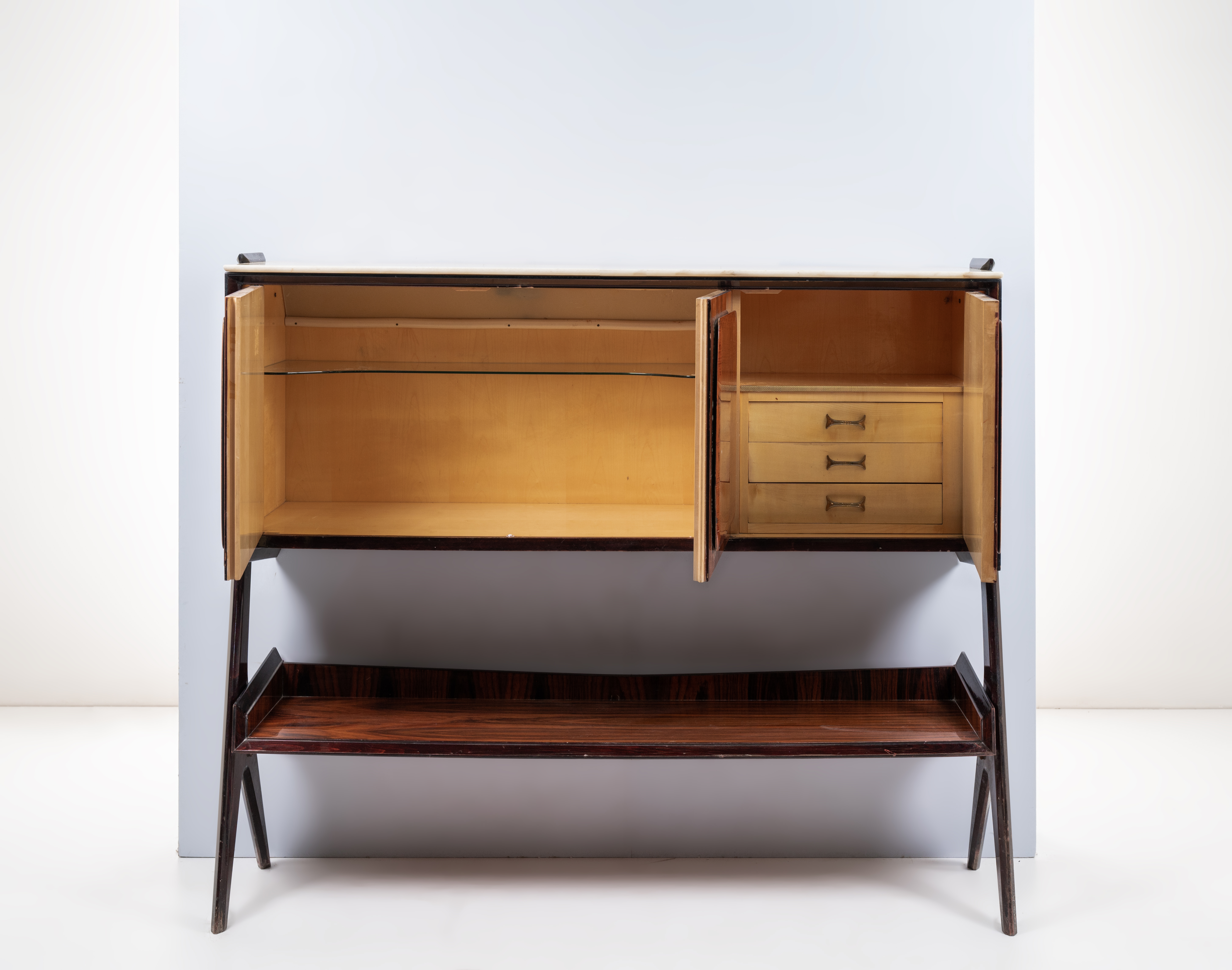 Mobile bar in legno esotico e legno di noce, piede alto a coda di rondine in legno ebanizzato, sul fronte un corpo sospeso diviso in due parti, da un lato un vano contenitore con mensola di vetro chiuso con due ante battenti, di fianco un vano con tre cassetti e un vano sovrastante chiuso con un’anta battente. Una mensola sottostante. Minuterie in ottone. Piccole usure.