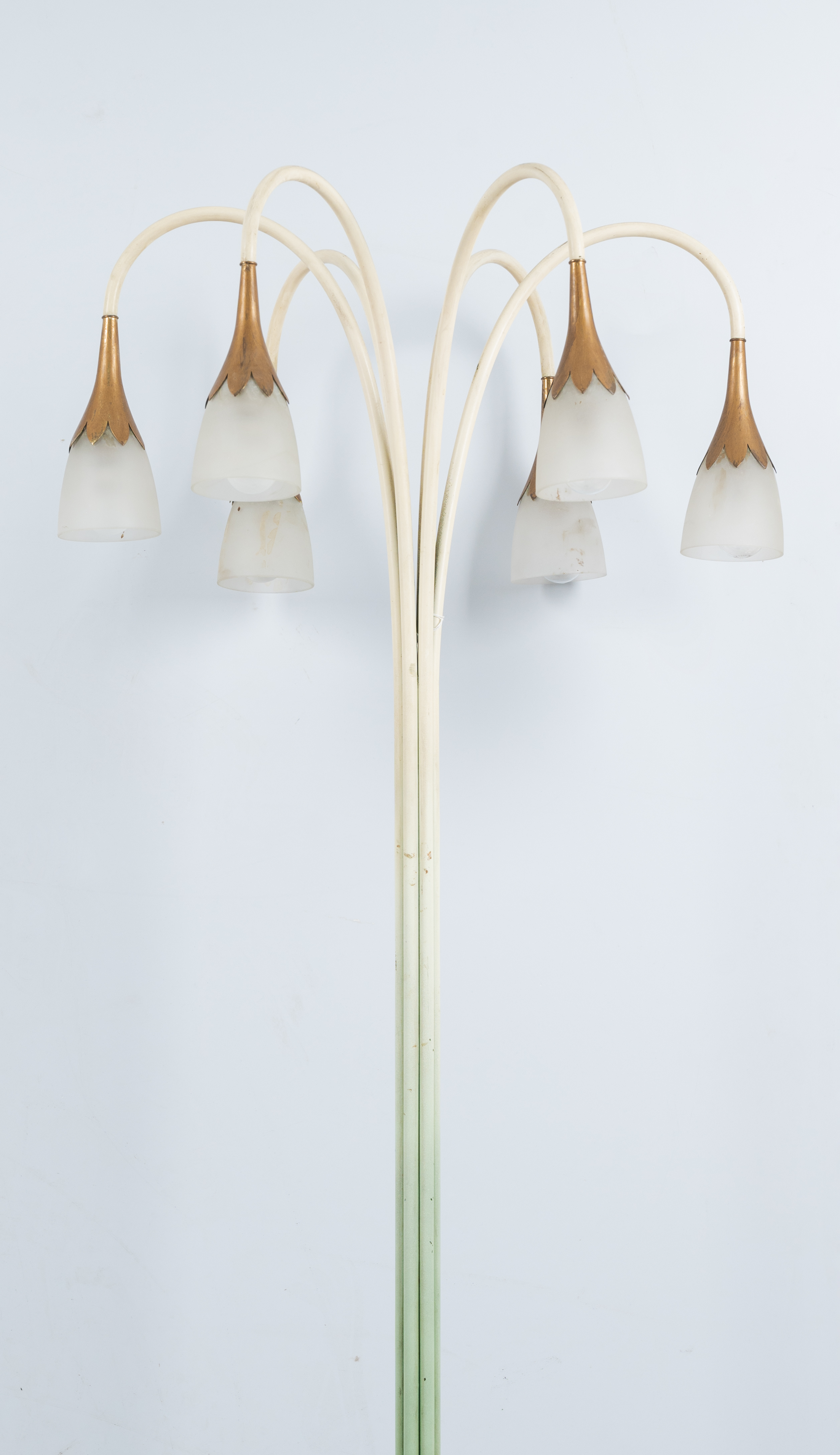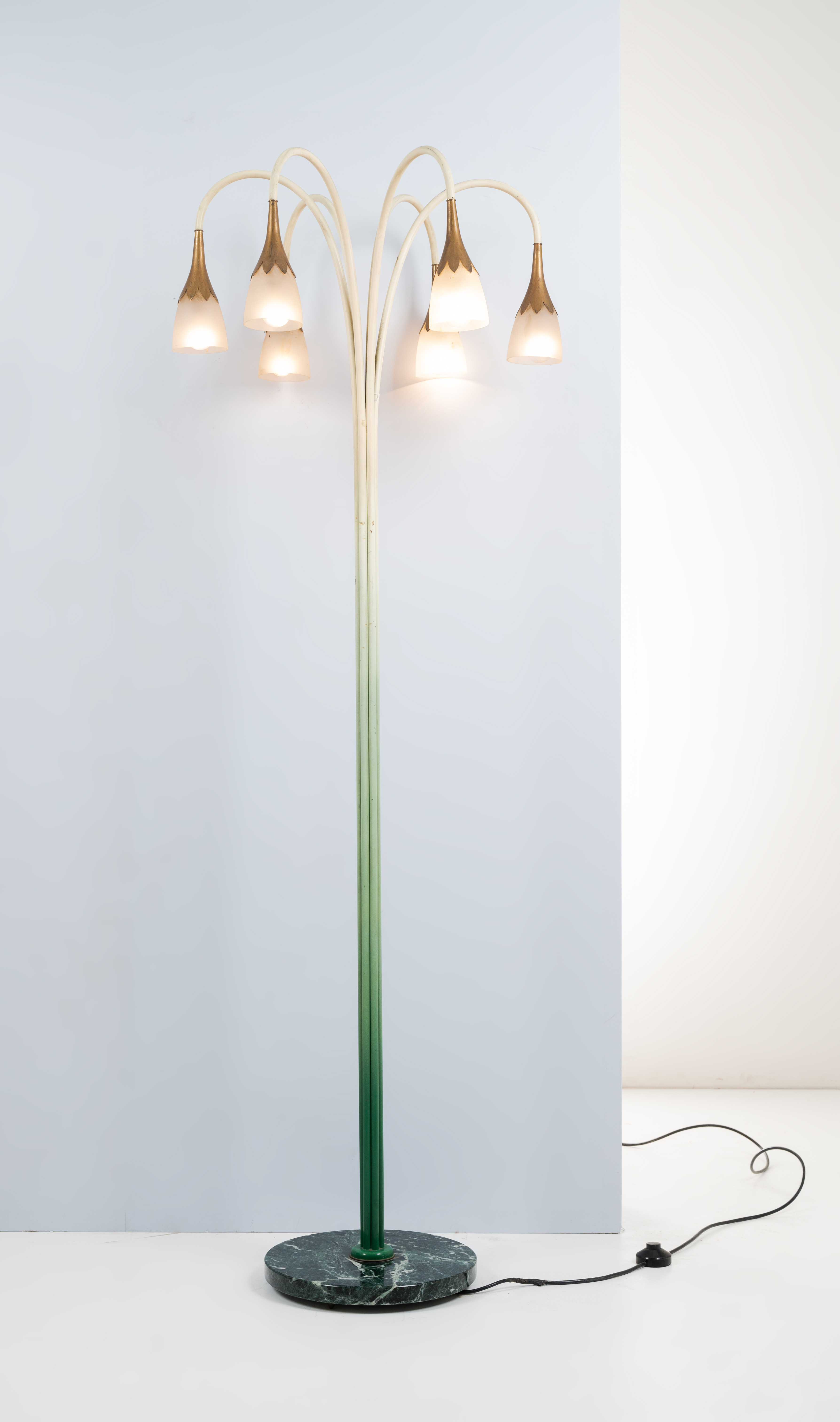 Lampada da terra a sei luci con struttura in metallo verniciato verde a sfumare fino a raggiungere i toni del bianco, sei bracci curvi verso il basso con diffusori a fiore in ottone e vetro opalino. Base circolare in marmo verde. Tutte le componenti sono originali.