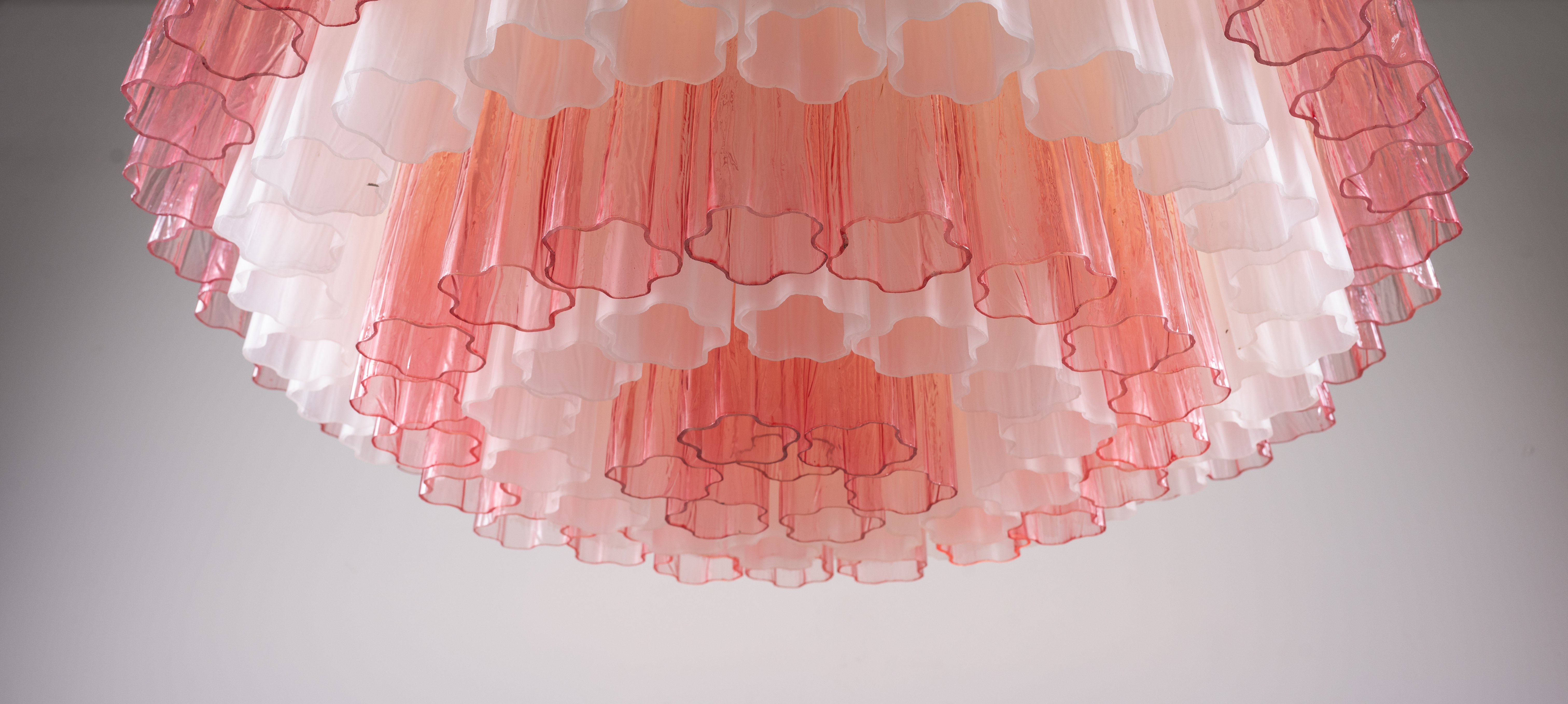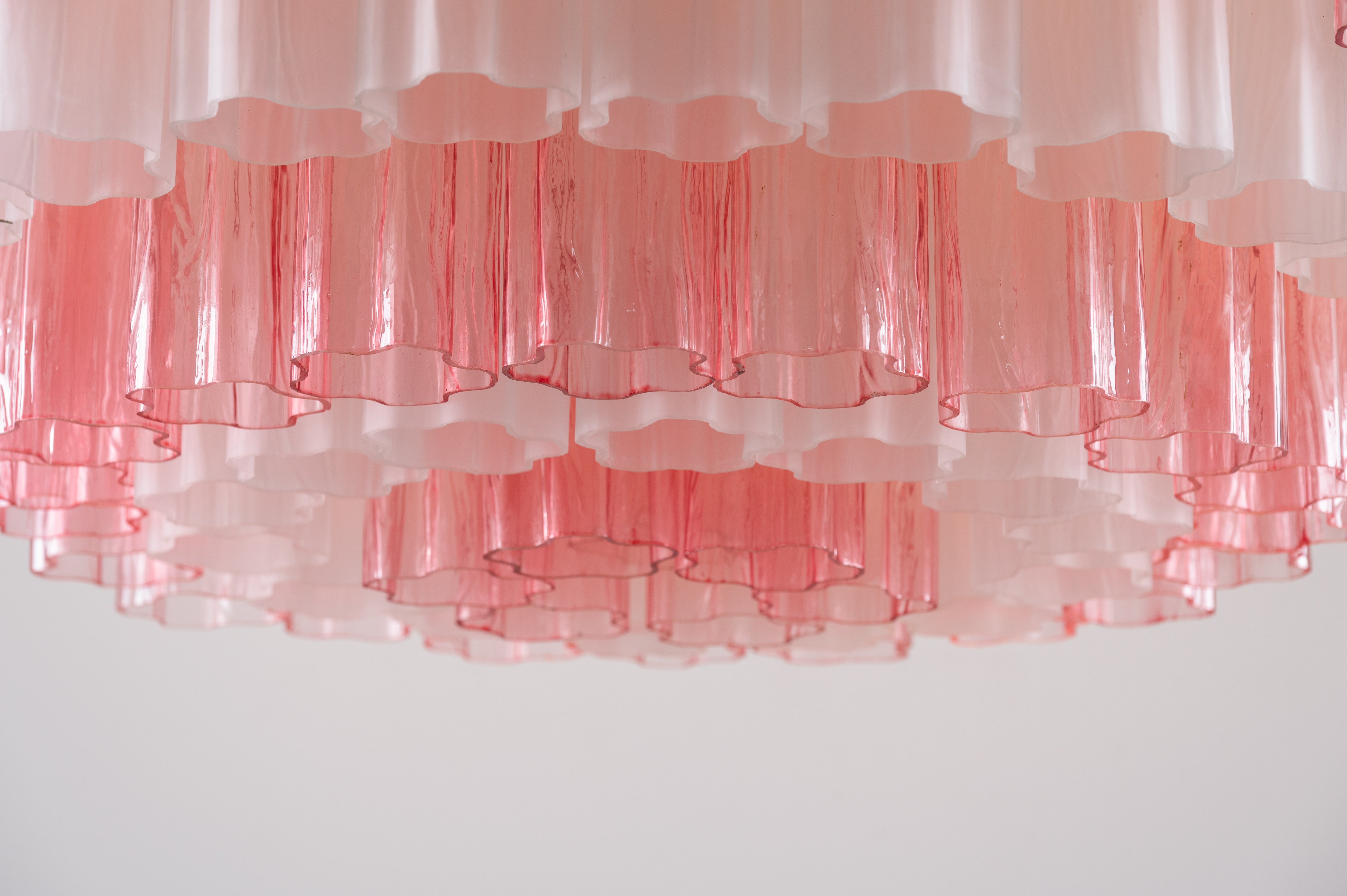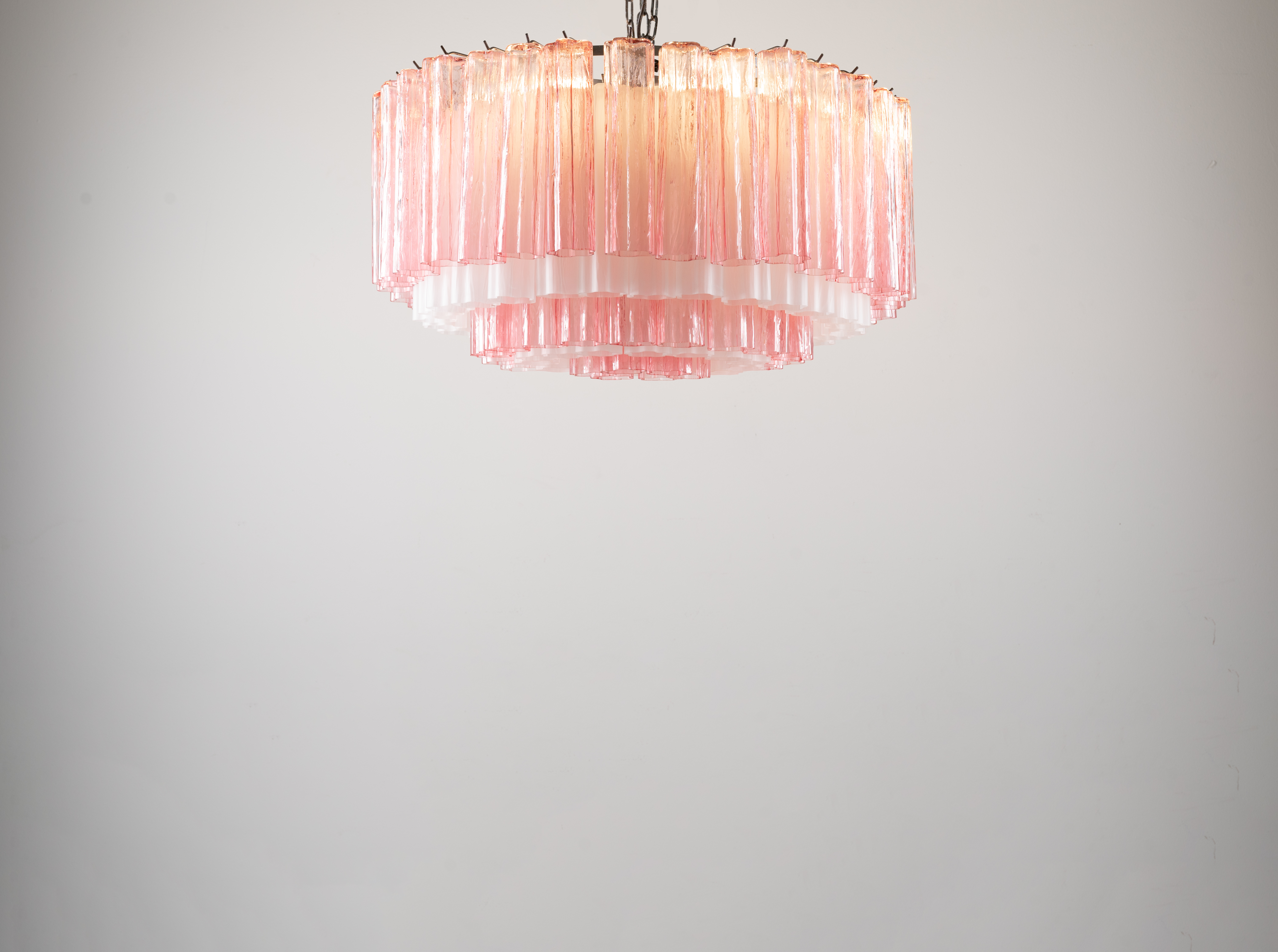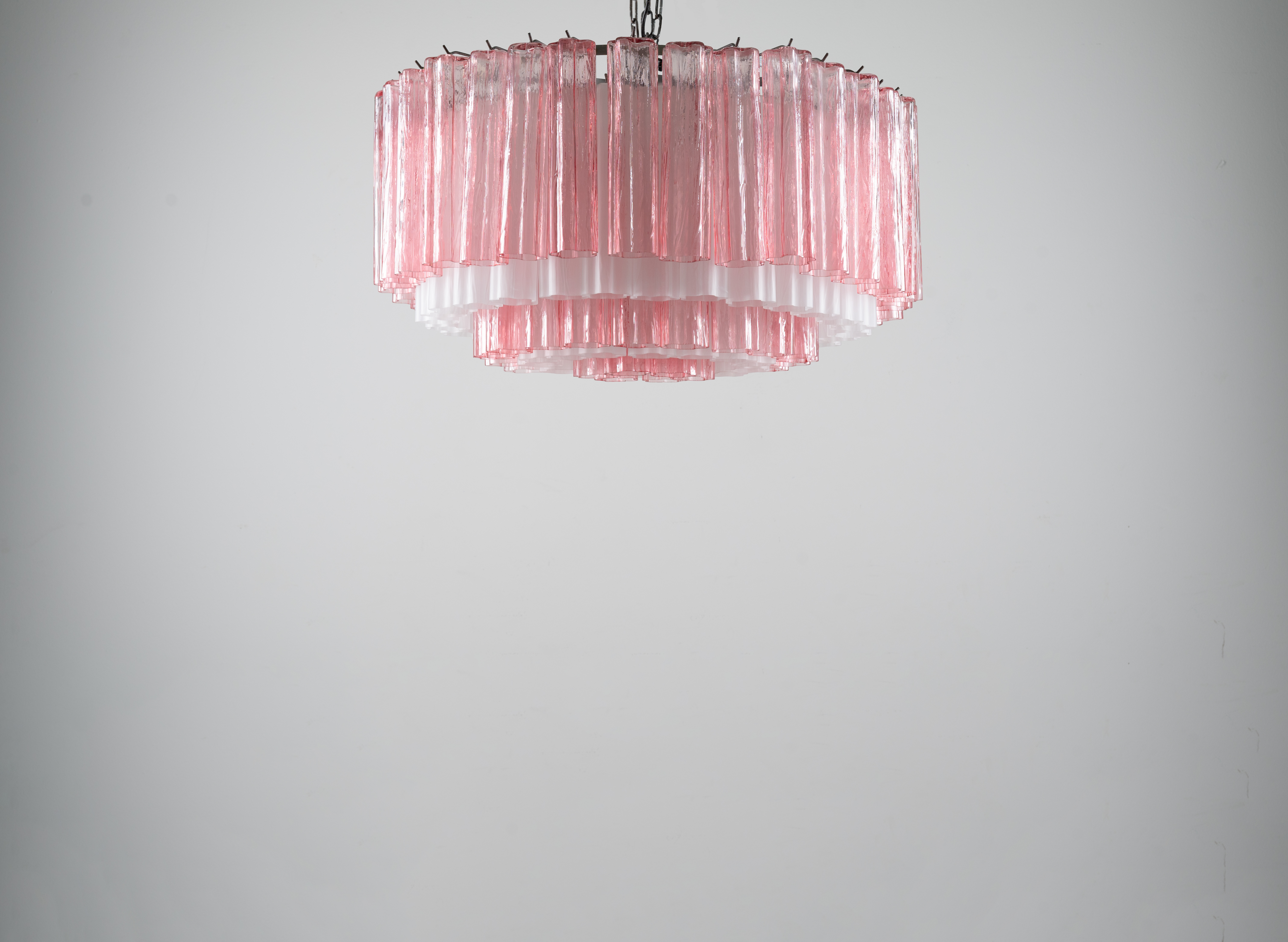 Lampada a sospensione a sei luci, struttura ad in metallo cromato, diffusore circolare composto da elementi a calza in vetro di Murano rosa trasparente e lattimo.