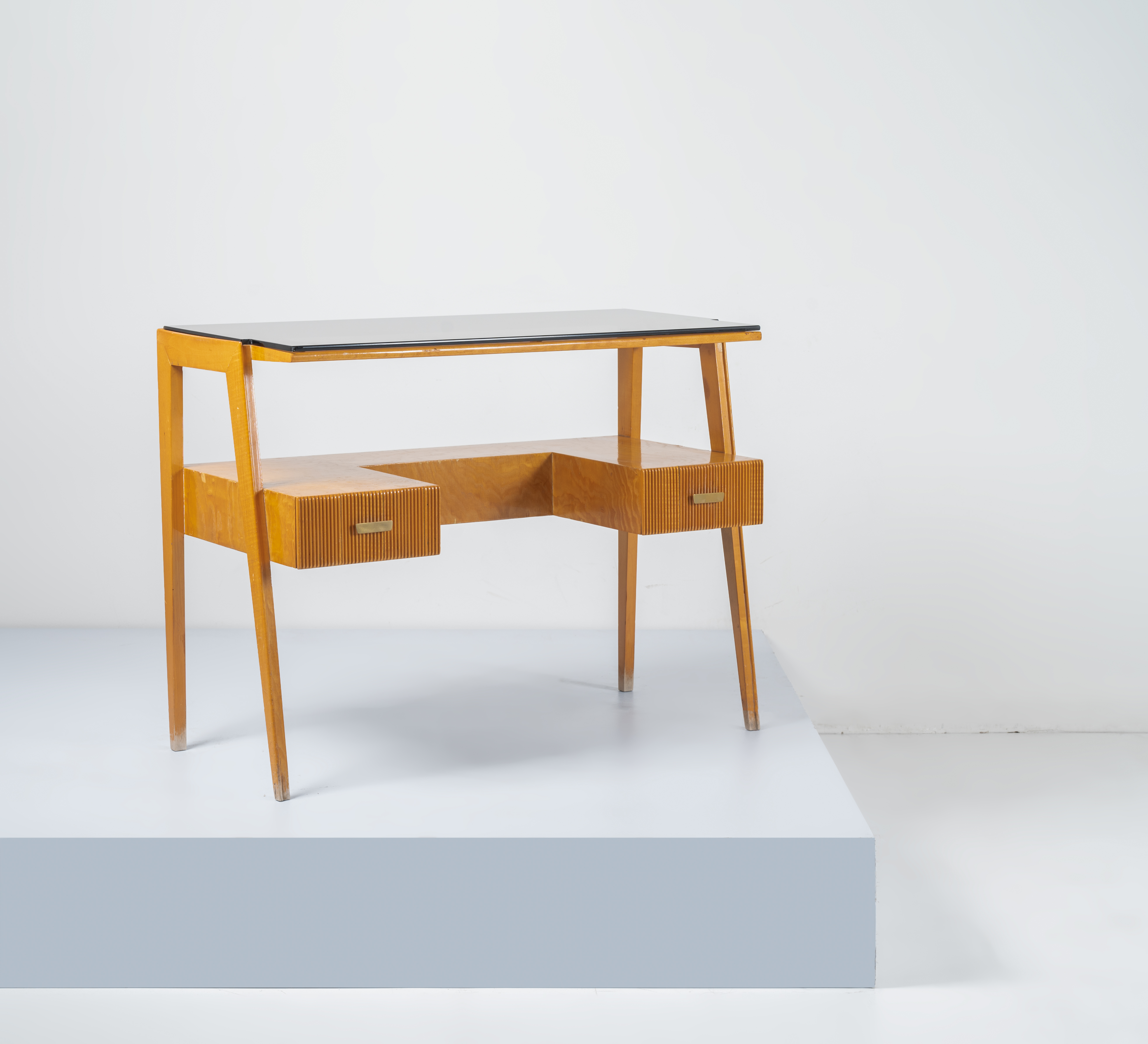 Scrivania con struttura in legno di acero, piano rettangolare in vetro incolore, sotto piano sagomato con due cassetti a lavorazione frontale bacchettato, maniglie in ottone. Segni di uso e difetti.