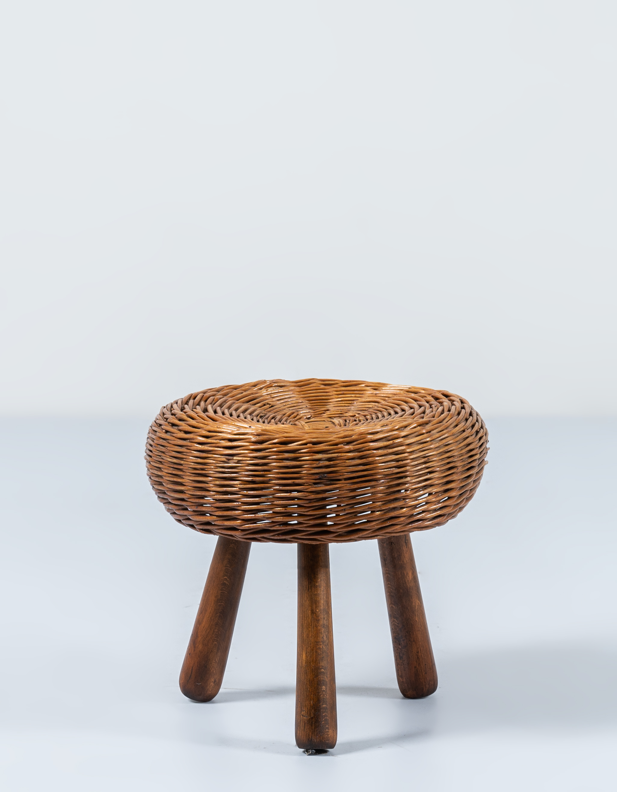 Sgabello con seduta in midollino, tre gambe in legno di faggio.