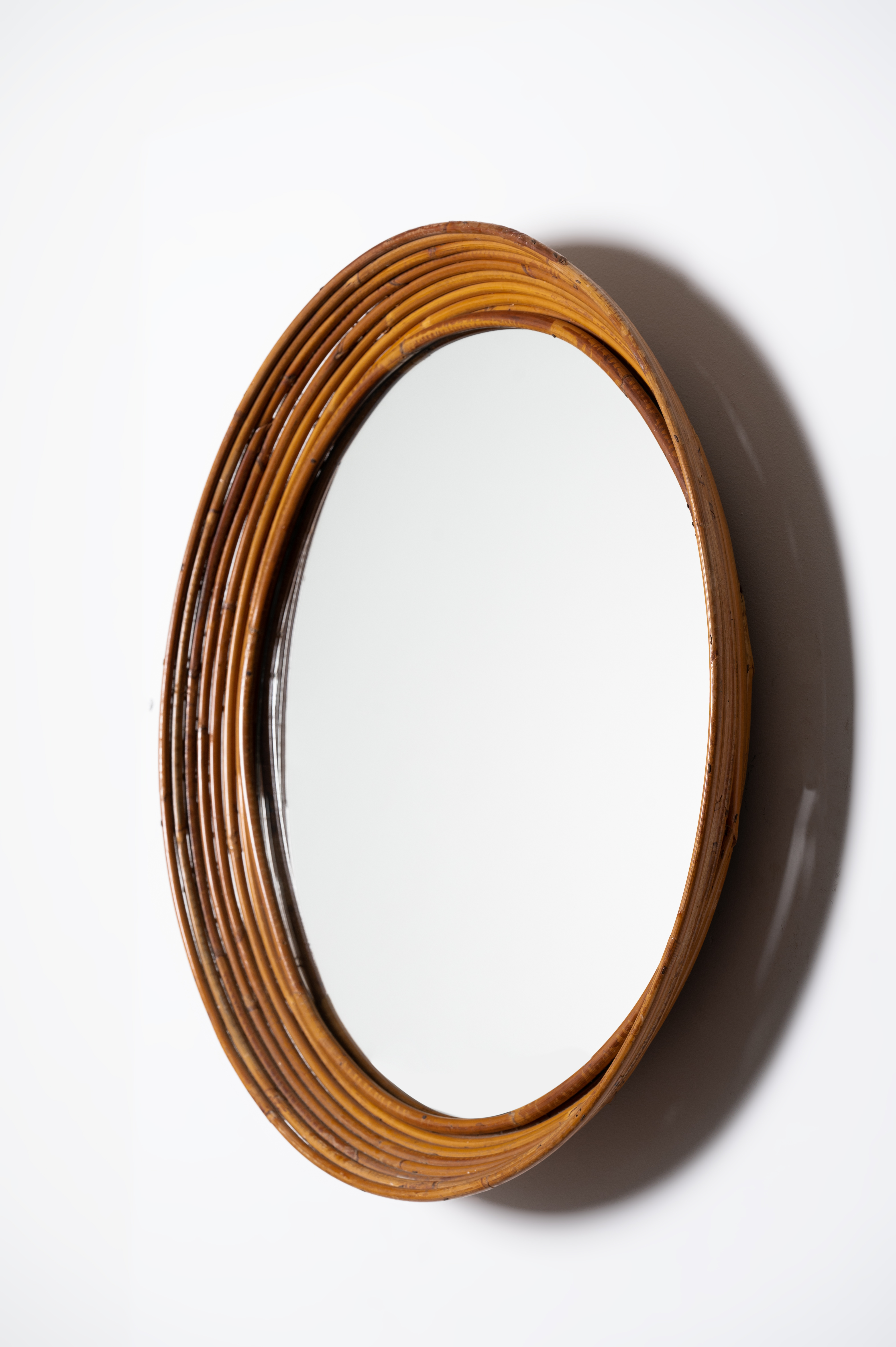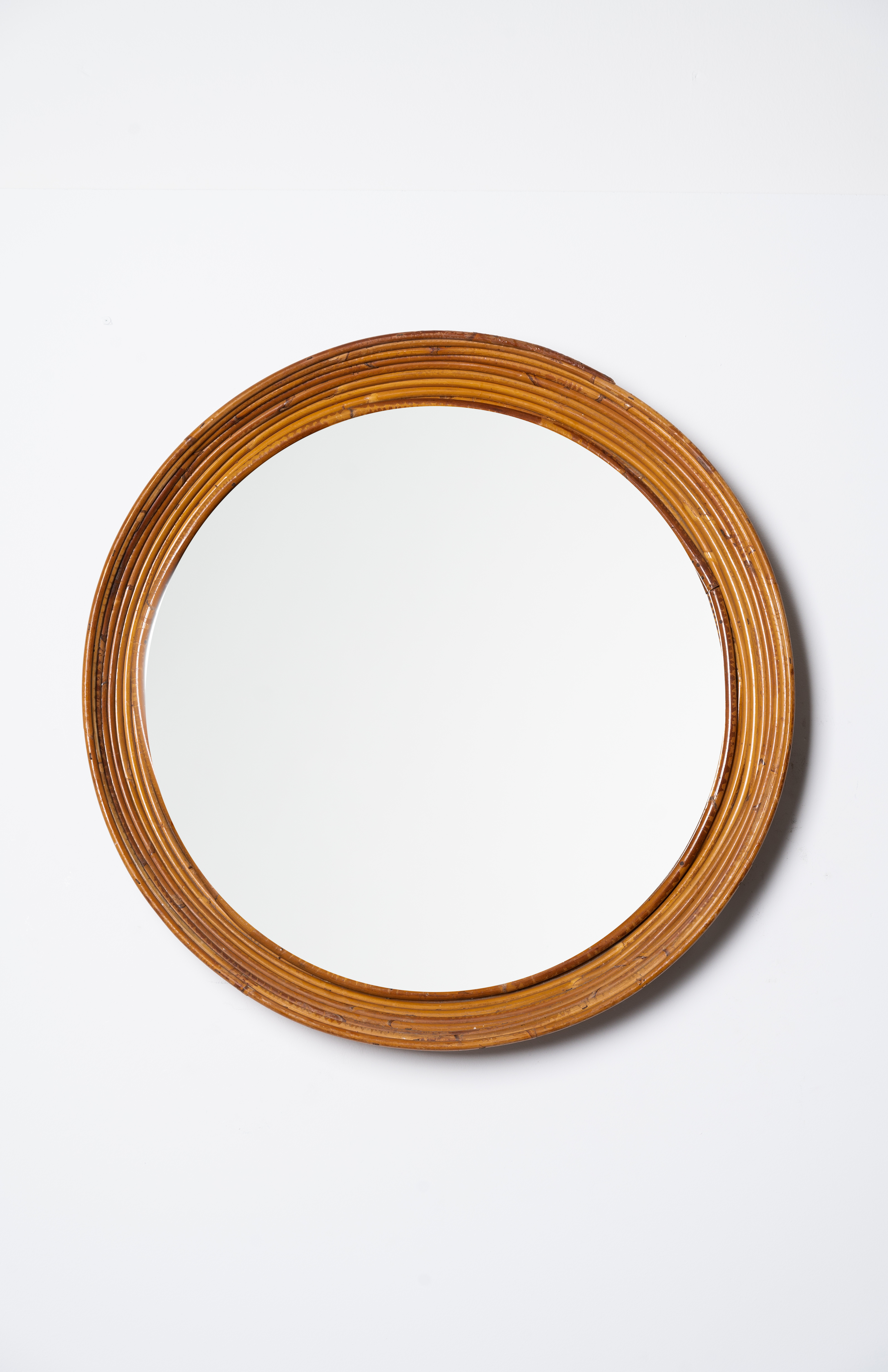 Specchio da parete circolare con cornice in giunco, cristallo specchiato.