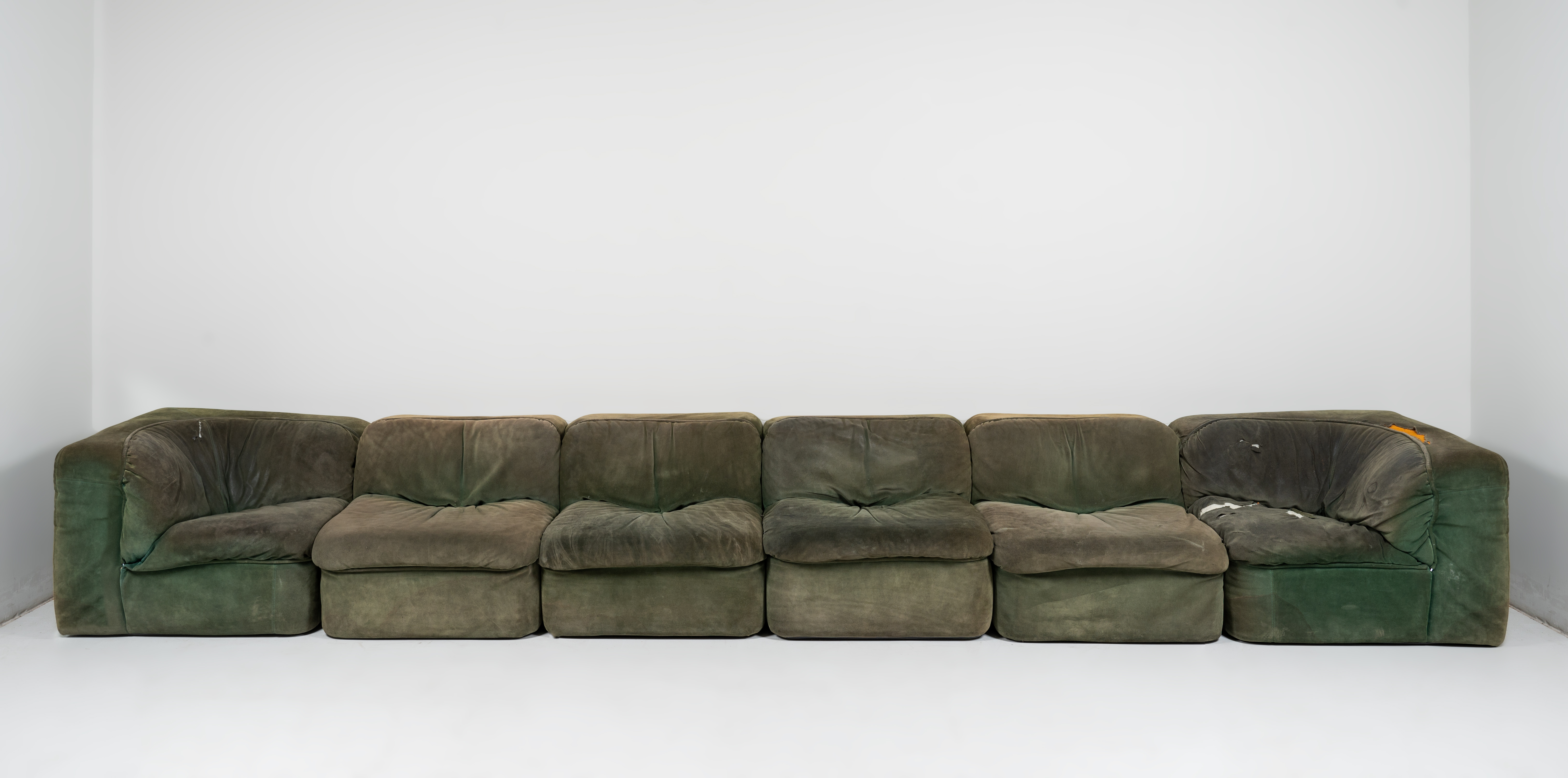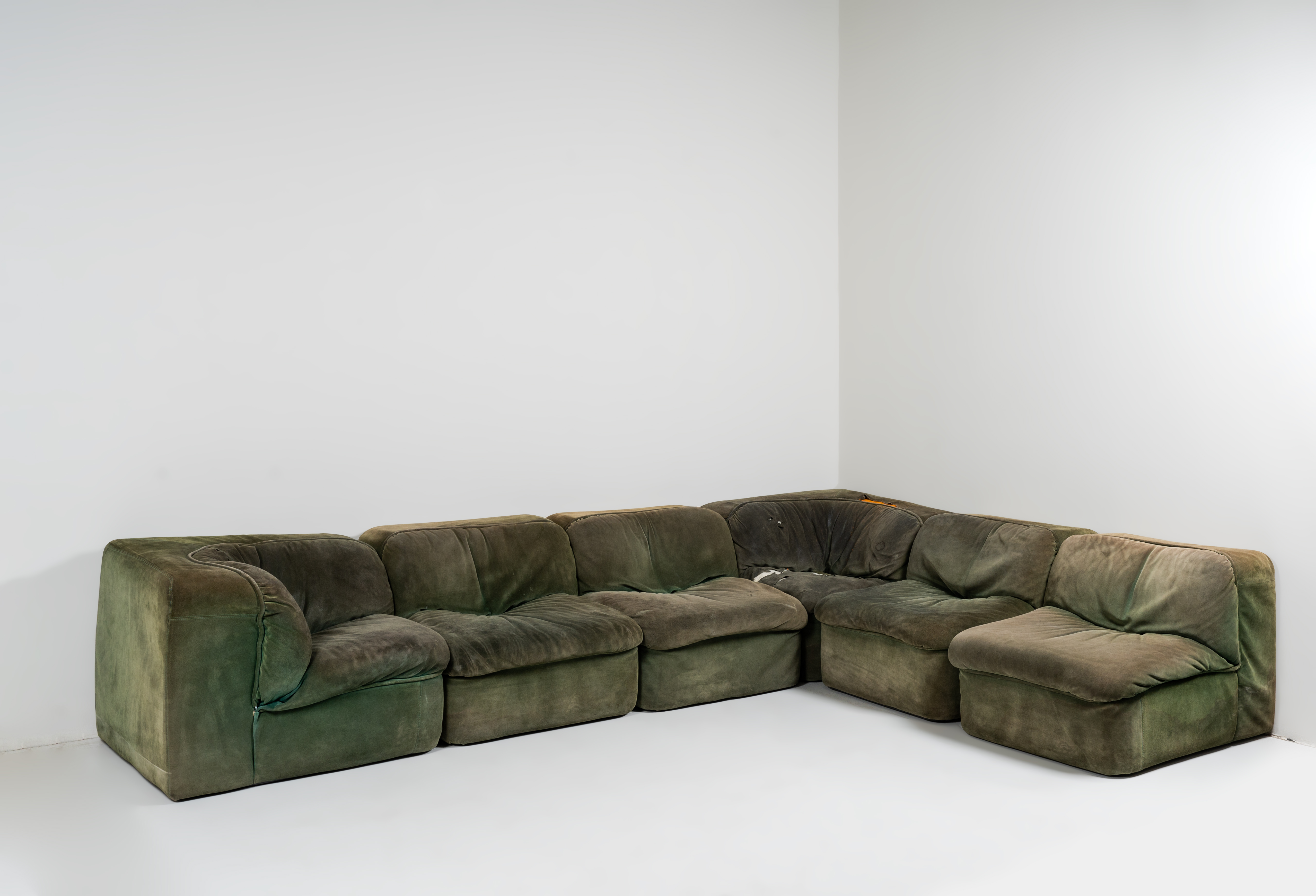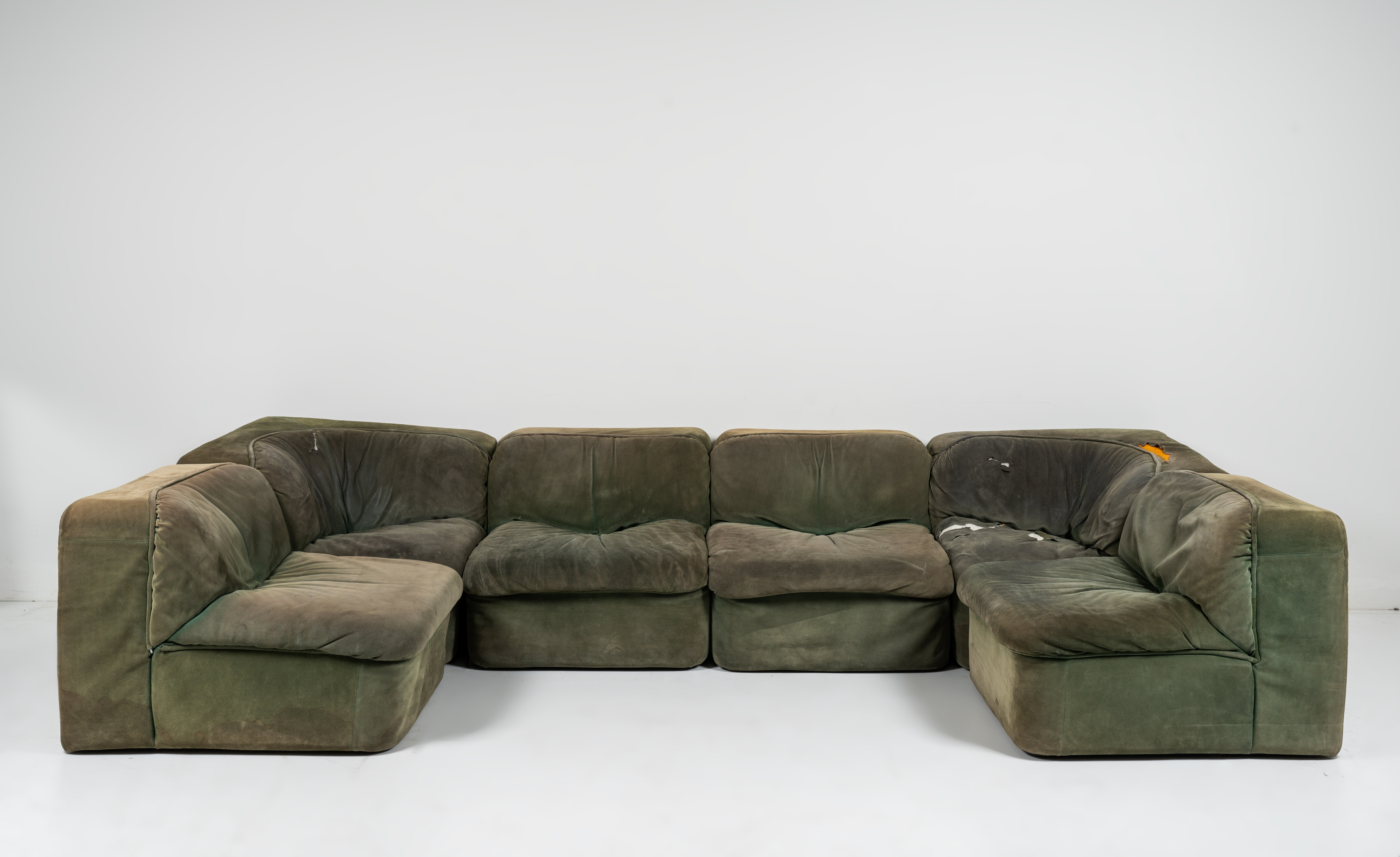 Divano modulare modello “Susi” composto da sei moduli di cui due angolari, struttura con imbottitura e rivestimento in tessuto scamosciato verde. Difetti, segni di uso e strappi.