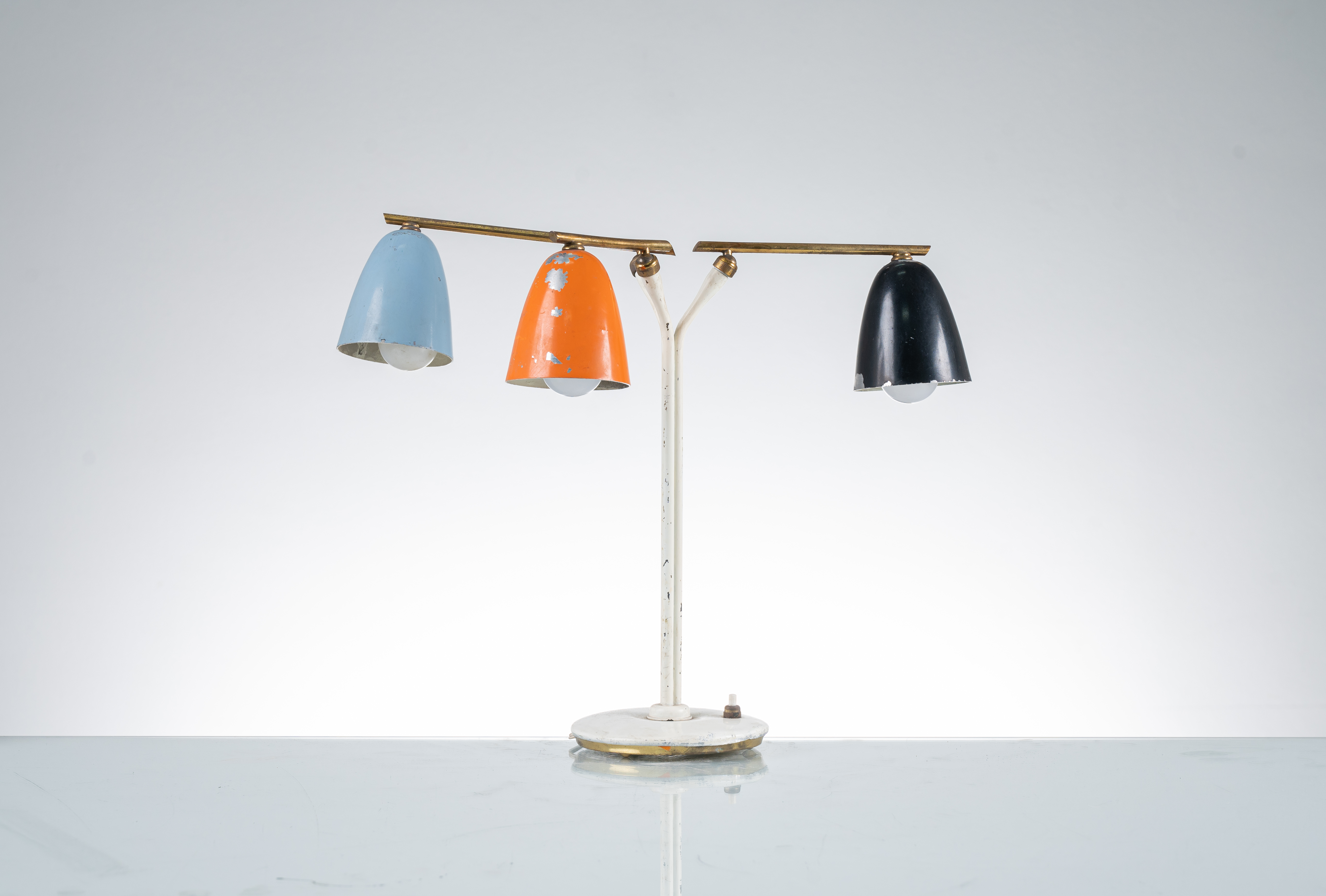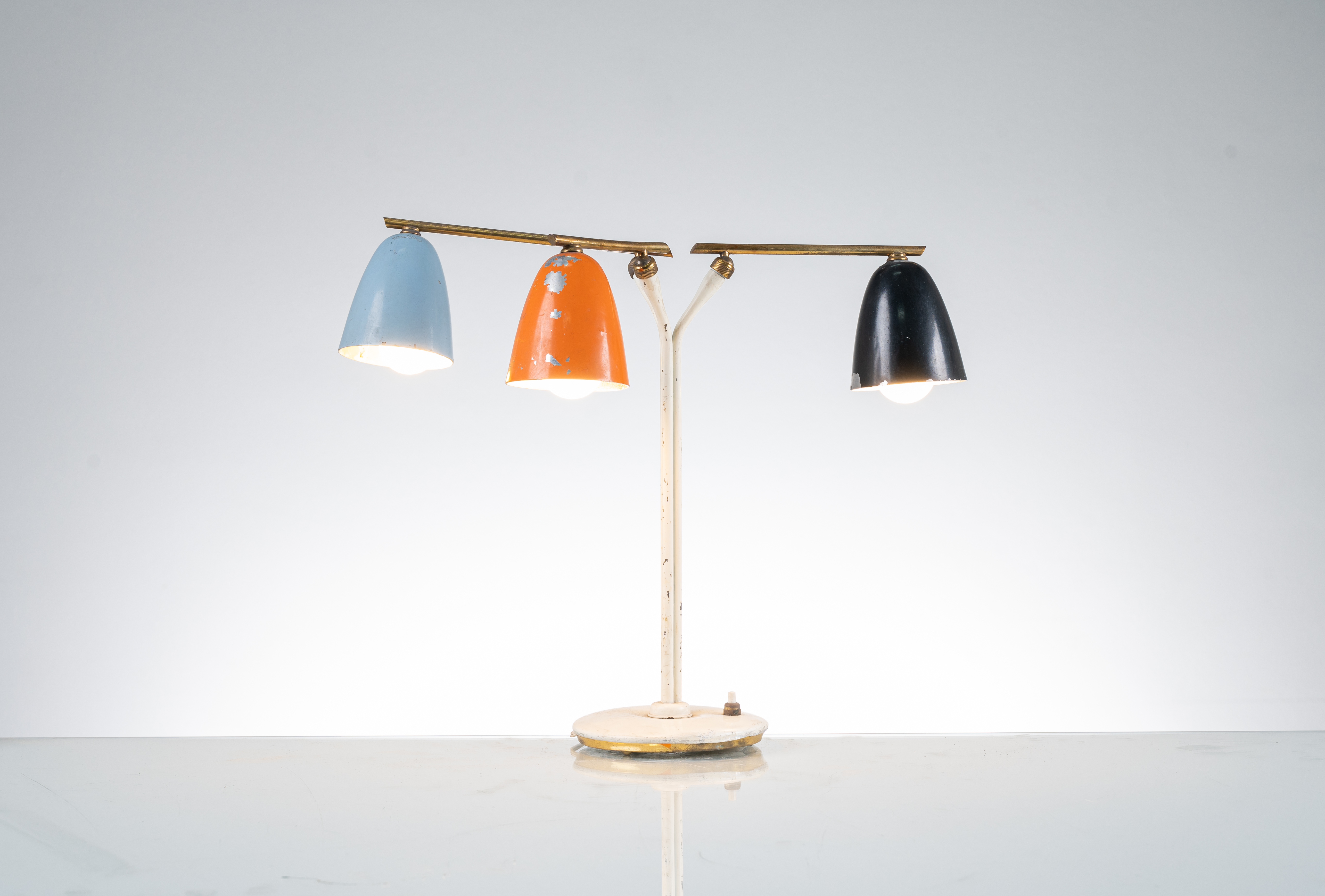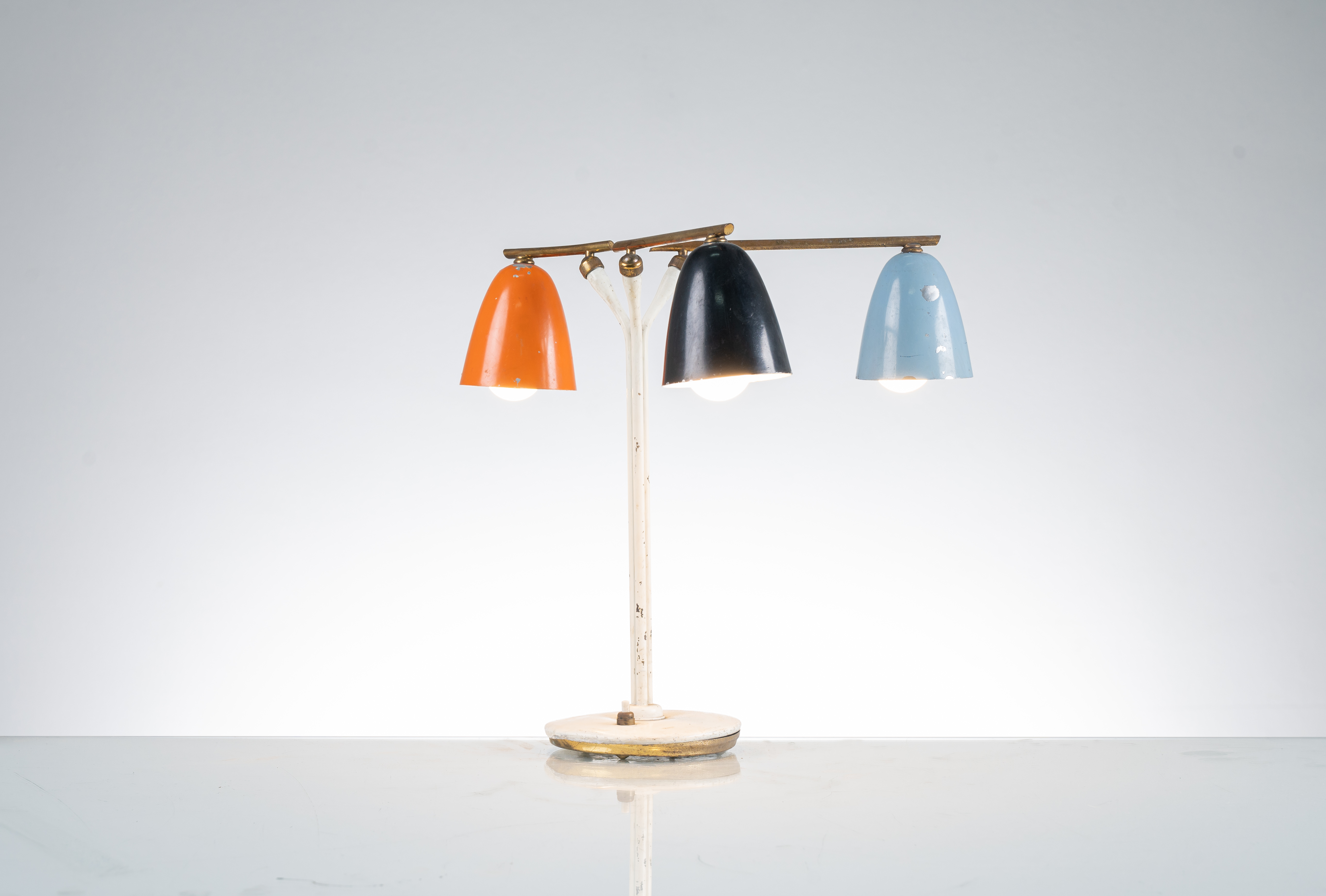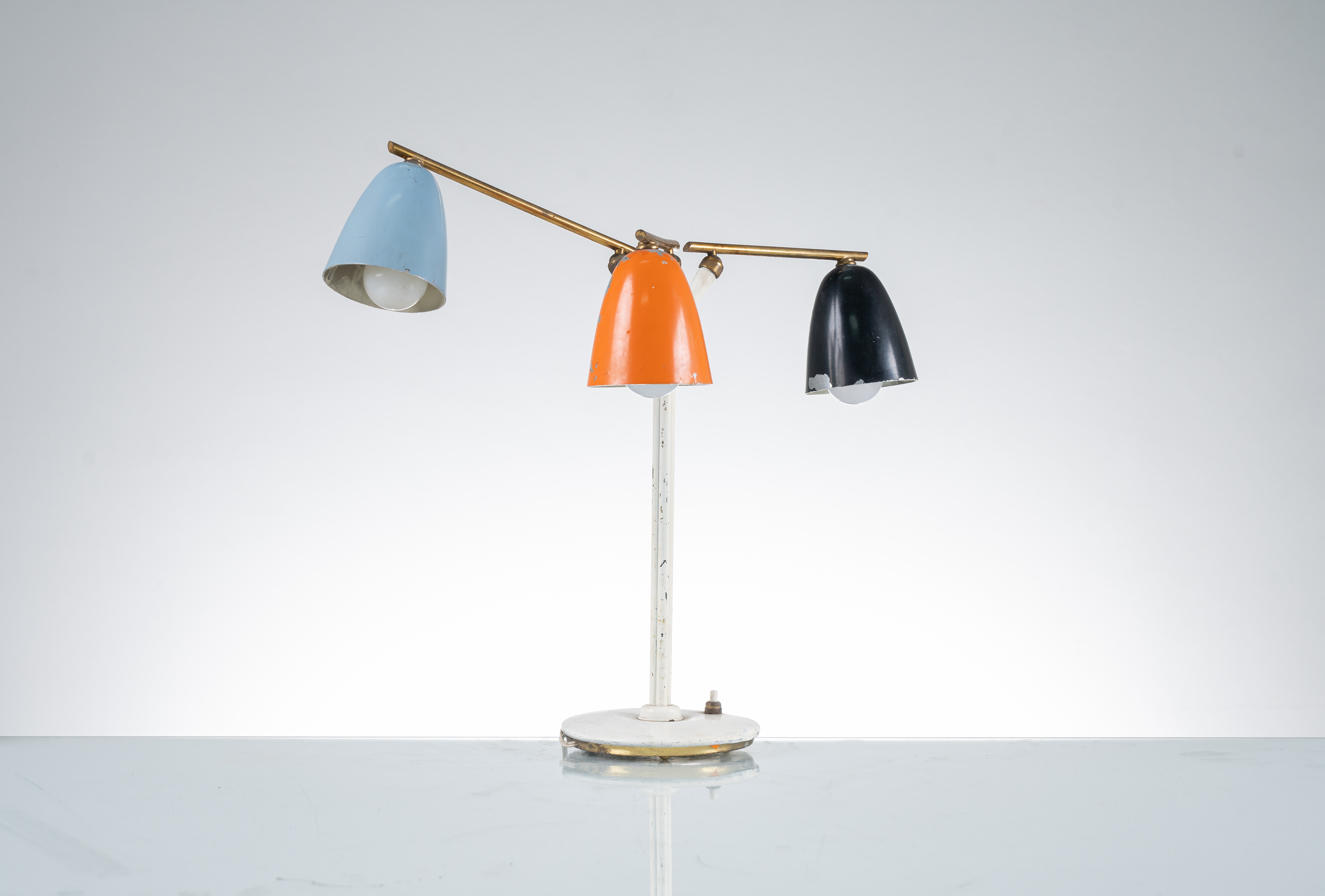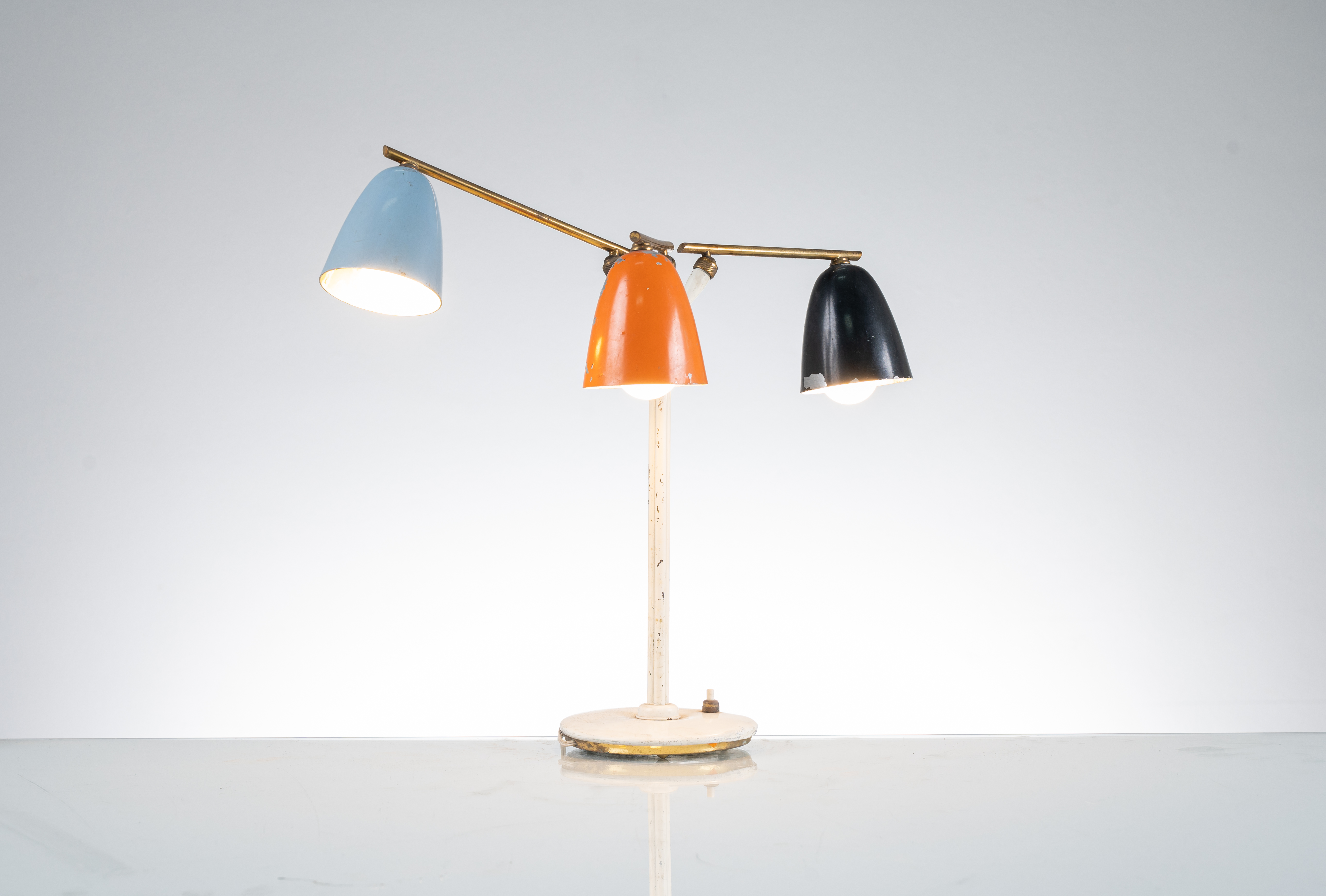 Lampada da tavolo a tre luci con struttura in metallo verniciato bianco, ottone, diffusori a campana in metallo verniciato celeste, arancione e nero. Vernice originale, segni di usura e lievi difetti.