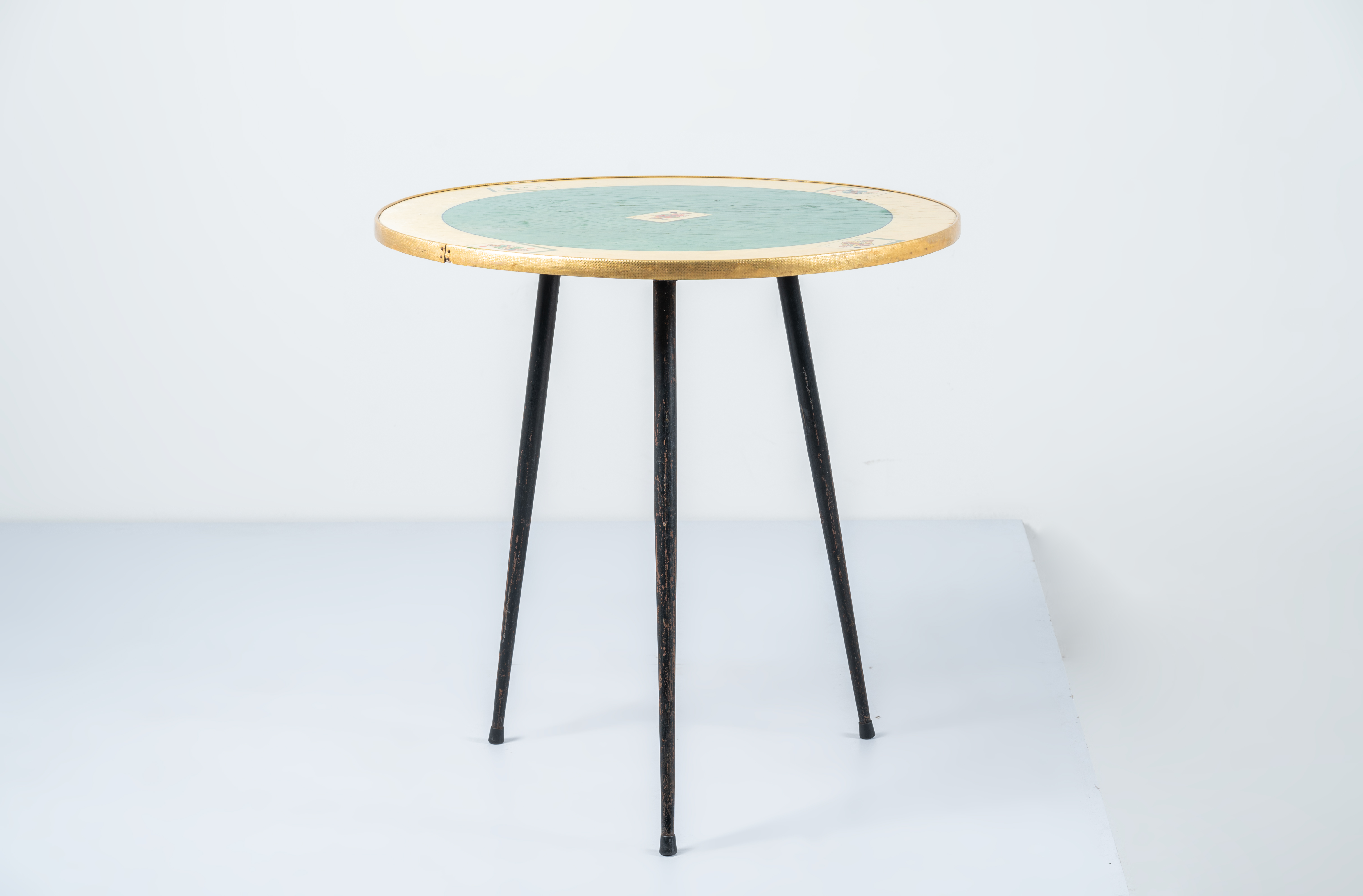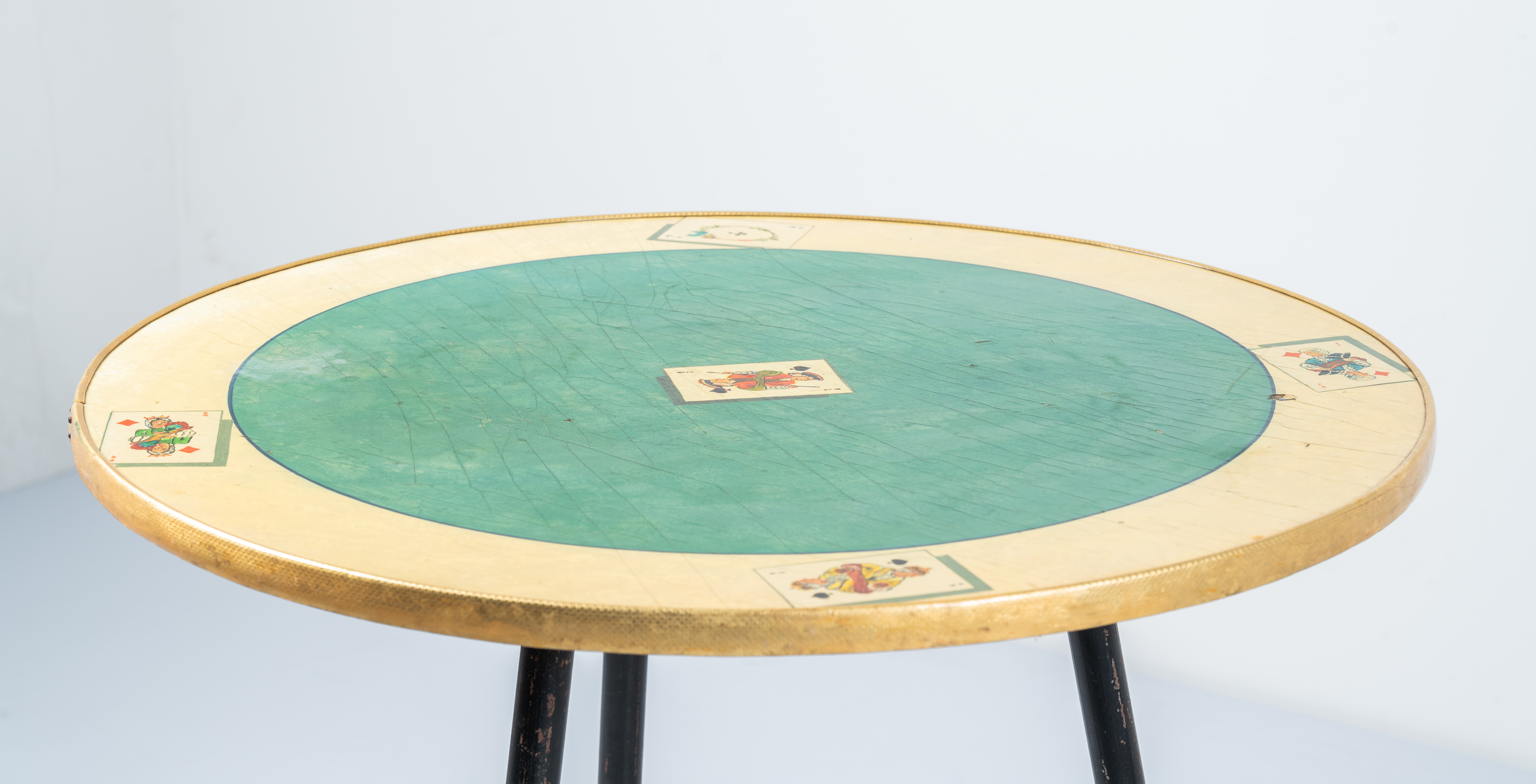 Tavolo da gioco con piano circolare in pergamena decorato con carte da gioco, piede tripode in legno laccato nero, cornice in metallo dorato. Difetti e segni di uso.