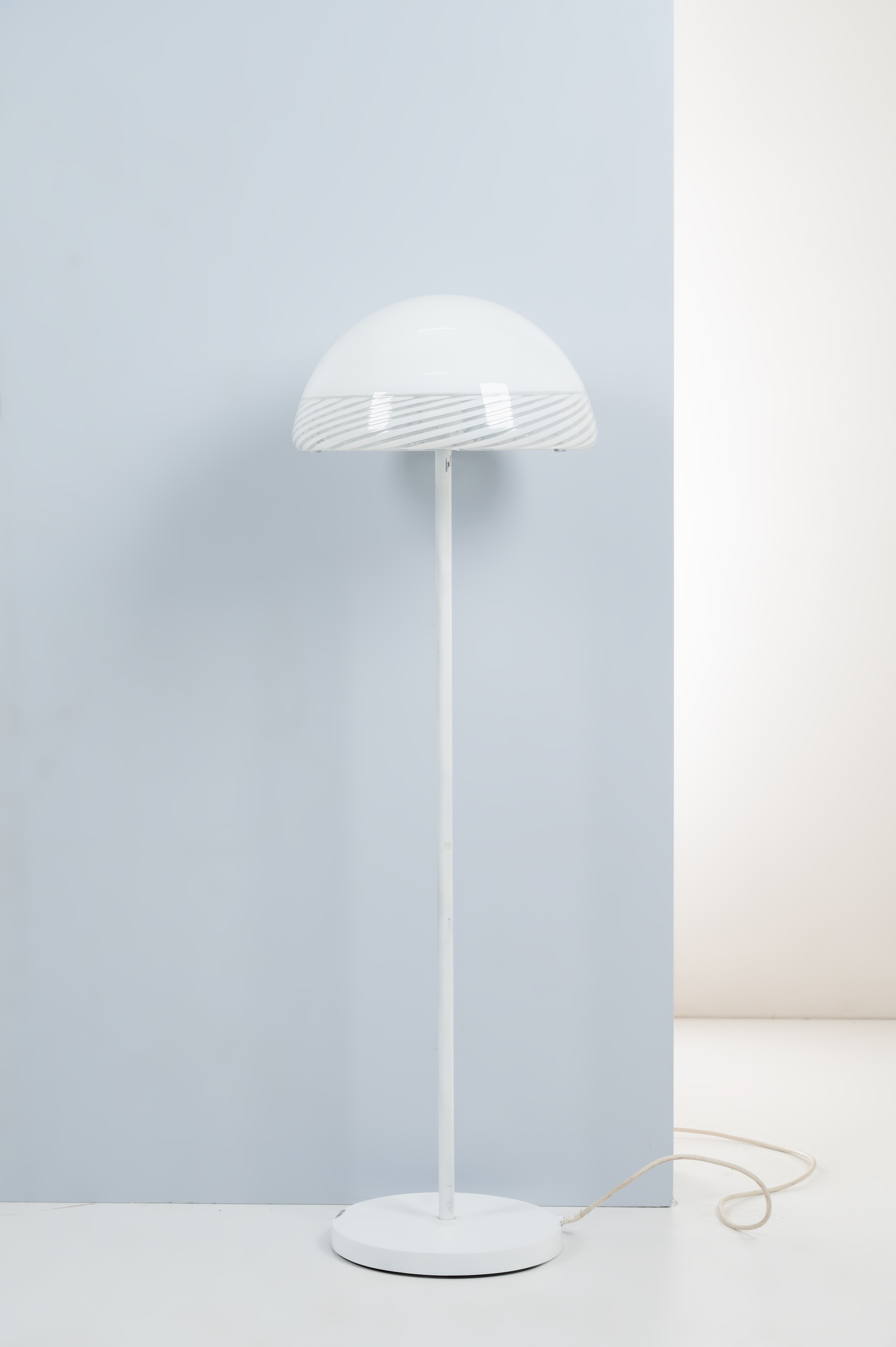 Lampada da terra con struttura in metallo verniciato bianco, diffusore semisferico in vetro lattimo parzialmente decorato in basso a mezza filigrana.
