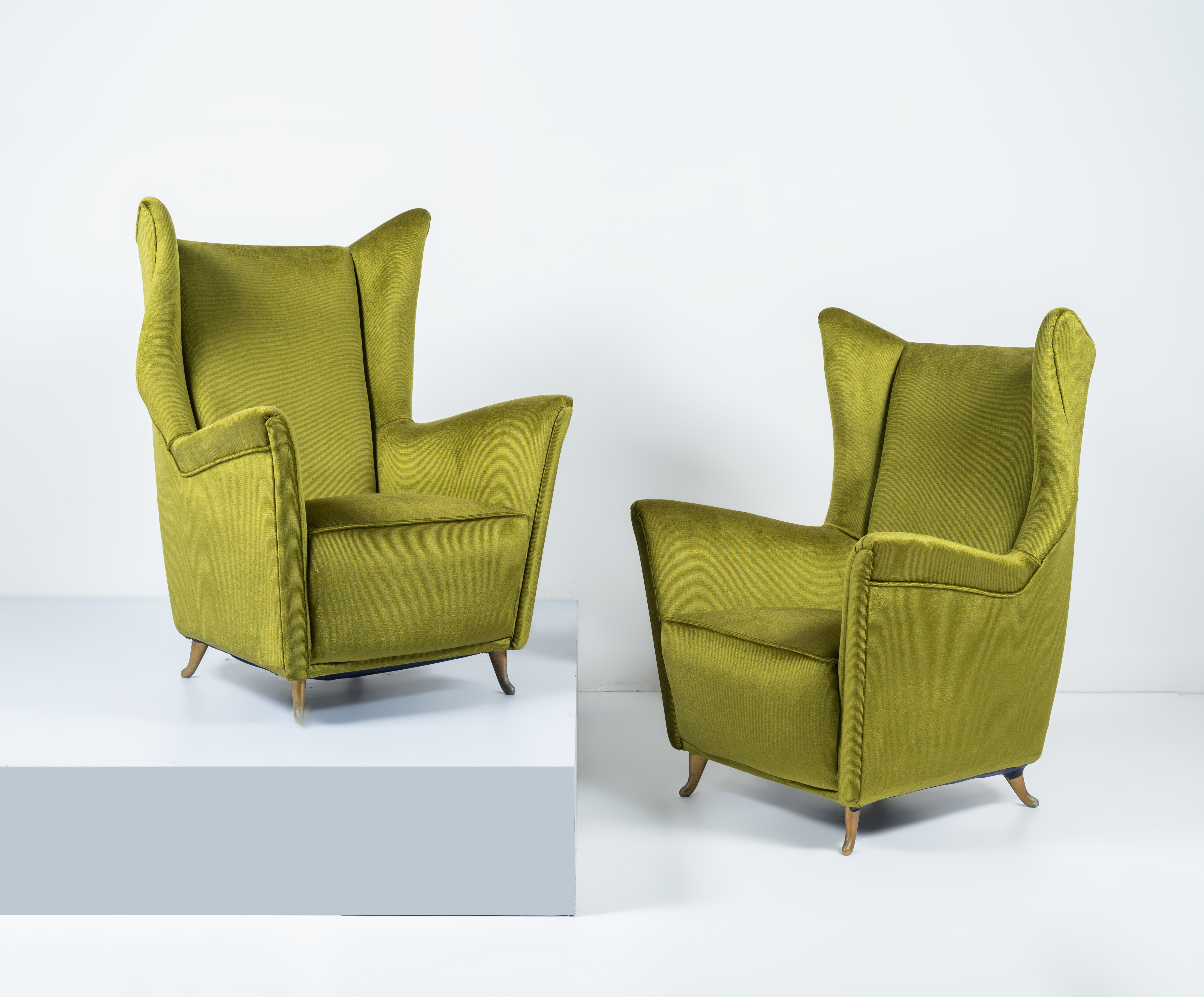 Coppia di poltrone con struttura in legno, imbottitura e rivestimento in velluto verde, piedi in metallo dorato.