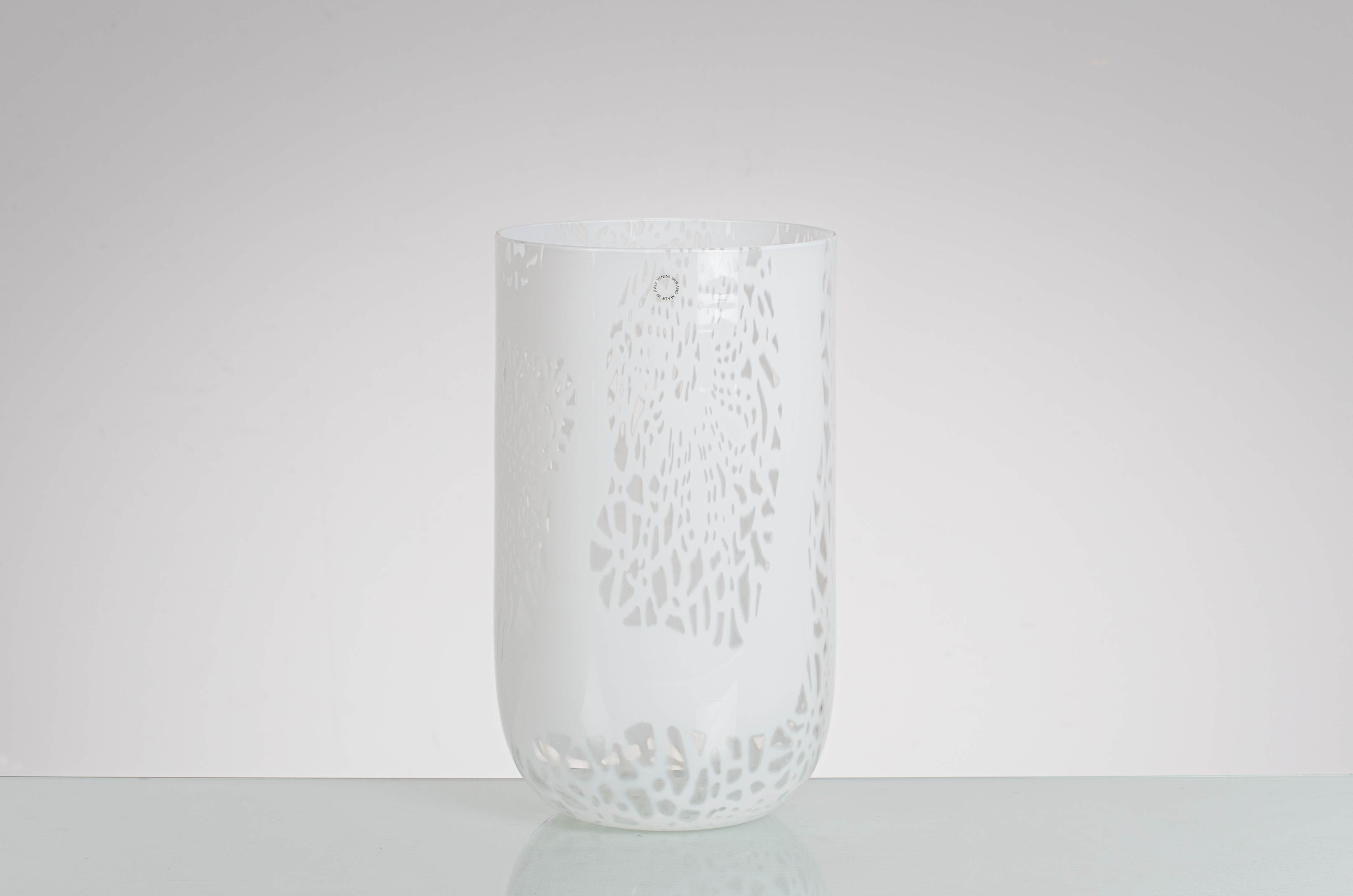 Vaso in vetro soffiato della serie "Merletti" con decori in vetro lattimo a disegni astratti traforati, corpo cilindrico con bocca piana circolare. Firma a graffio, data e vecchia etichetta.