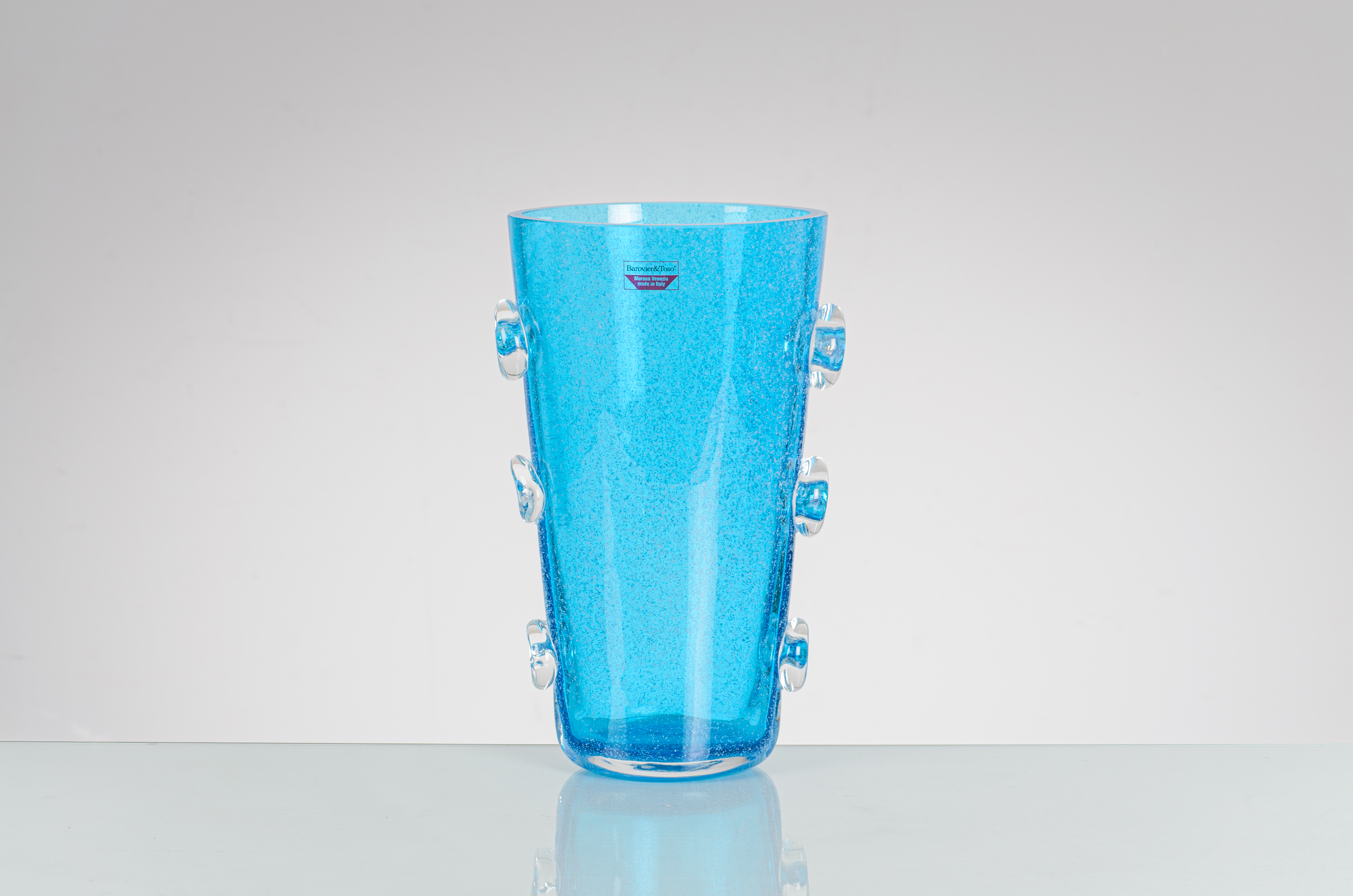 Vaso "Spuma di mare" in vetro azzurrino con decoro di anelli incolore ai lati, corpo a cono con bocca piana. Etichetta e marca incisa "Barovier e Toso Murano".