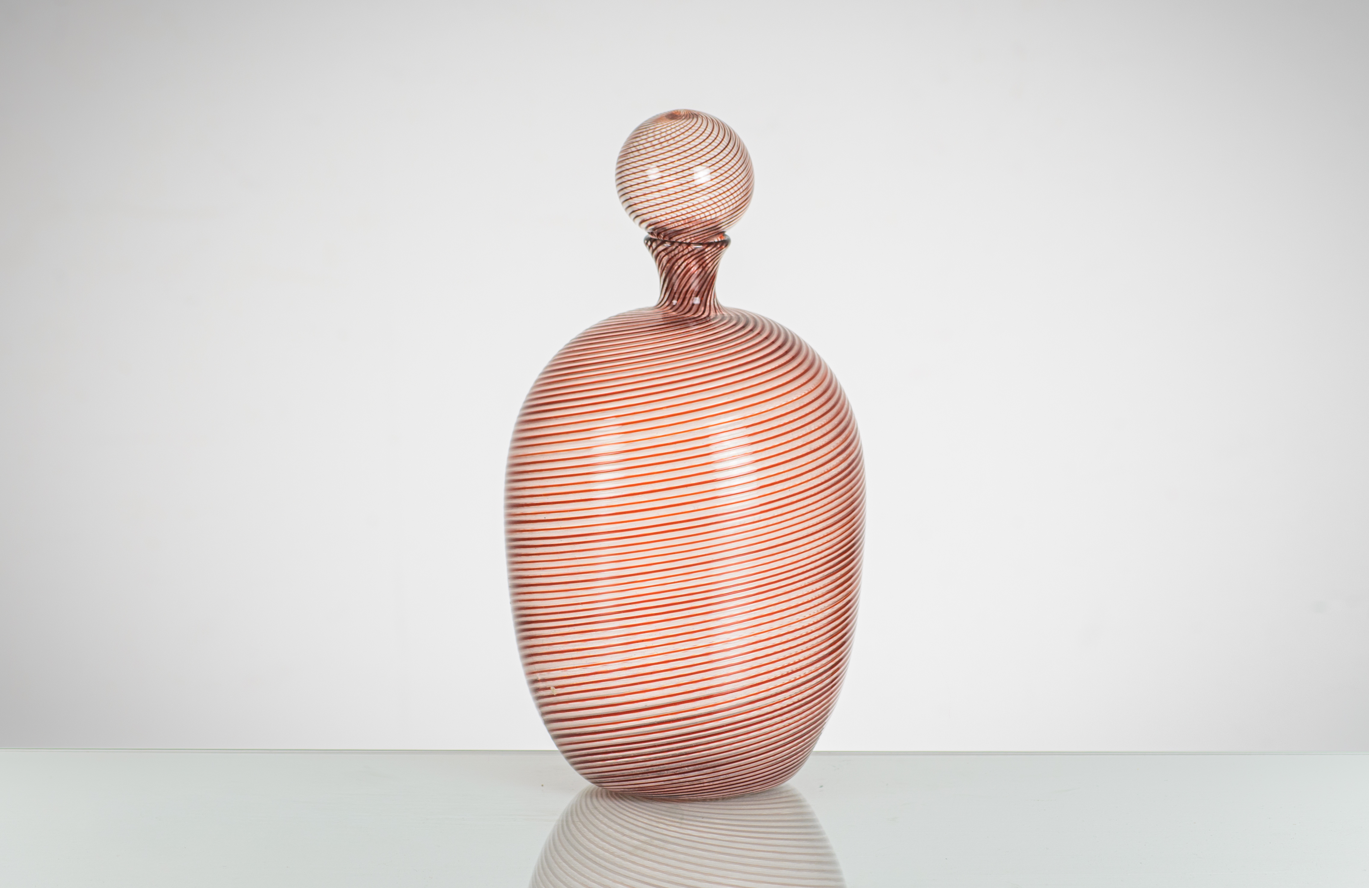 Bottiglia con tappo in vetro soffiato incolore e decorato con mezza filigrana seppia, corpo ad oliva con piccolo e basso collo a vaso, tappo sferico.