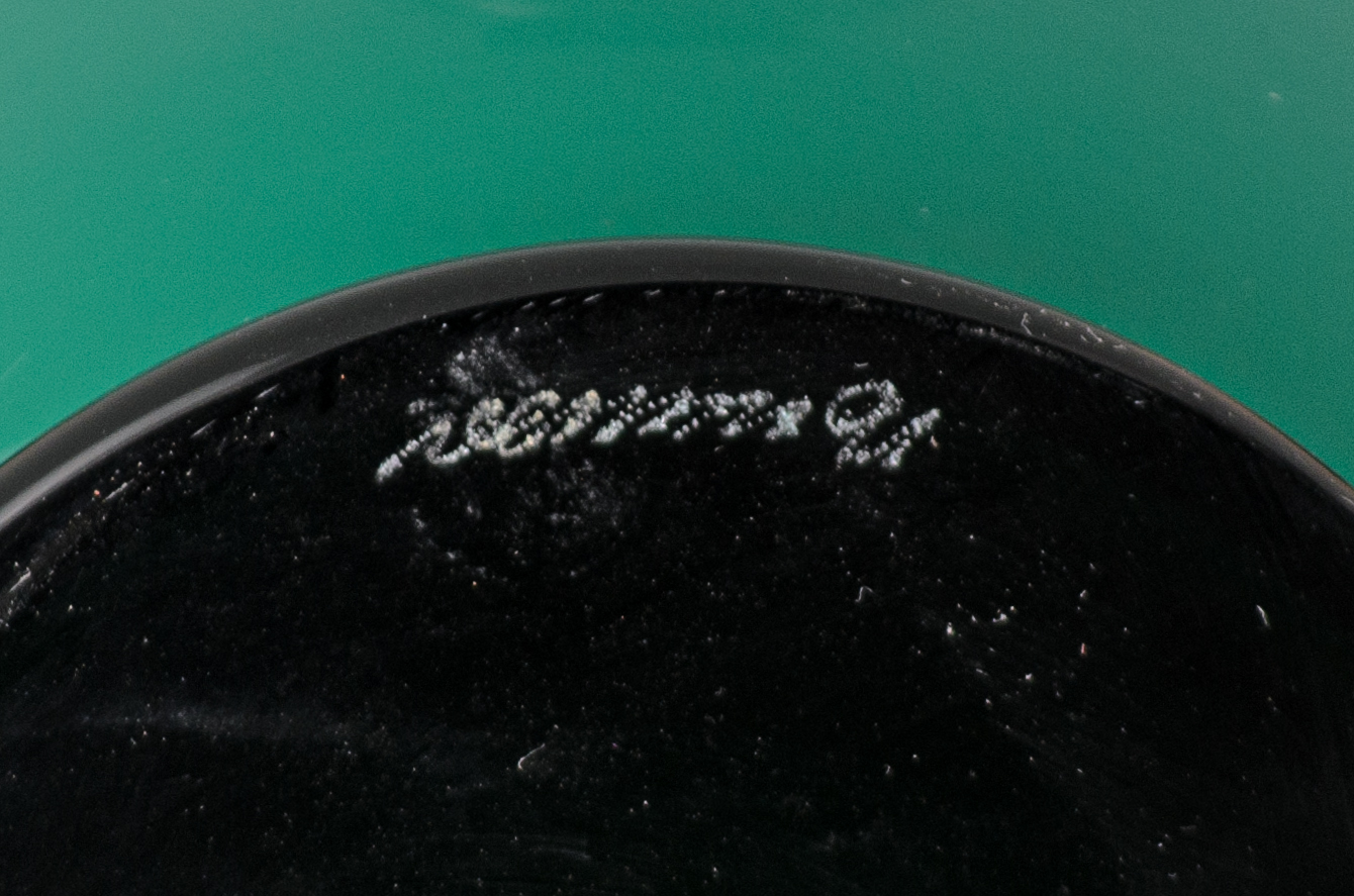 Coppa della serie “Anni Trenta” in vetro opalino verde con base circolare nera. Etichetta, firma e data a graffio.