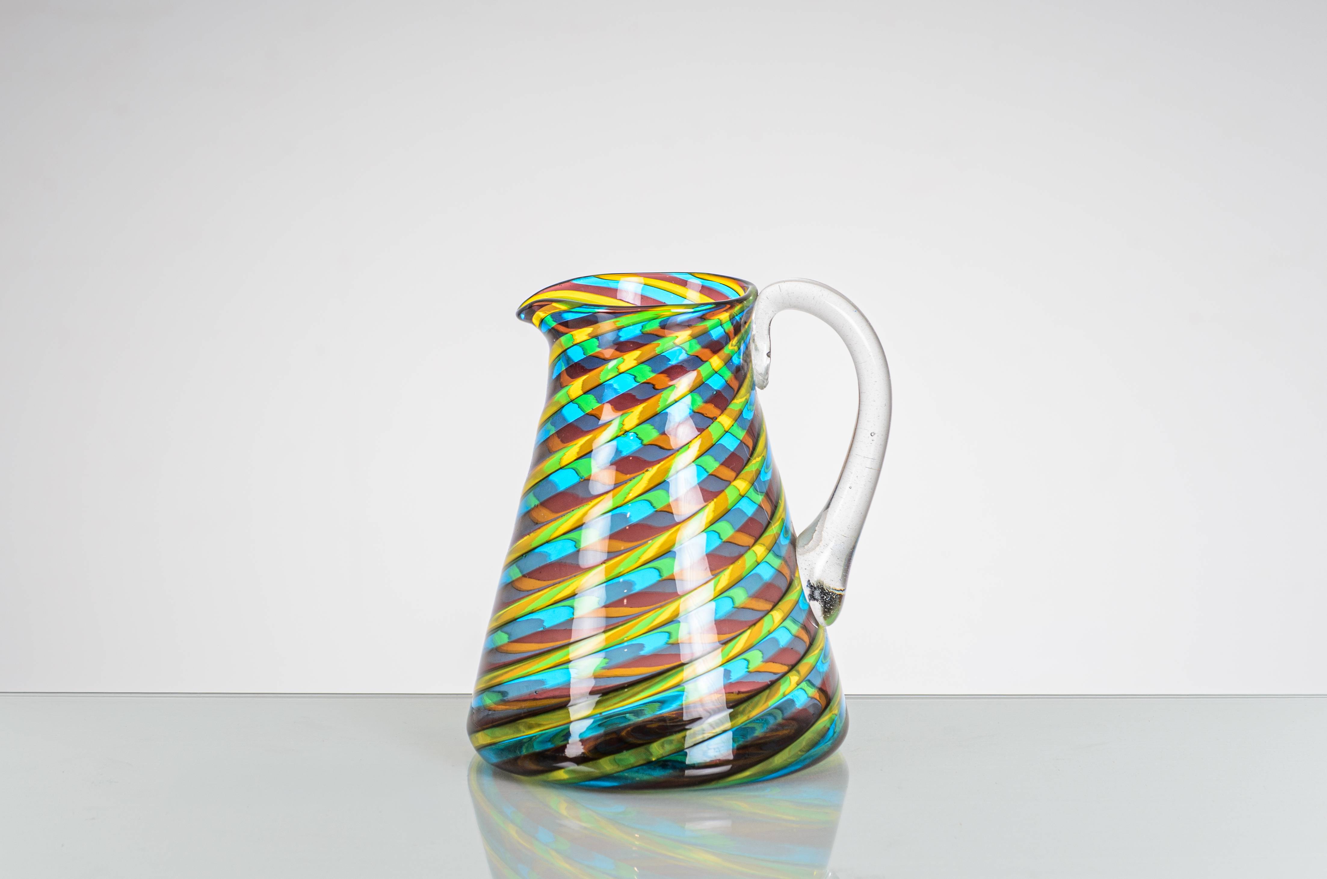 Caraffa in vetro soffiato e decorata con canne gialle, blu e seppia. Manico in vetro incolore. Etichetta di produzione
