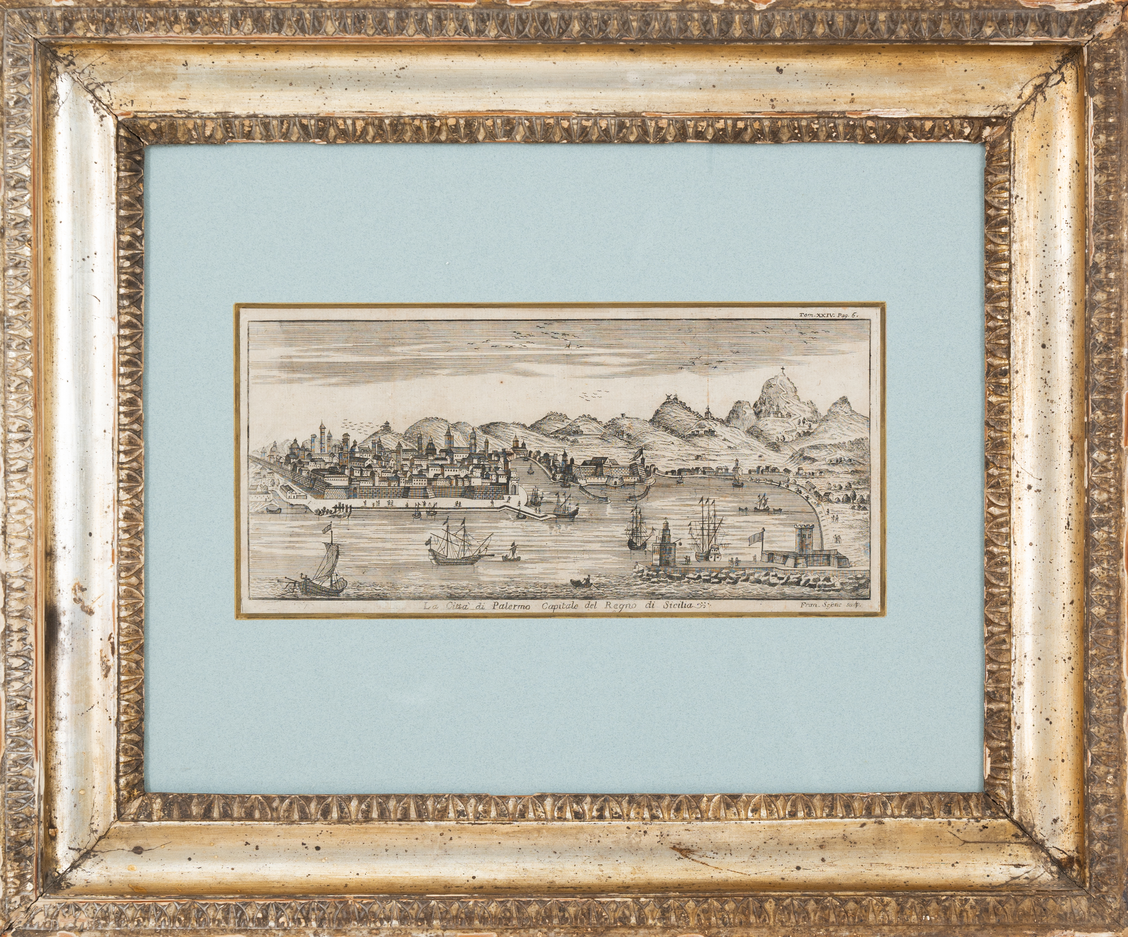 Incisione raffigurante "La città di Palermo capitale del Regno di Sicilia", entro cornice a canna ciaccata in legno dorato ad argento e mistura.