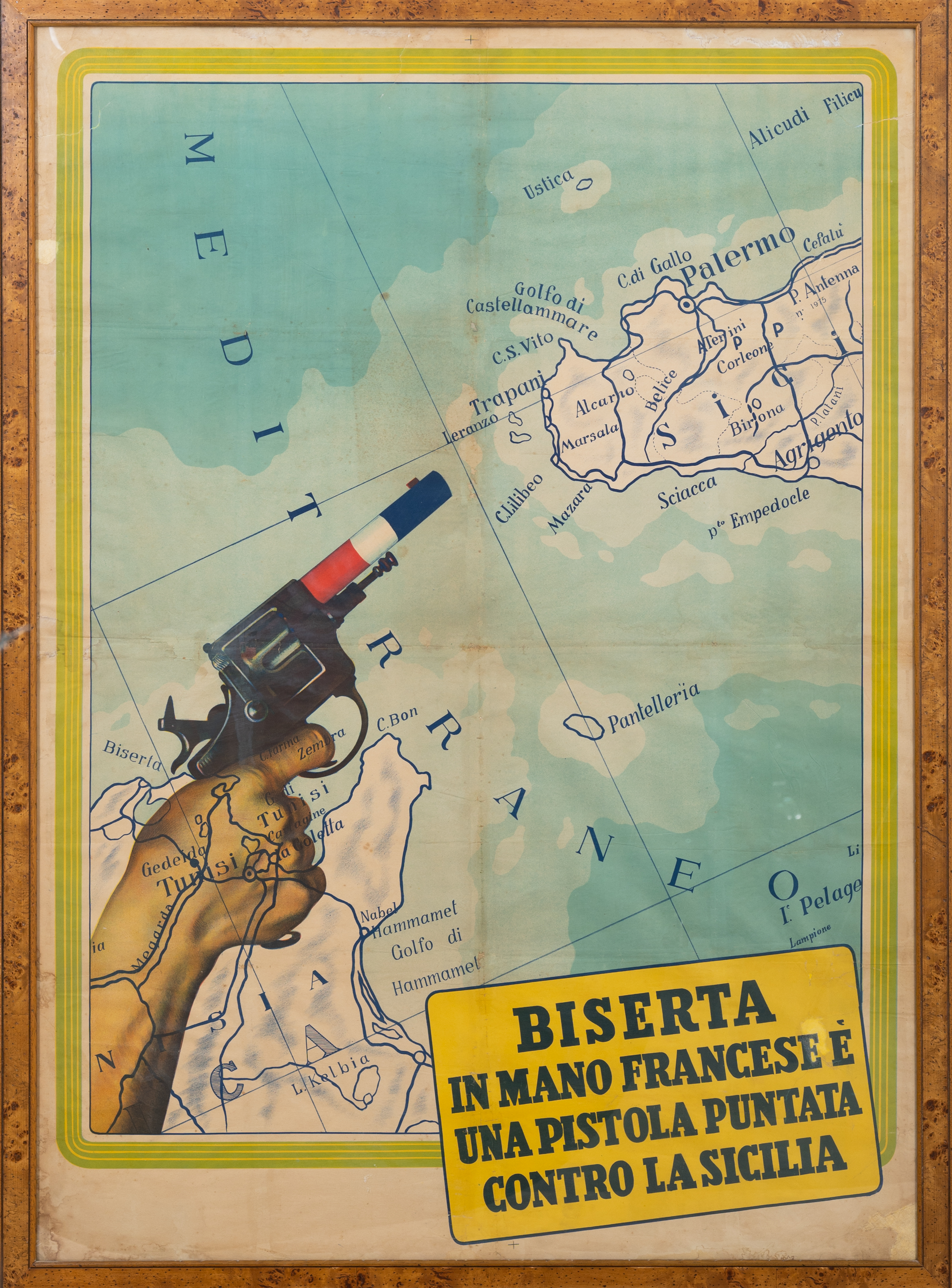 Stampa a colori del periodo coloniale Italiano raffigurante "Africa del Nord, Sicilia occidentale e Mar Mediterraneo".