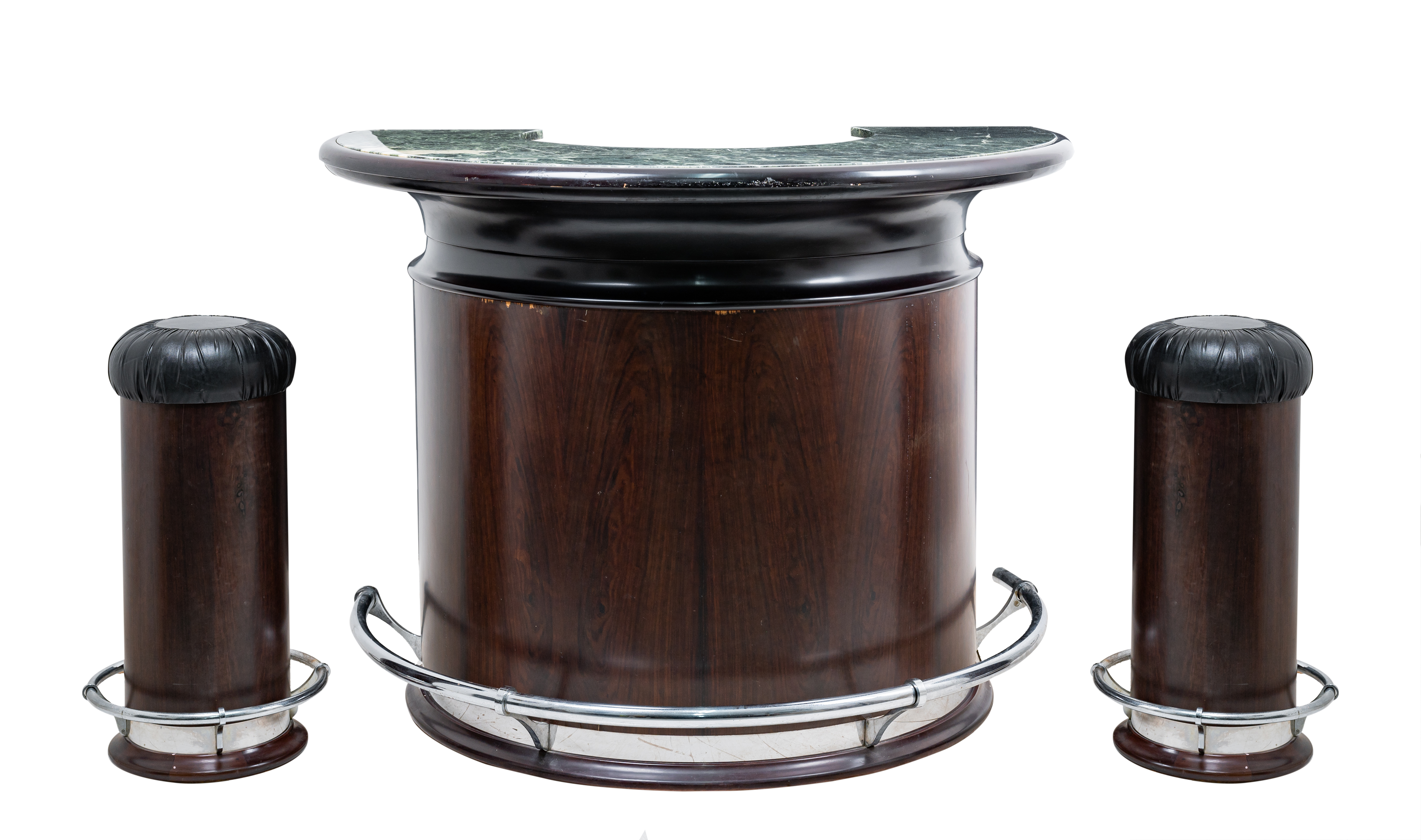 Mobile bar a mezza luna con struttura in legno, poggiapiedi in acciaio, piano laccato a finto marmo tipologia verde delle Alpi con due sgabelli con seduta in pelle ed etagere in acciaio a cinque ripiani in vetro fumè e porta calici (usure).
