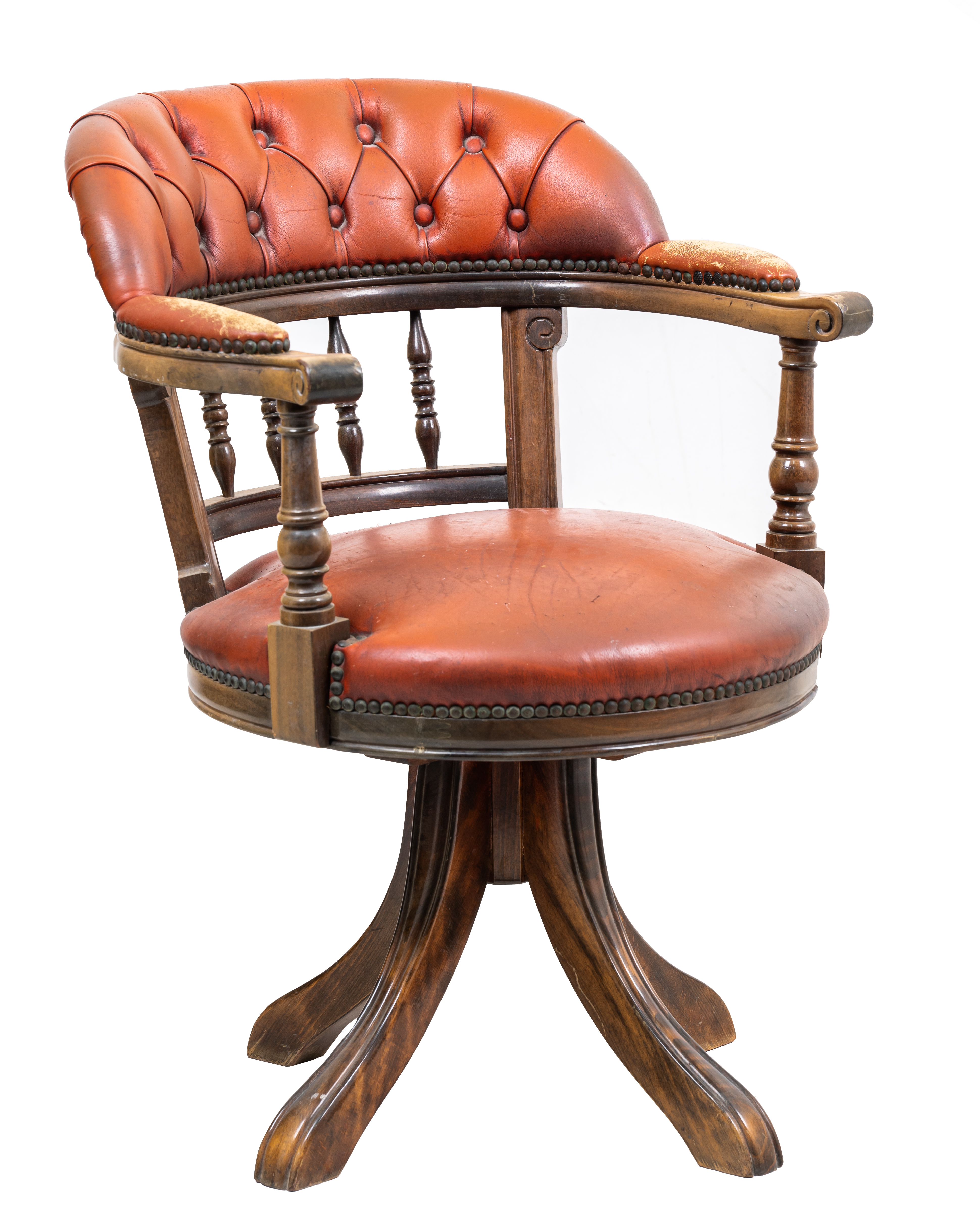 Poltrona girevole da studio di gusto navale in legno di mogano, seduta e spalliera in pelle.