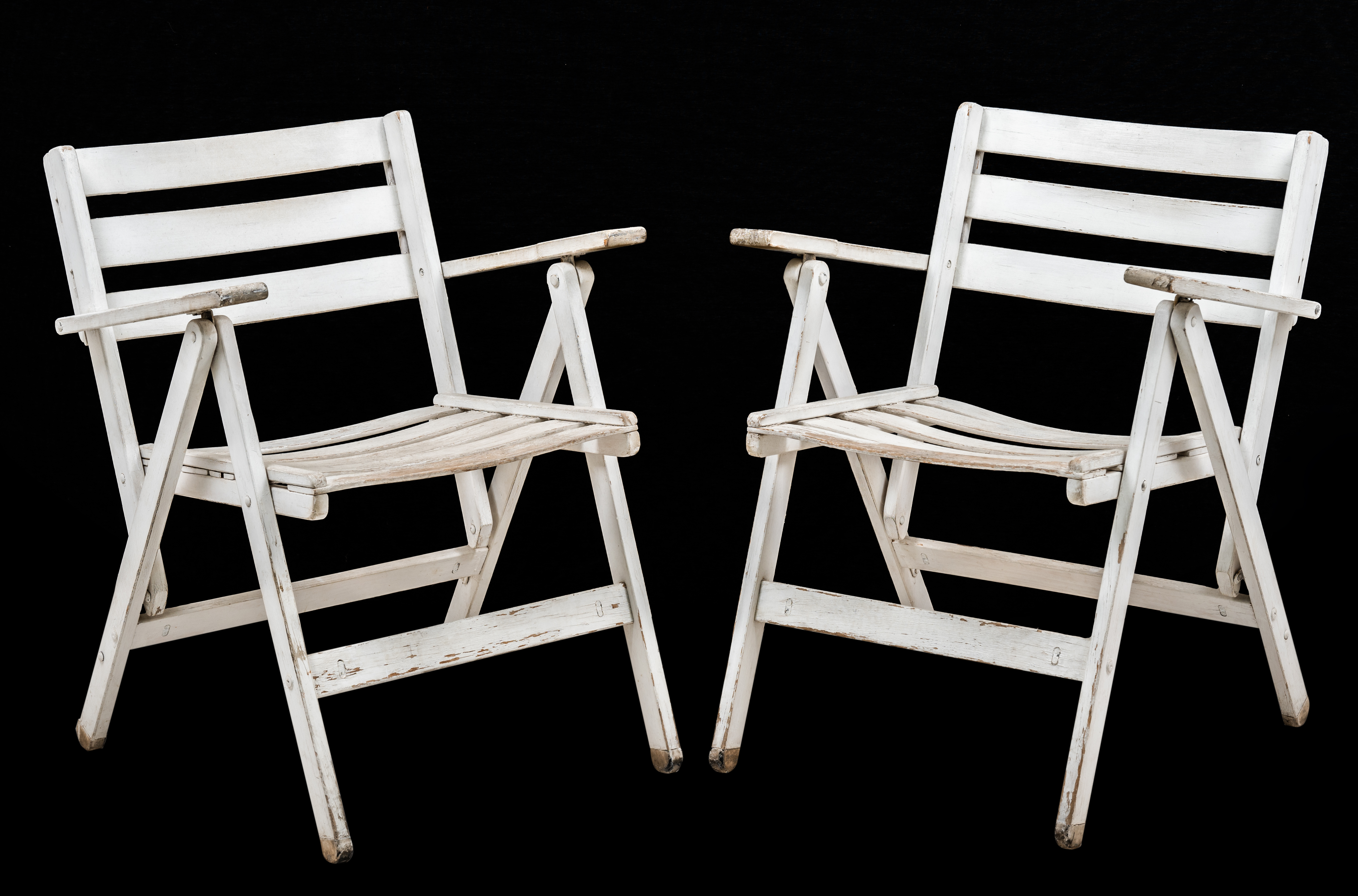 Coppia di poltrone pieghevoli in legno laccato bianco (usure).