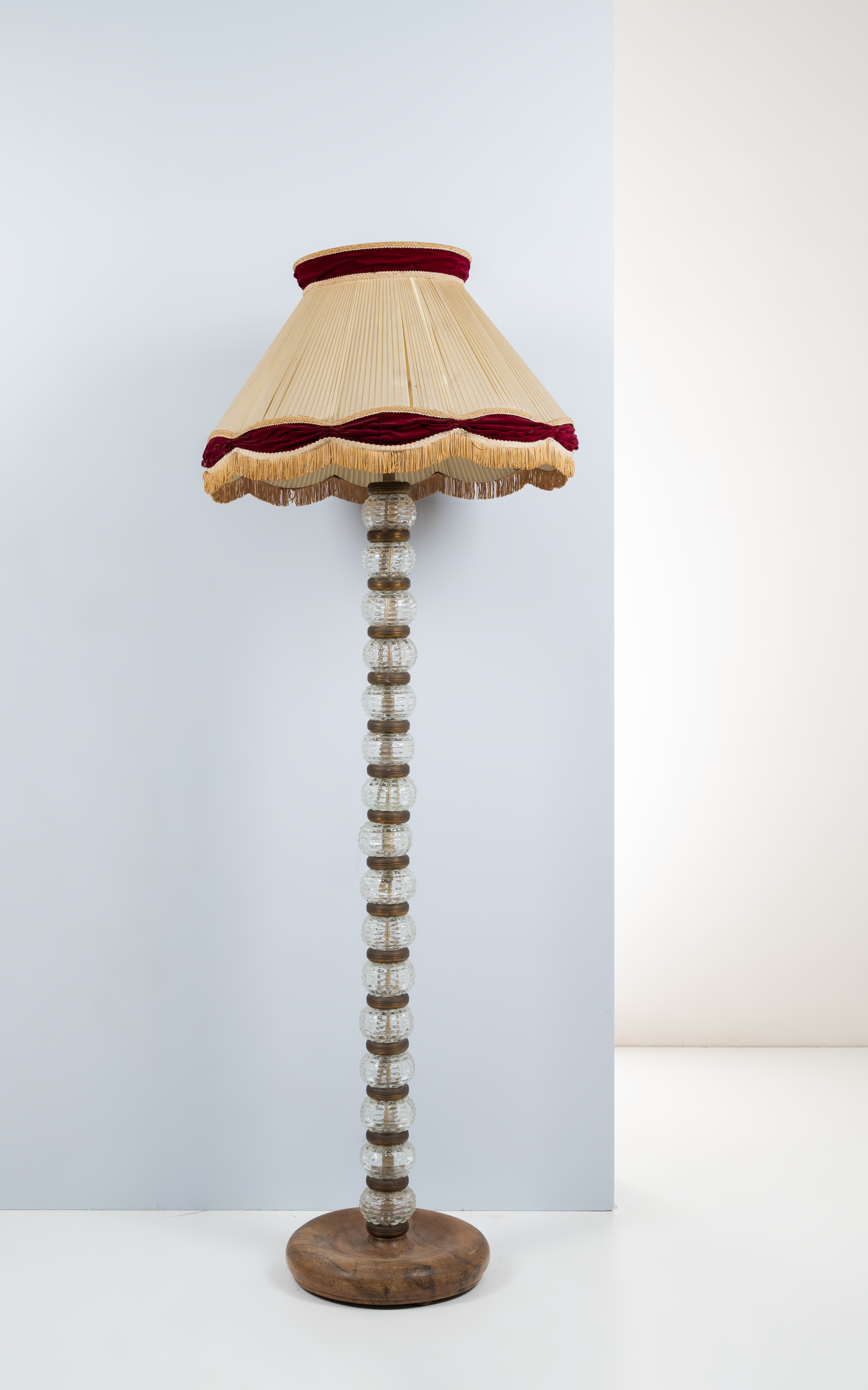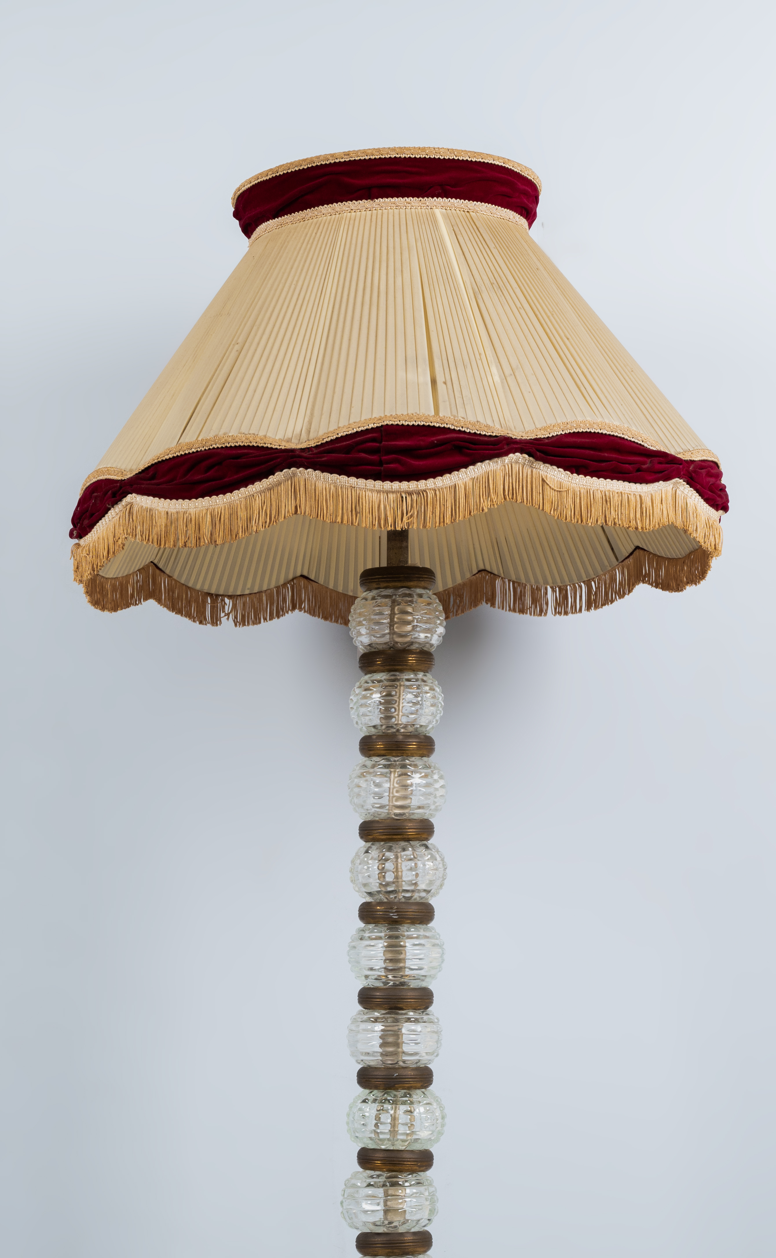 Lampada da terra a due luci, struttura in ottone, fusto con sfere schiacciate in vetro incolore a barilotti, intermezzi in metallo dorato, base circolare in legno tornito. Diffusore in tessuto avorio e bordeaux. Segni di uso.