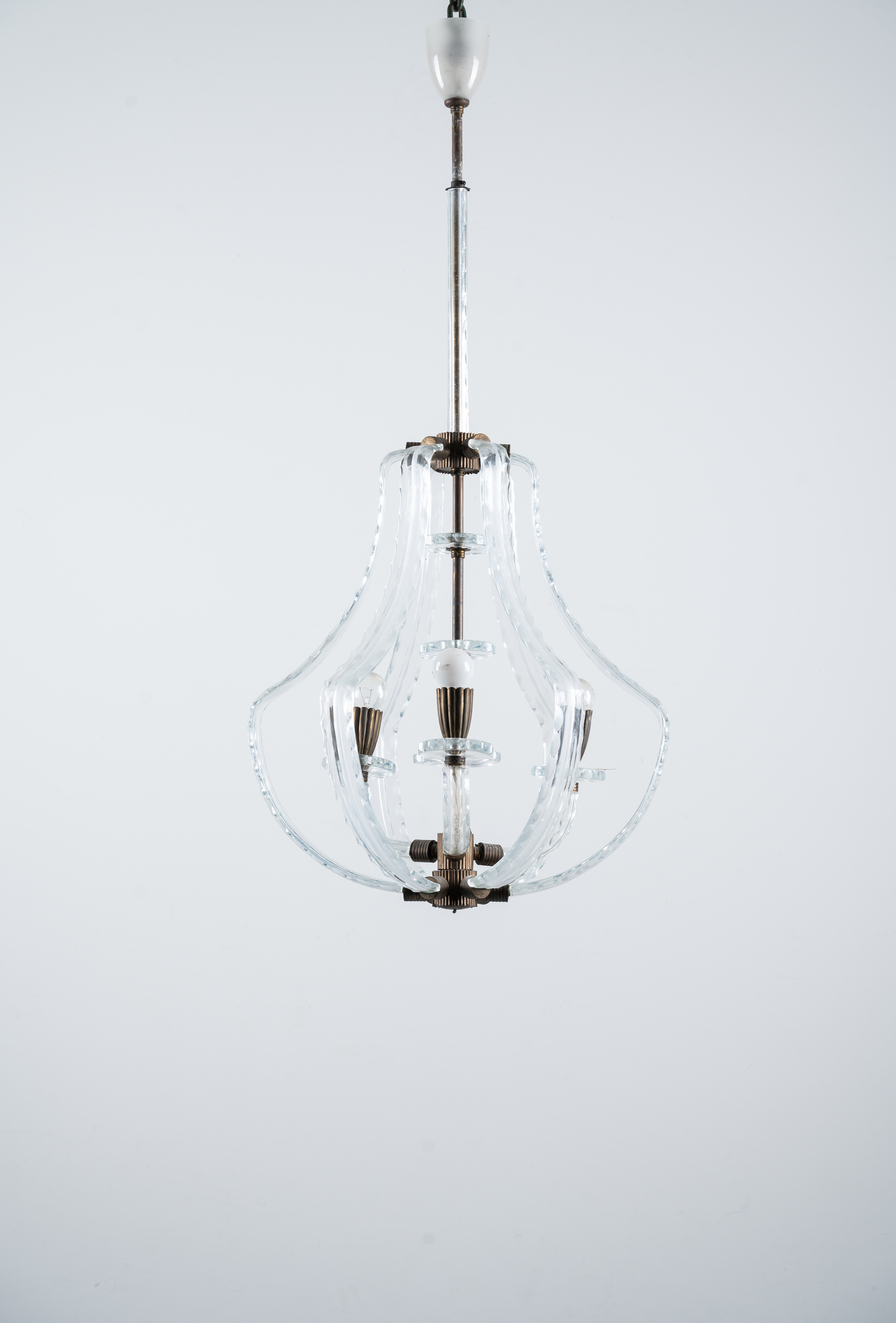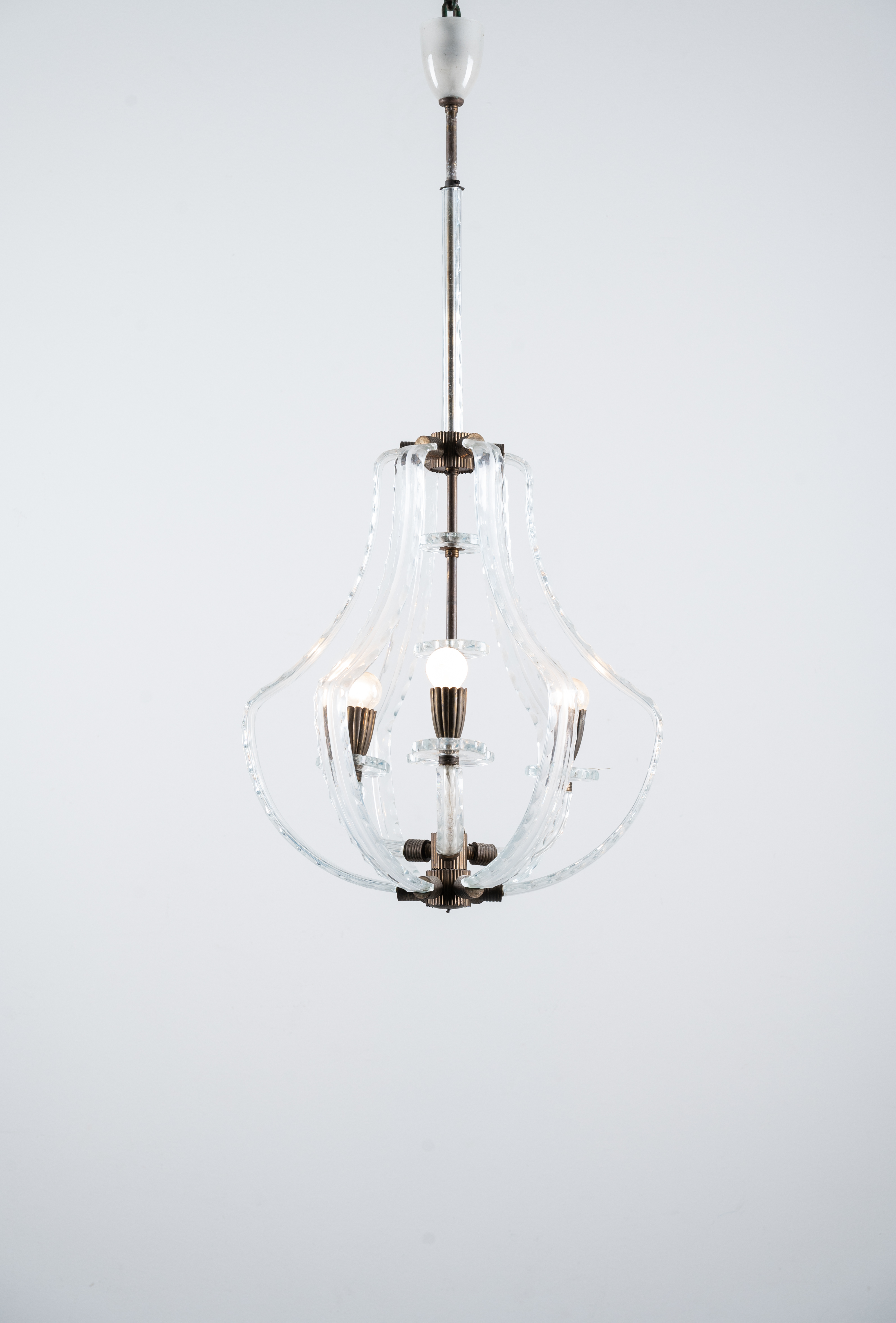 Lampada a sospensione a tre luci, struttura in ottone, diffusore in vetro incolore sagomato e molato.