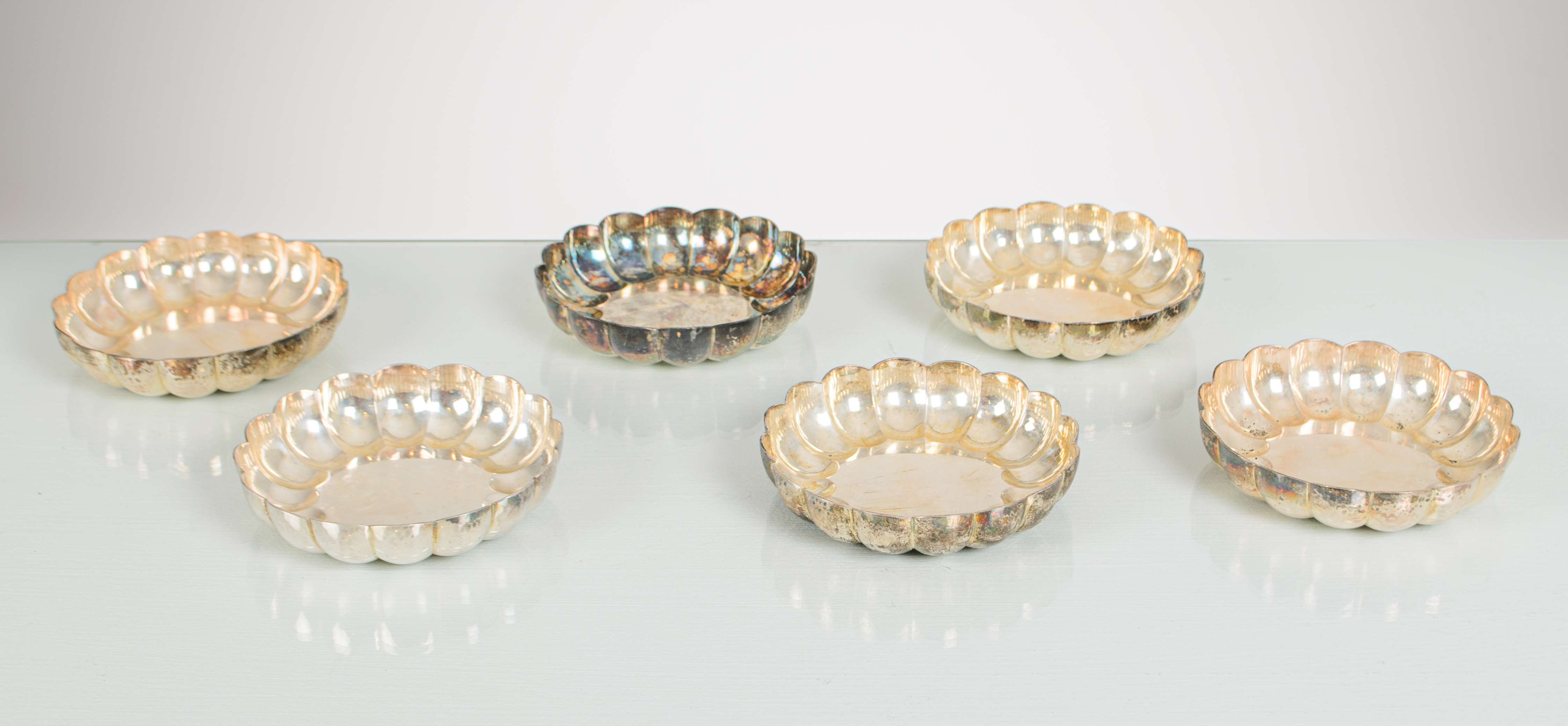 Sei coppe in argento 950, corpo circolare con lavorazione a costole, bordo ondulato. Peso g. 1078. Marchio e titolo argento incusso.