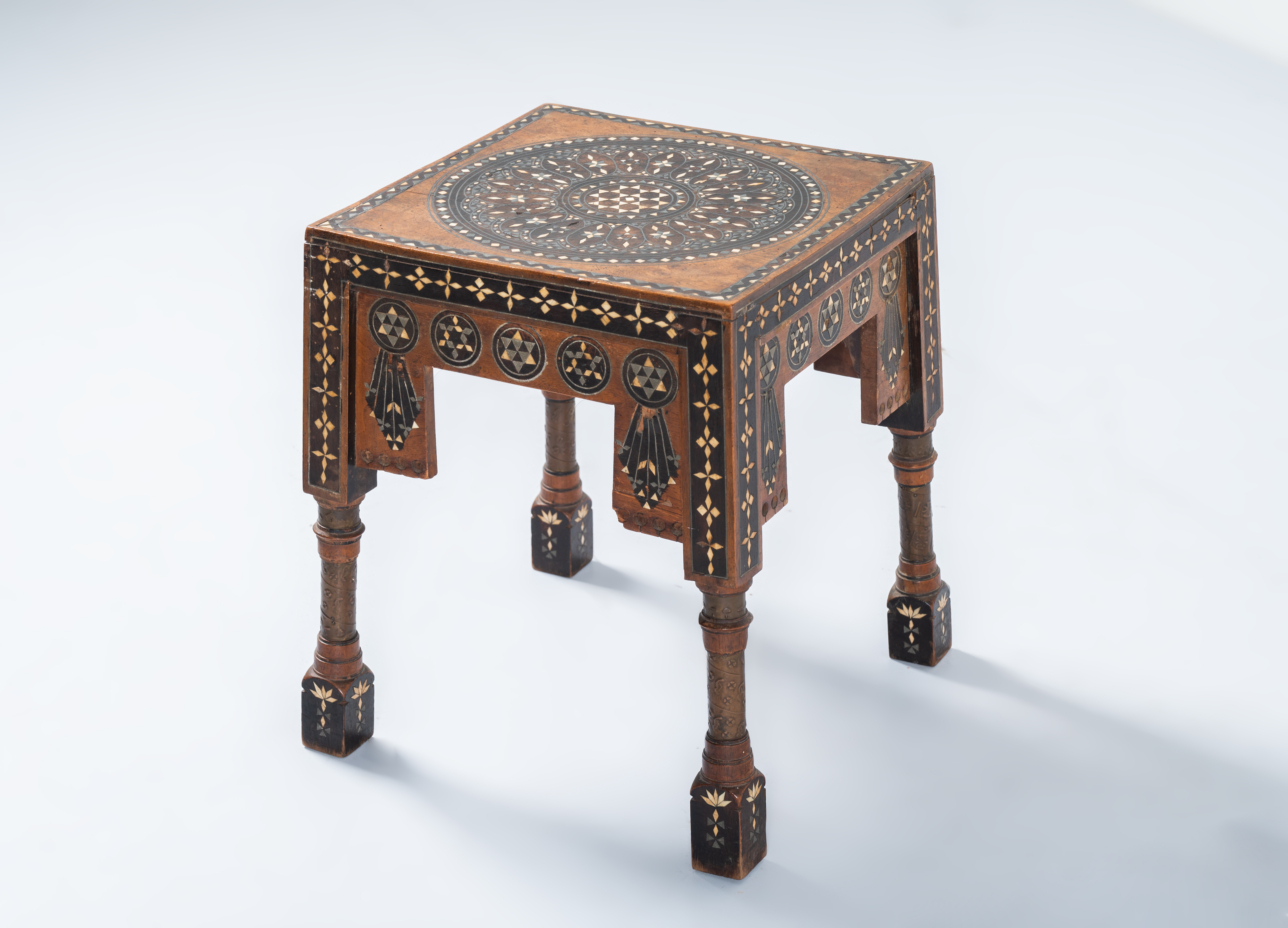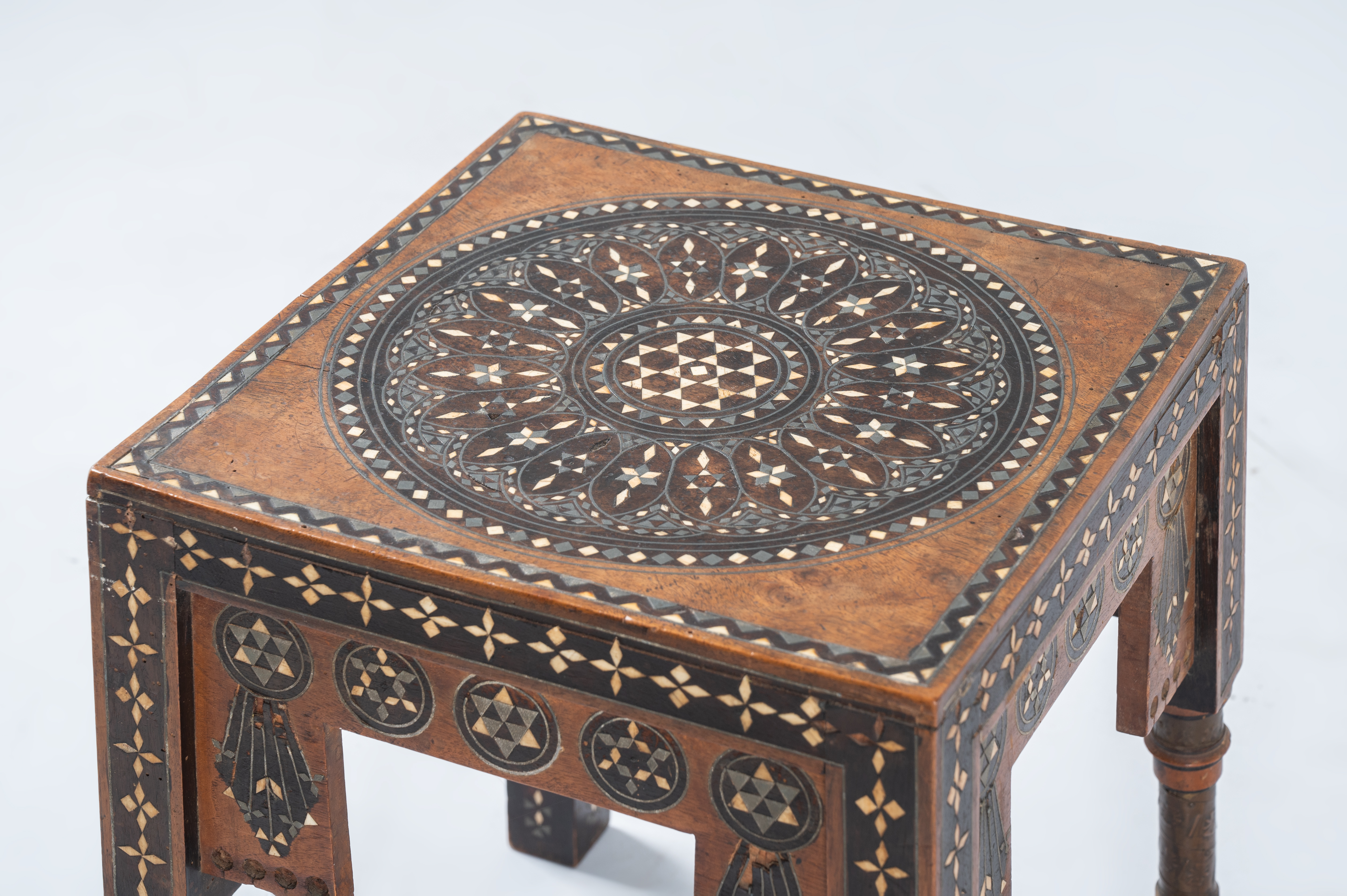Un tavolo basso in legno decorato con tarsie di materiali differenti, piano quadrato, gambe tornite. Mancanze.