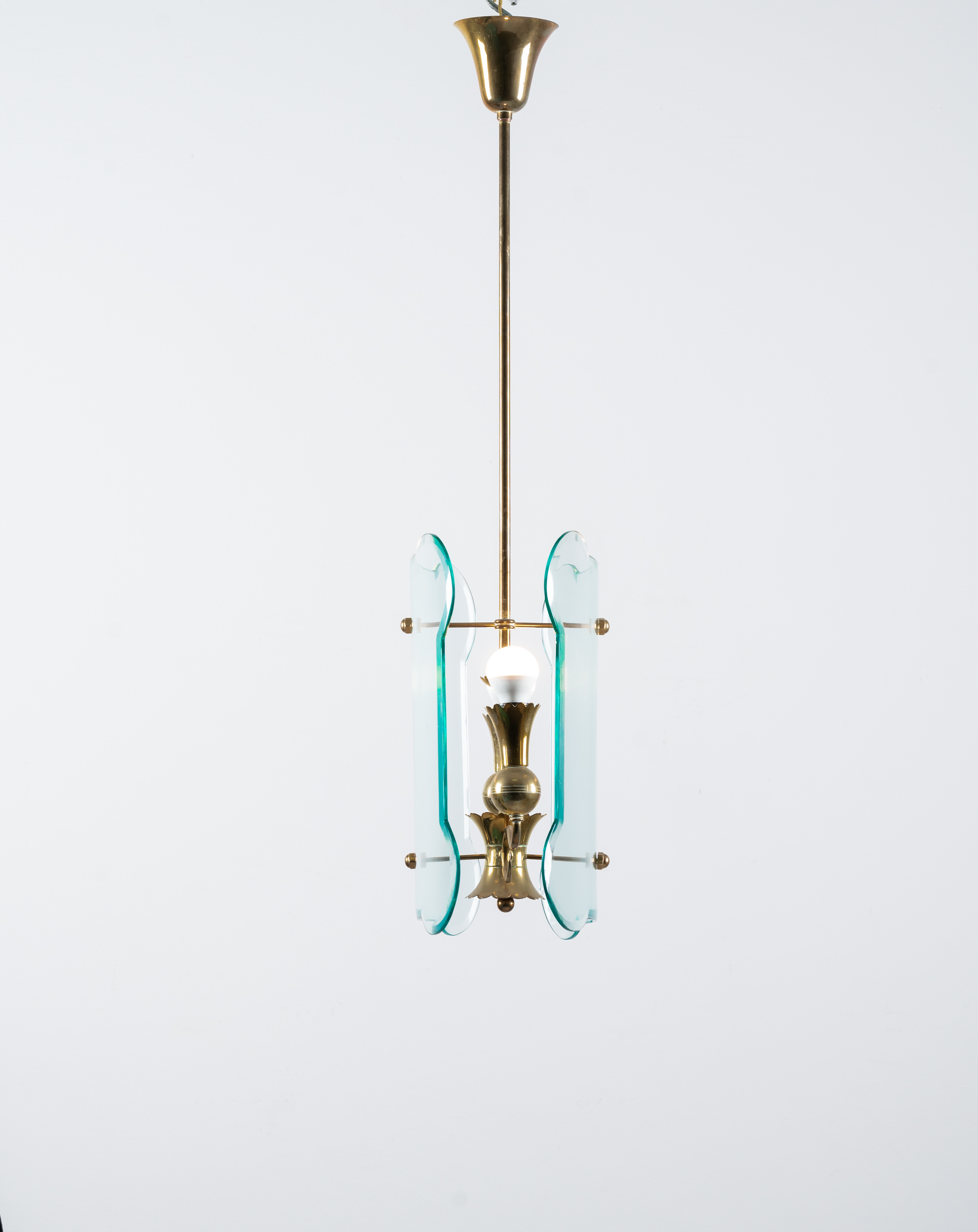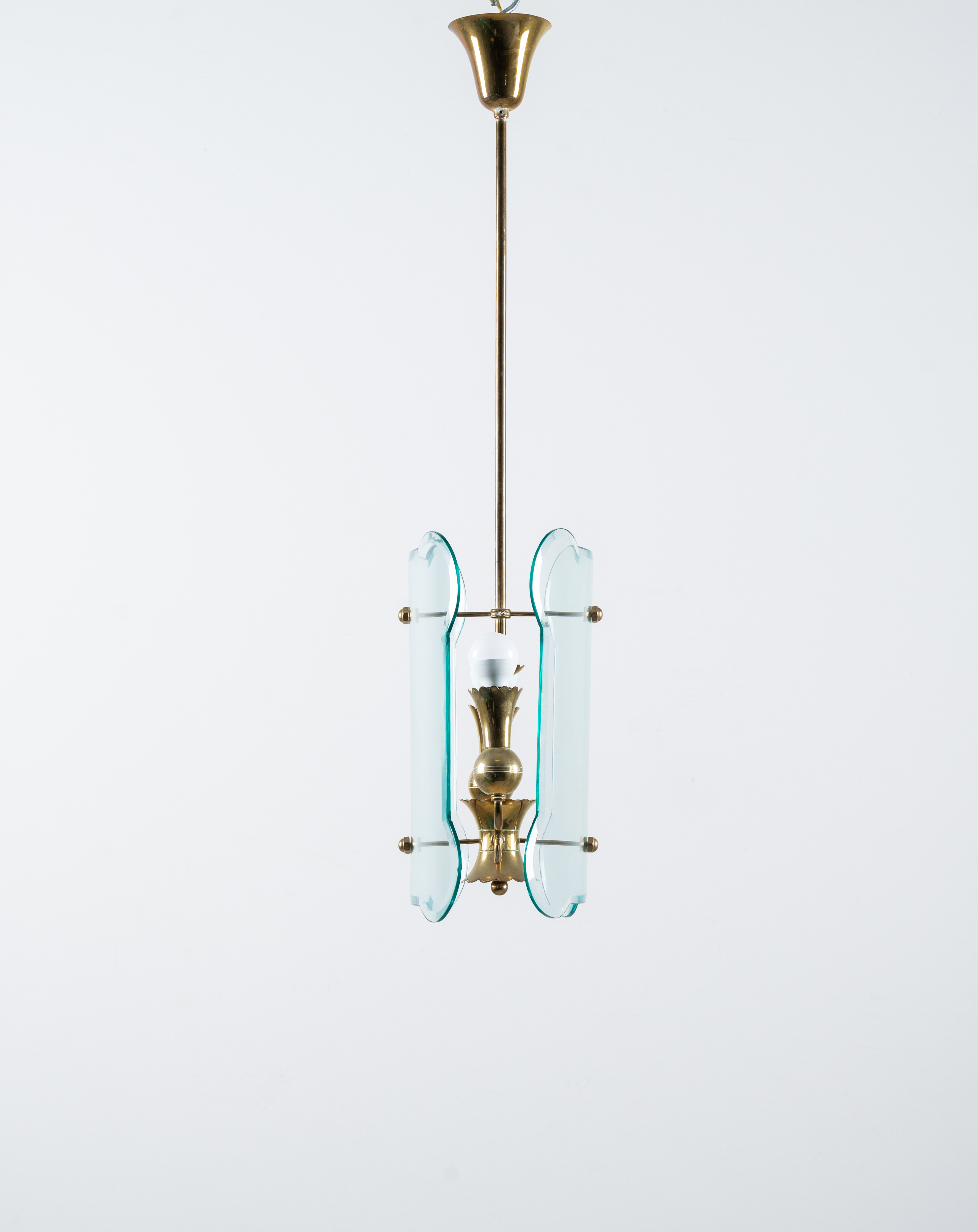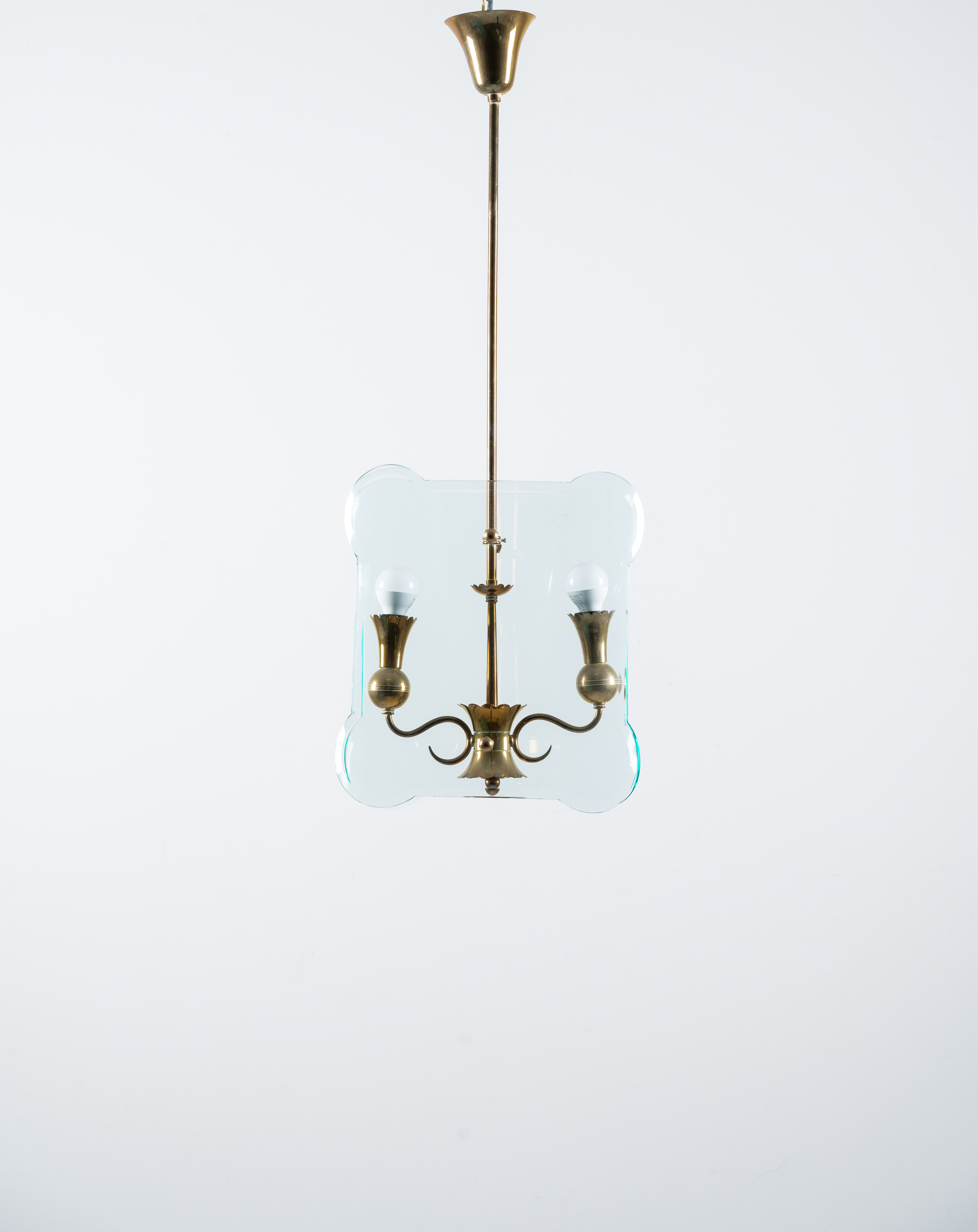 Lampada a sospensione a due luci, struttura in ottone con diffusore composto da due lastre sagomate in cristallo incolore.