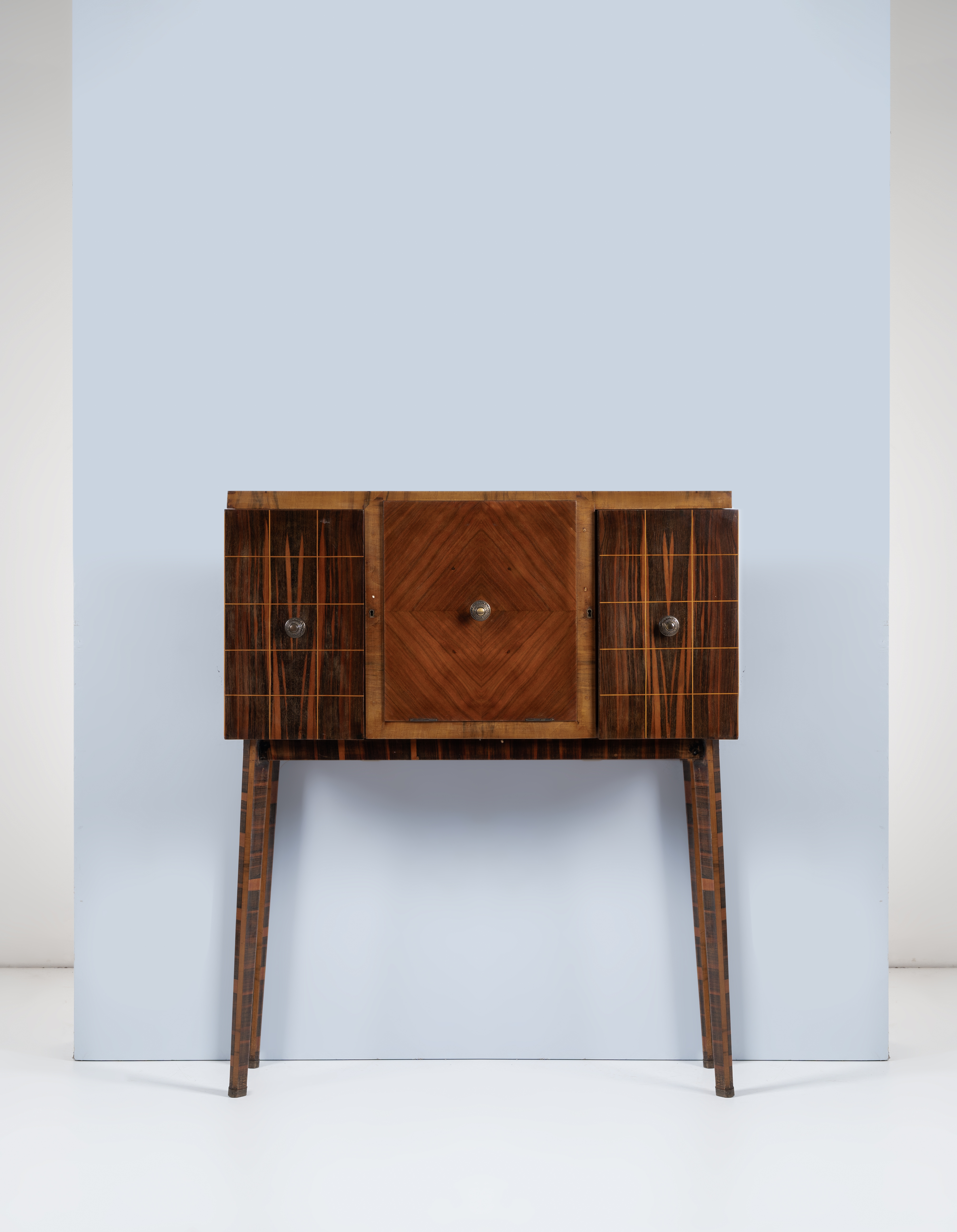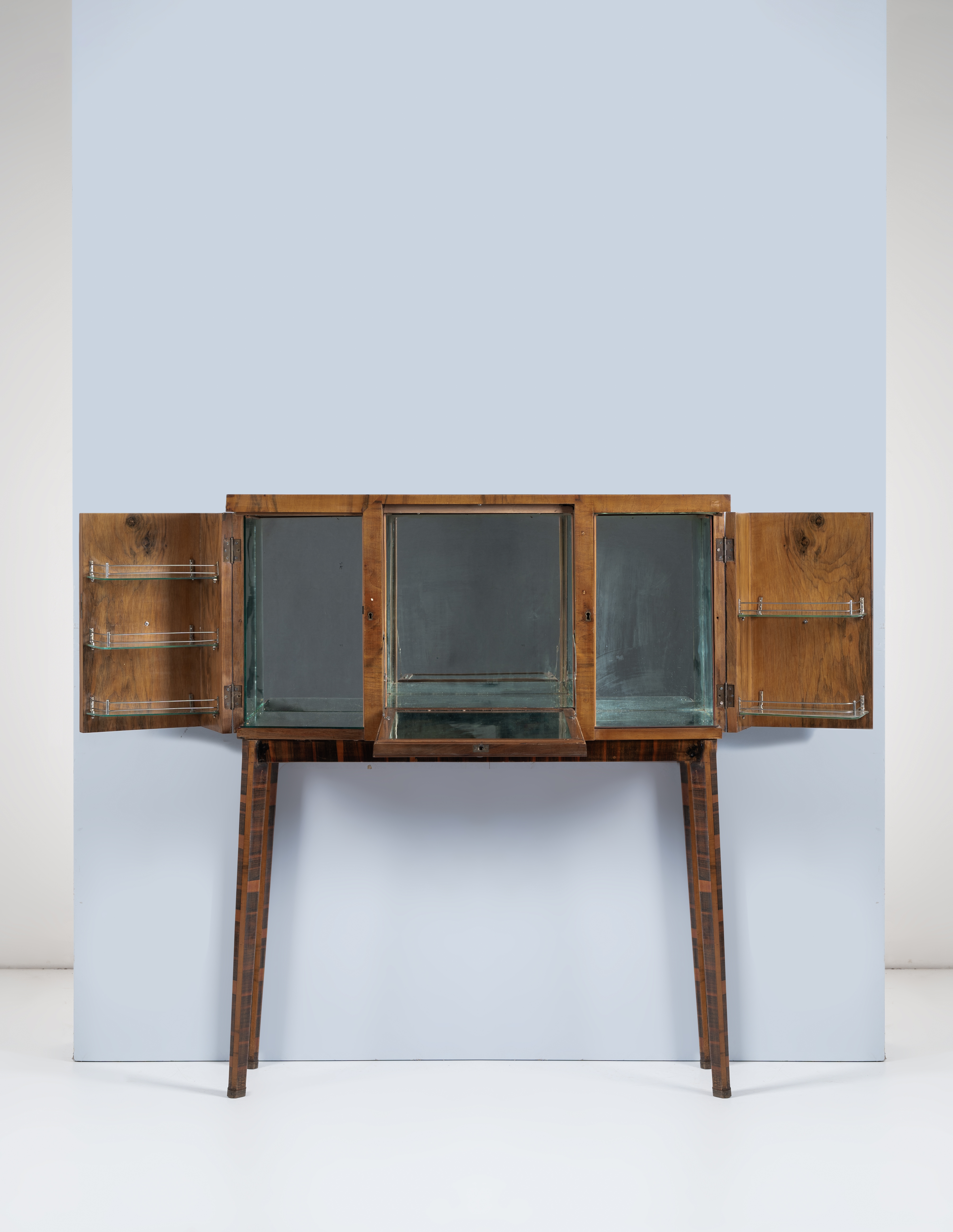 Mobile bar con struttura in legno di diverse essenze, sul fronte un vano a ribalta con interno specchiato, due vani laterali con apertura angolare a battente, vano specchiato, mensole in vetro e ottone. Maniglie e scarpette in ottone.