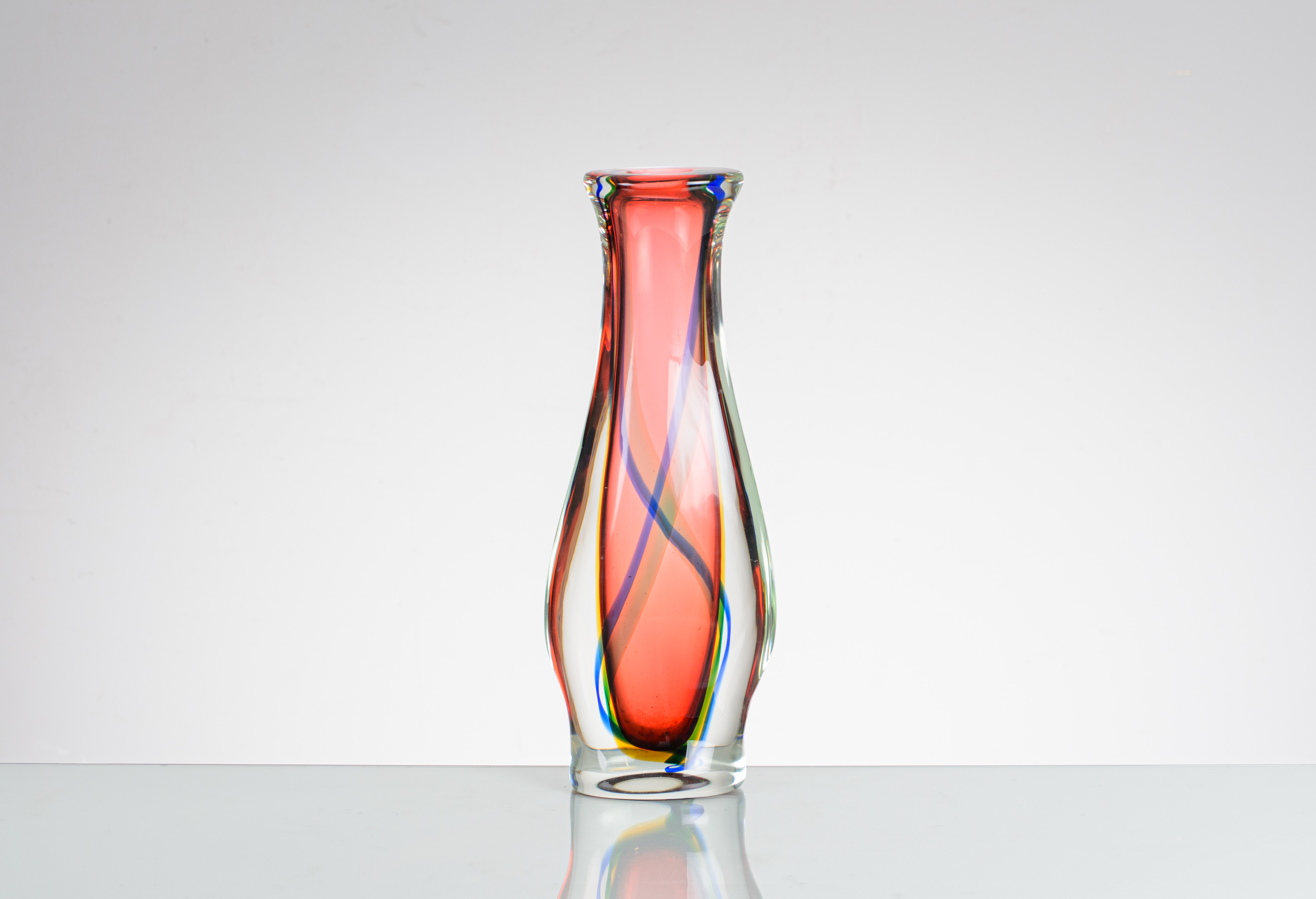 Vaso in vetro sommerso rosso giallo, verde e blu, corpo a goccia con bocca ovalizzata.