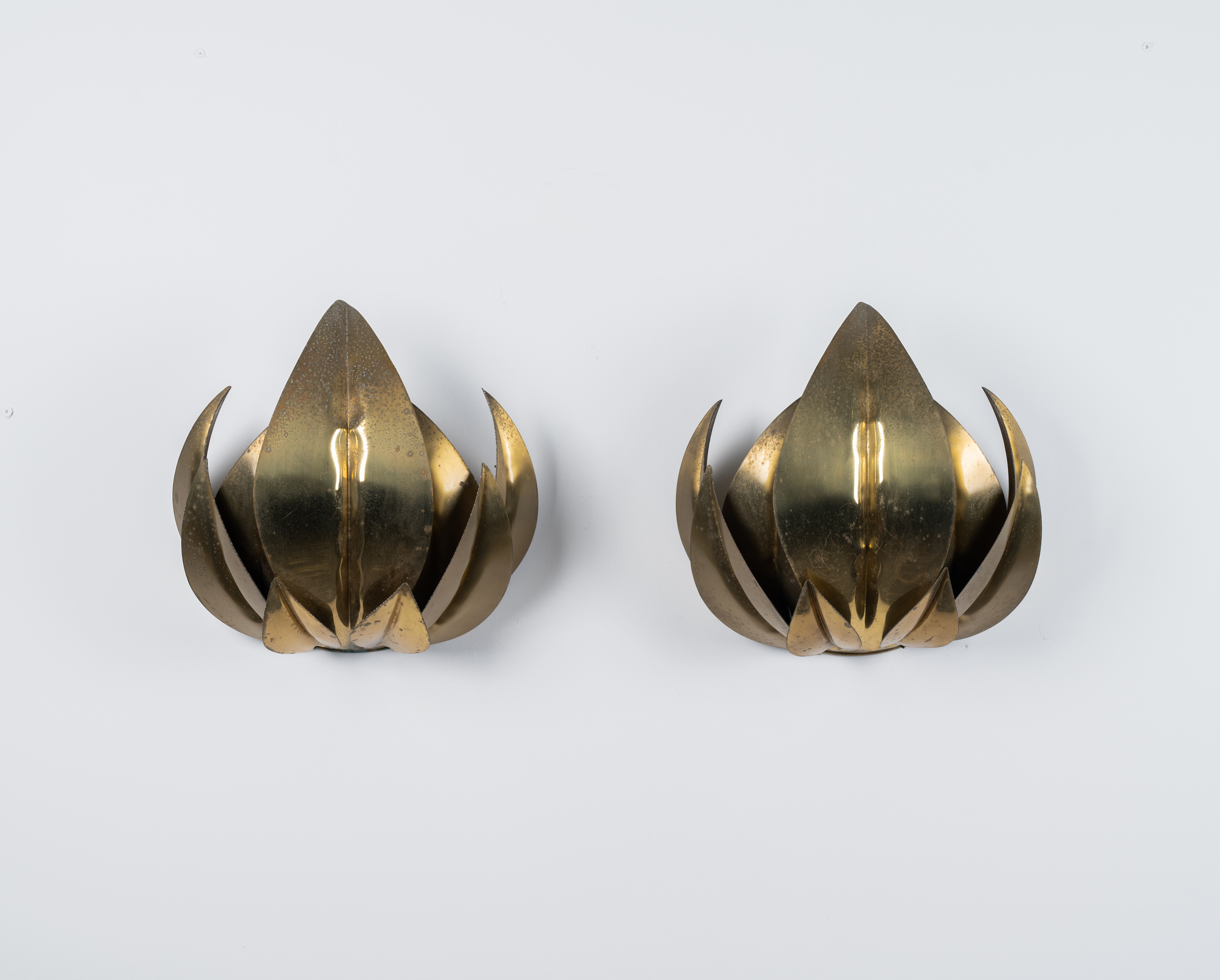 Coppia di lampade da parete ad una luce modello “Fiore di loto” diffusore a petali in ottone. Impianto elettrico assente e da rifare. Lievi ossidazioni.