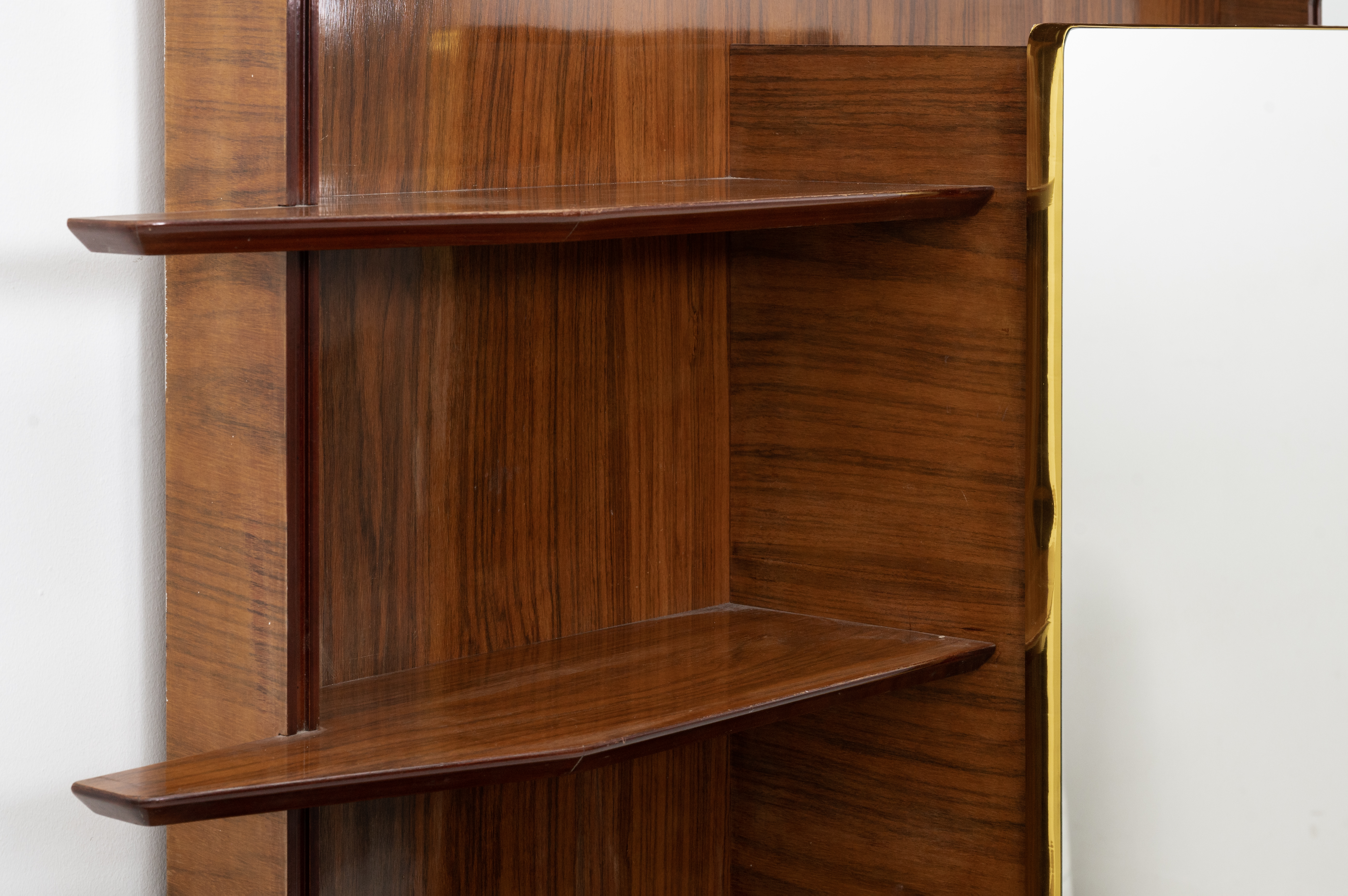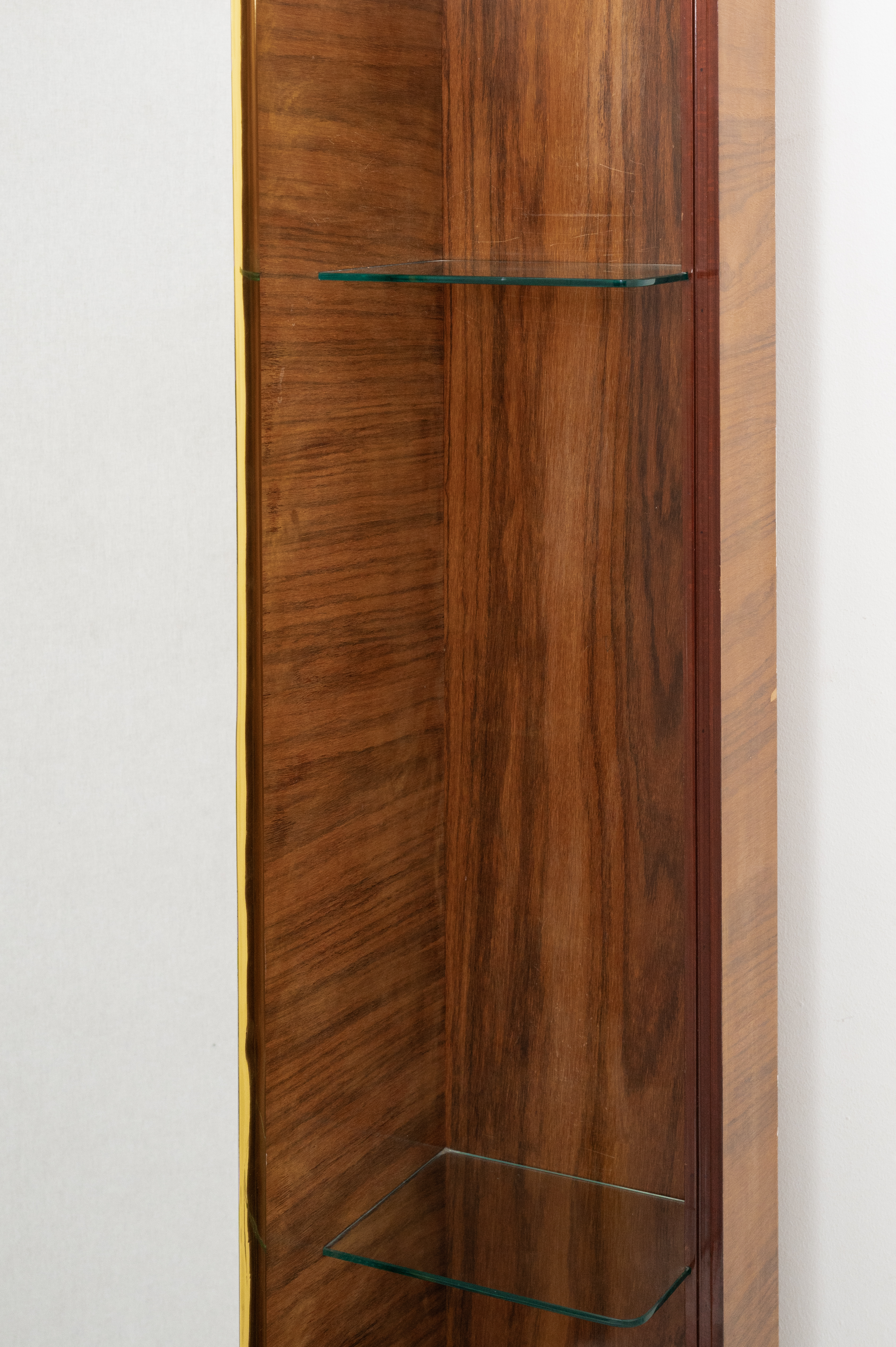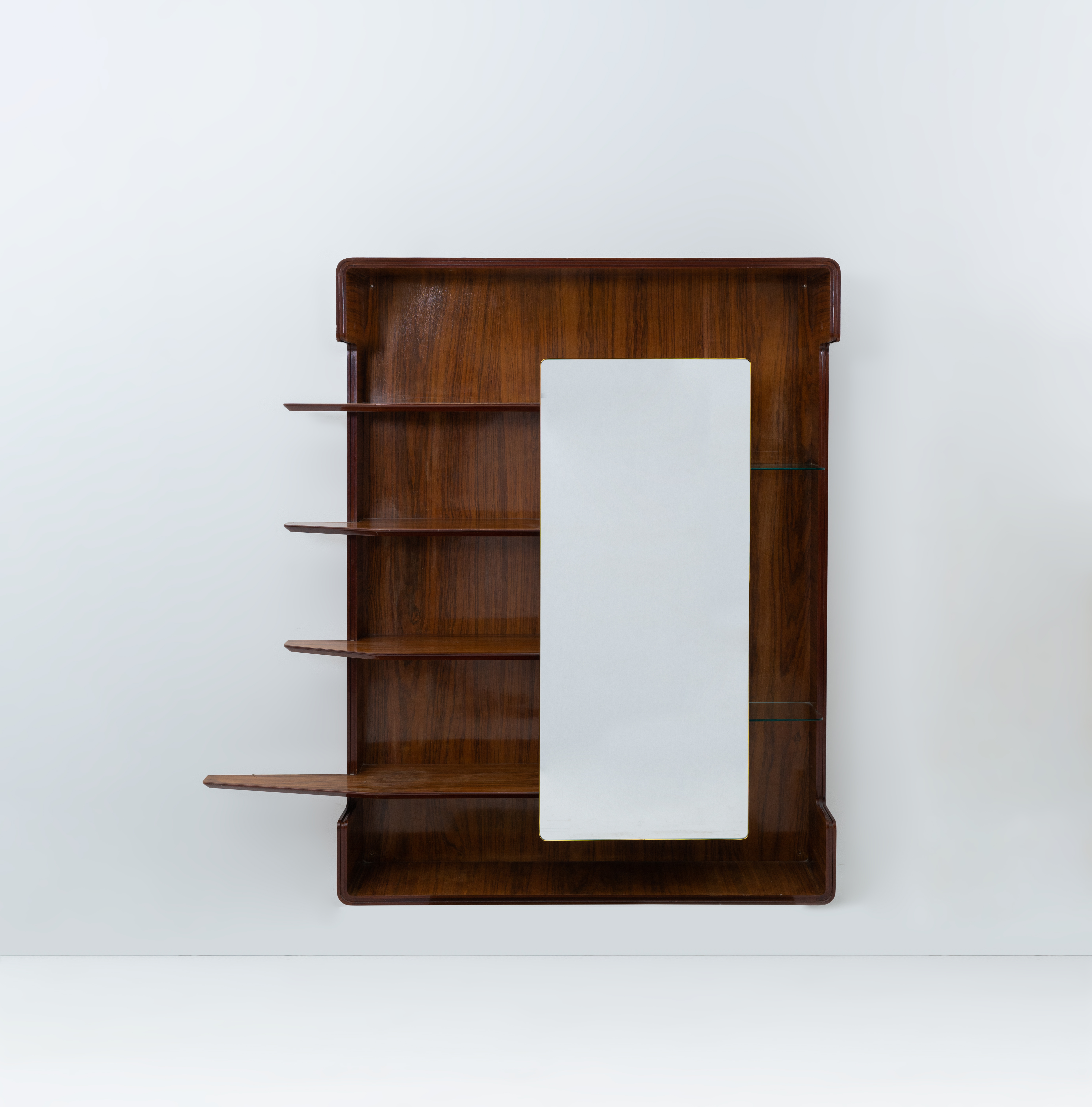 Mobile contenitore sospeso realizzato in legno esotico, composto da quattro mensole aggettanti, un vano chiuso con anta battente in cristallo specchiato, mensole laterali in vetro trasparente. Segni di uso.