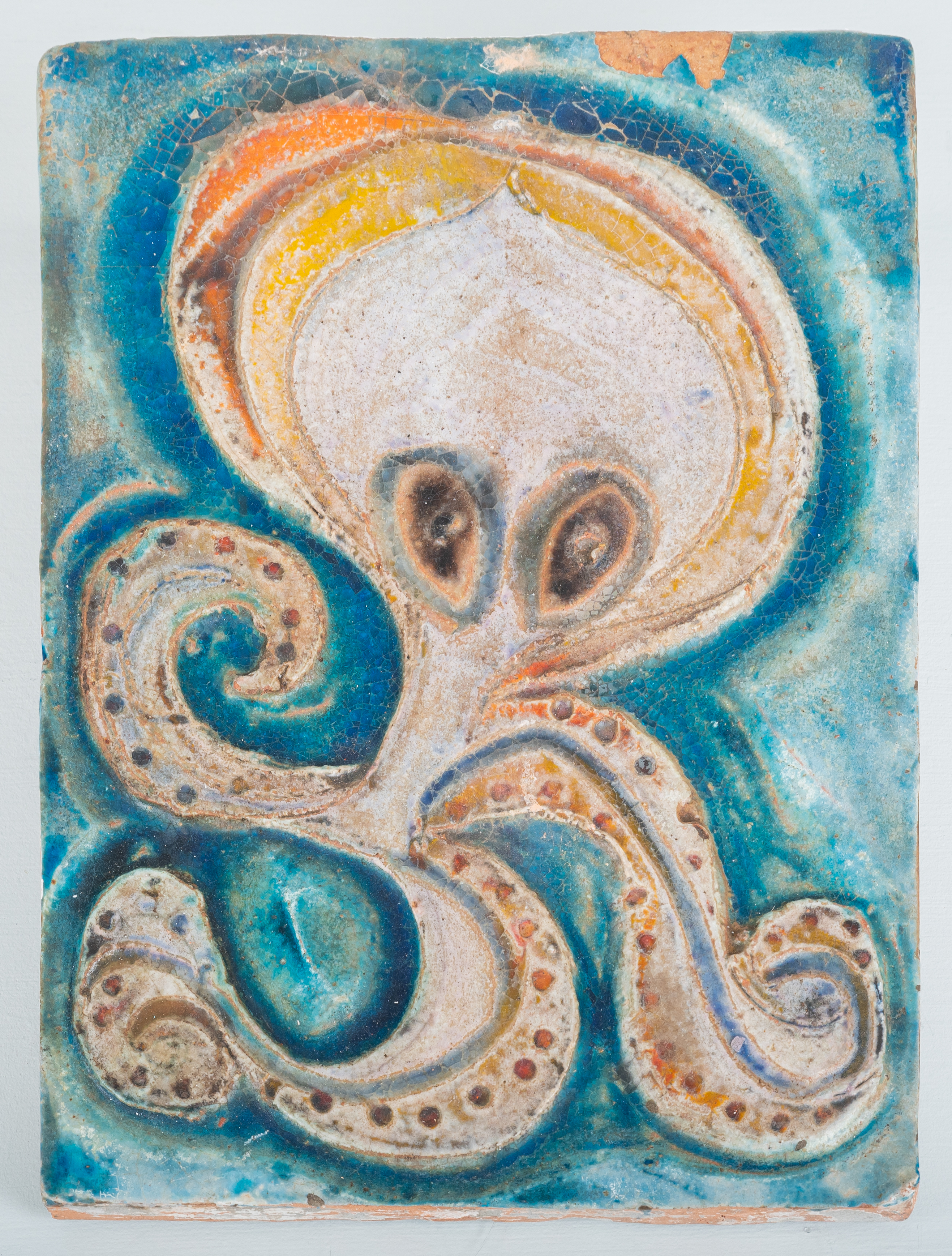 Placca rettangolare in ceramica smaltata ed invetriata decorata con motivo di polipo in policromia. Difetti.