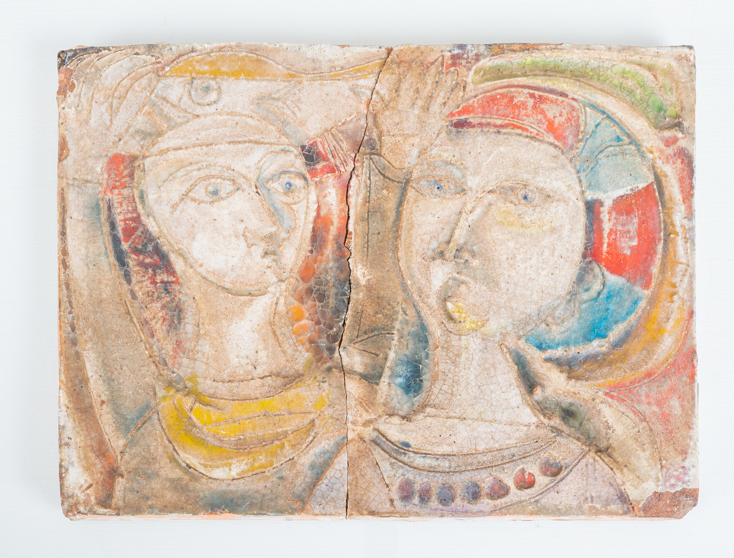 Placca rettangolare in ceramica smaltata ed invetriata decorata con figure umane in policromia. Difetti e rottura.
