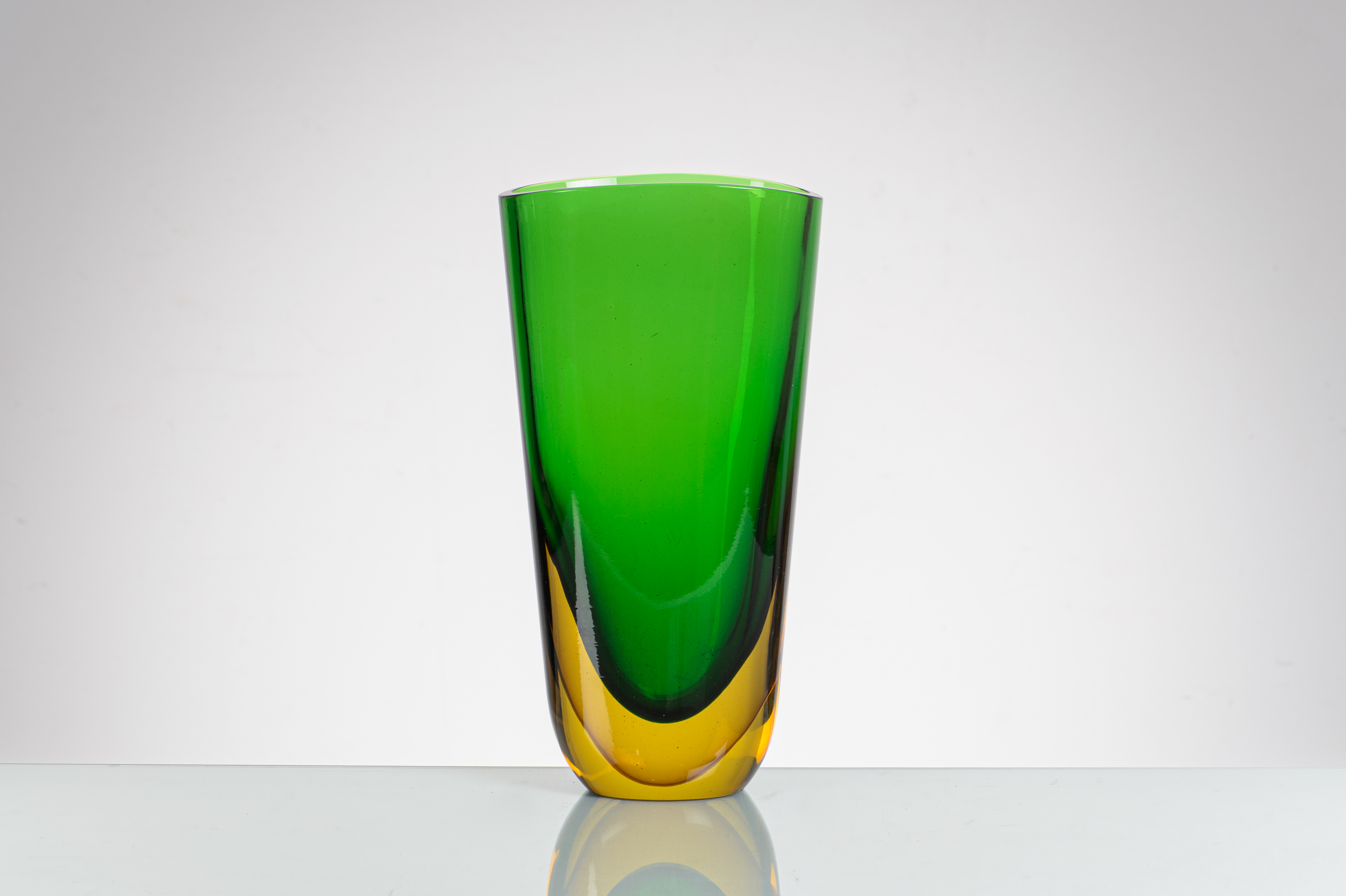 Vaso troncoconico a sezione ovale in vetro sommerso verde e ambra.