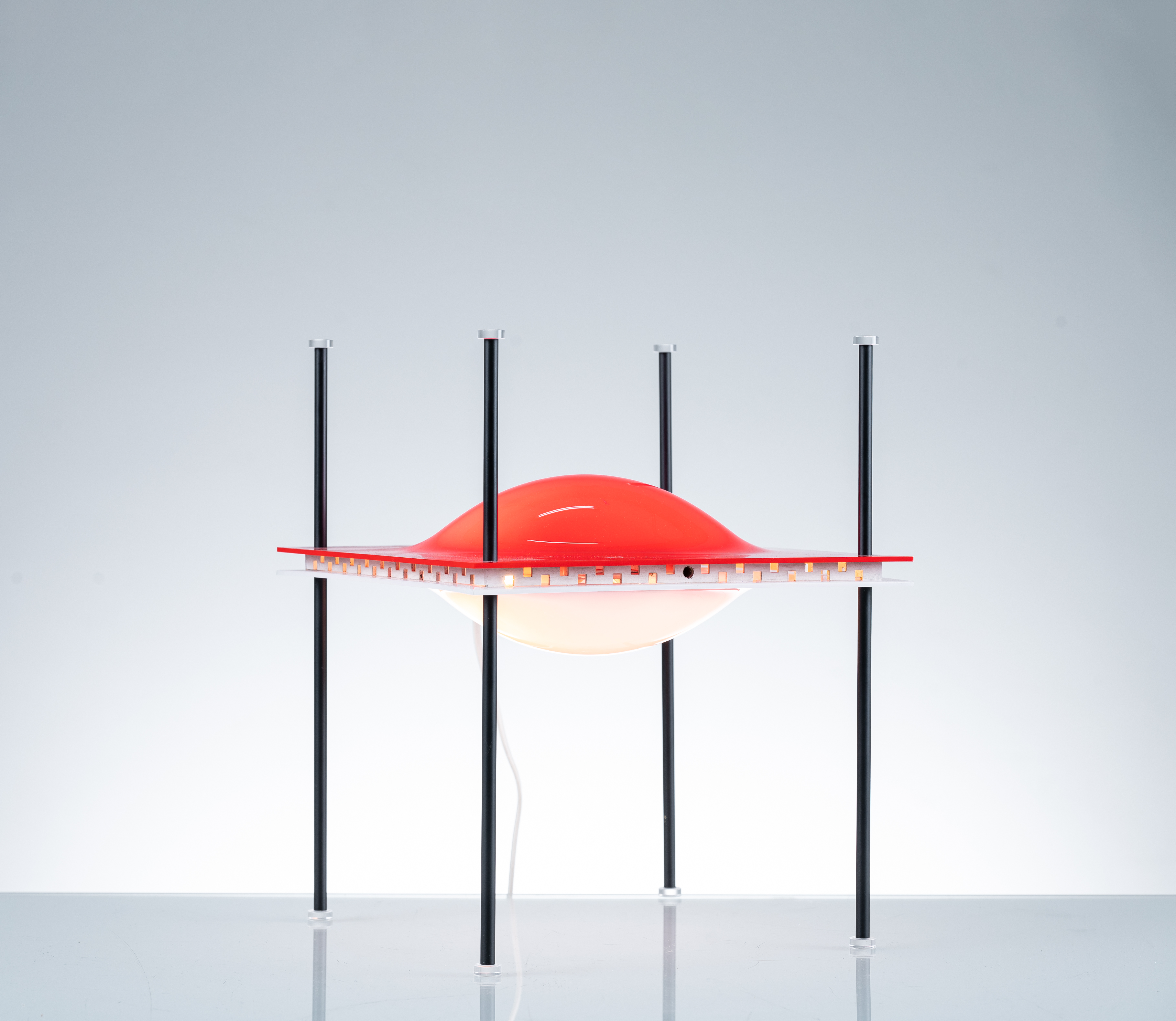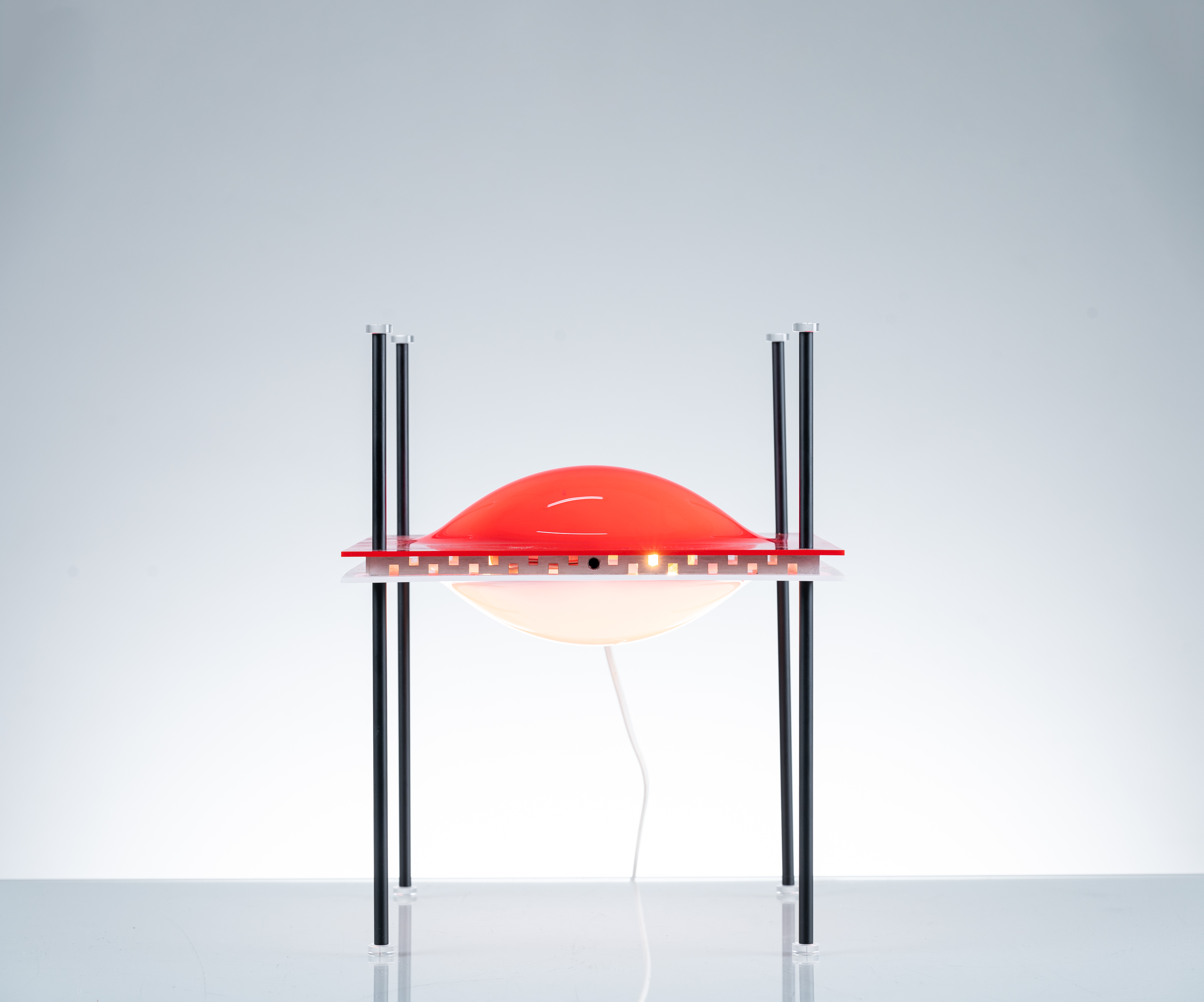 Lampada da tavolo a due luci detta "Palafitta" modello "12639" con struttura in metallo verniciato nero e diffusore in plexiglass colorato e modellato.