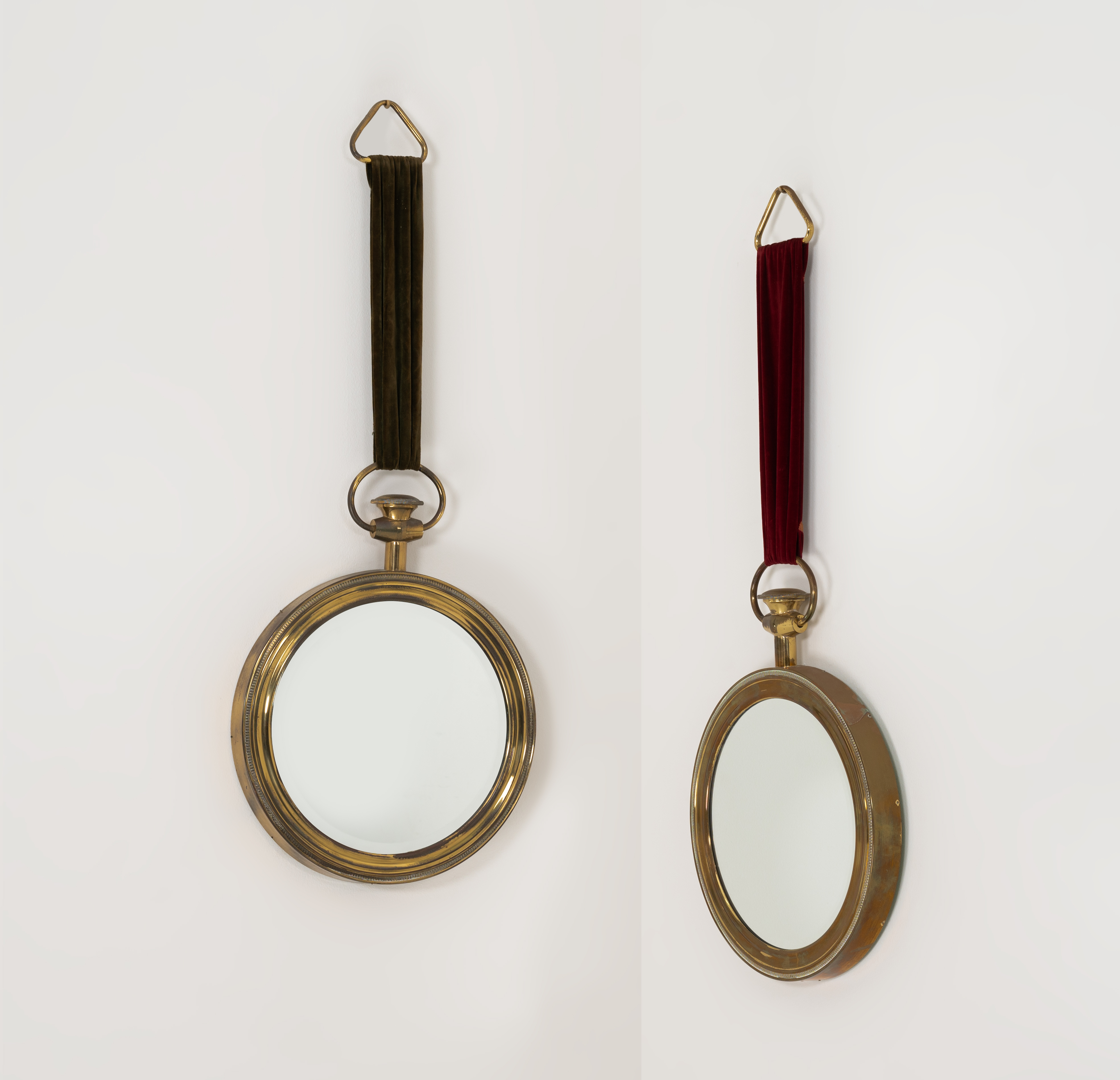 Due specchi da parete circolari con cornice sagomata in ottone, cristallo specchiato. Sostegni in tessuto di velluto uno verde ed uno rosso.