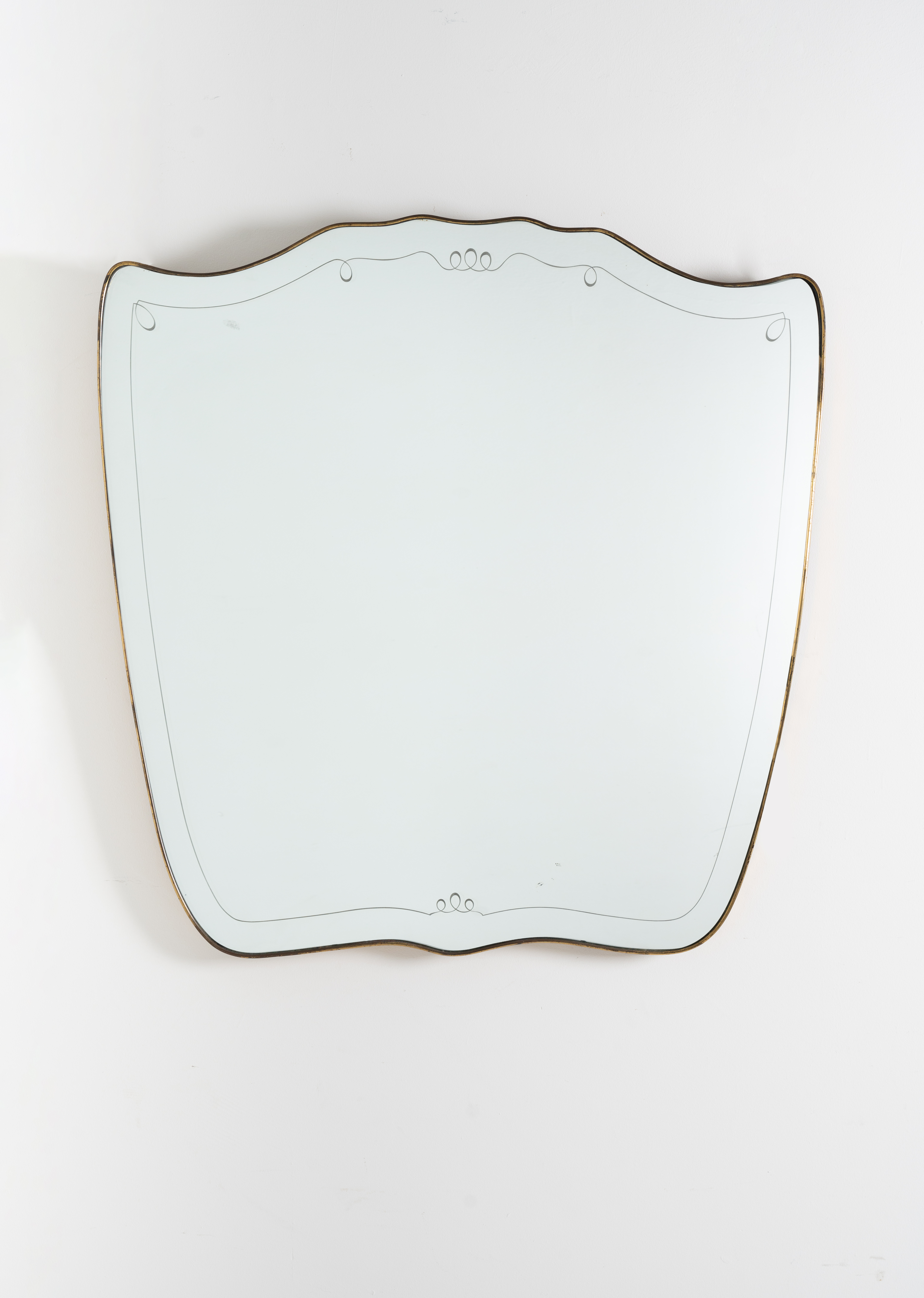 Specchio da parete con cornice sagomata in ottone, cristallo specchiato e decorato con motivo inciso perimetrale.
