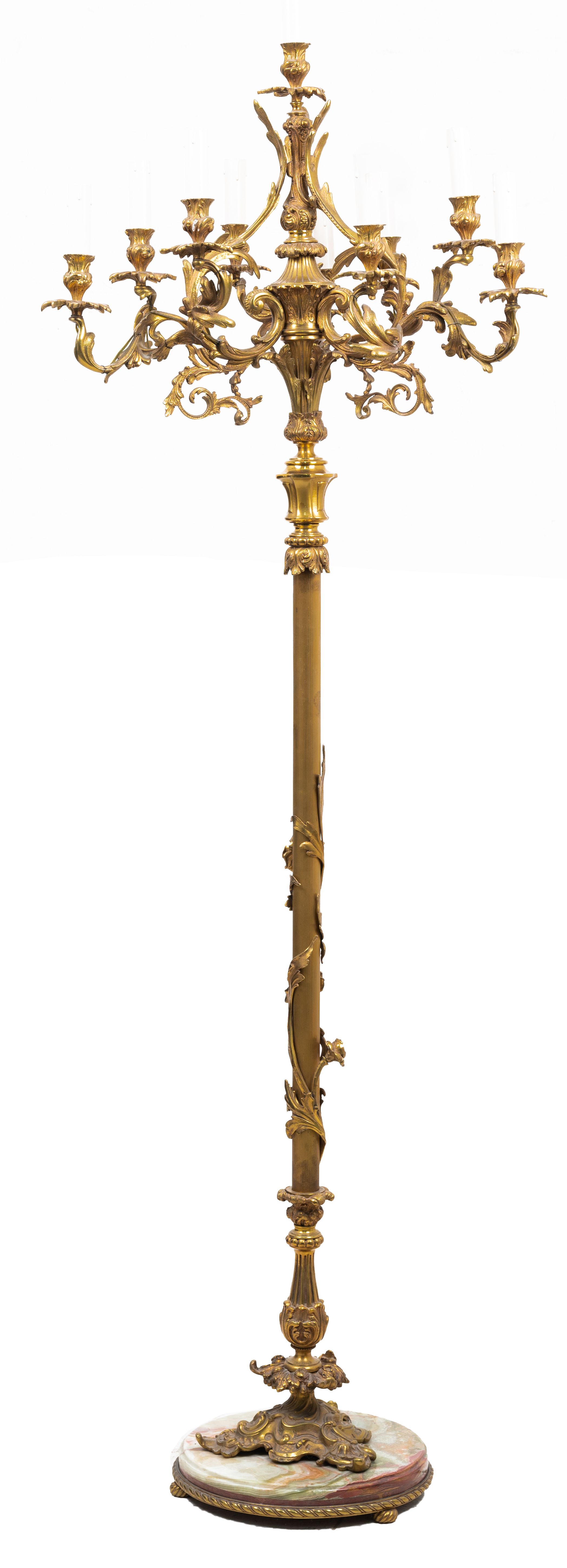 Candelabro da terra a dieci luci in ottone dorato, base in onice.