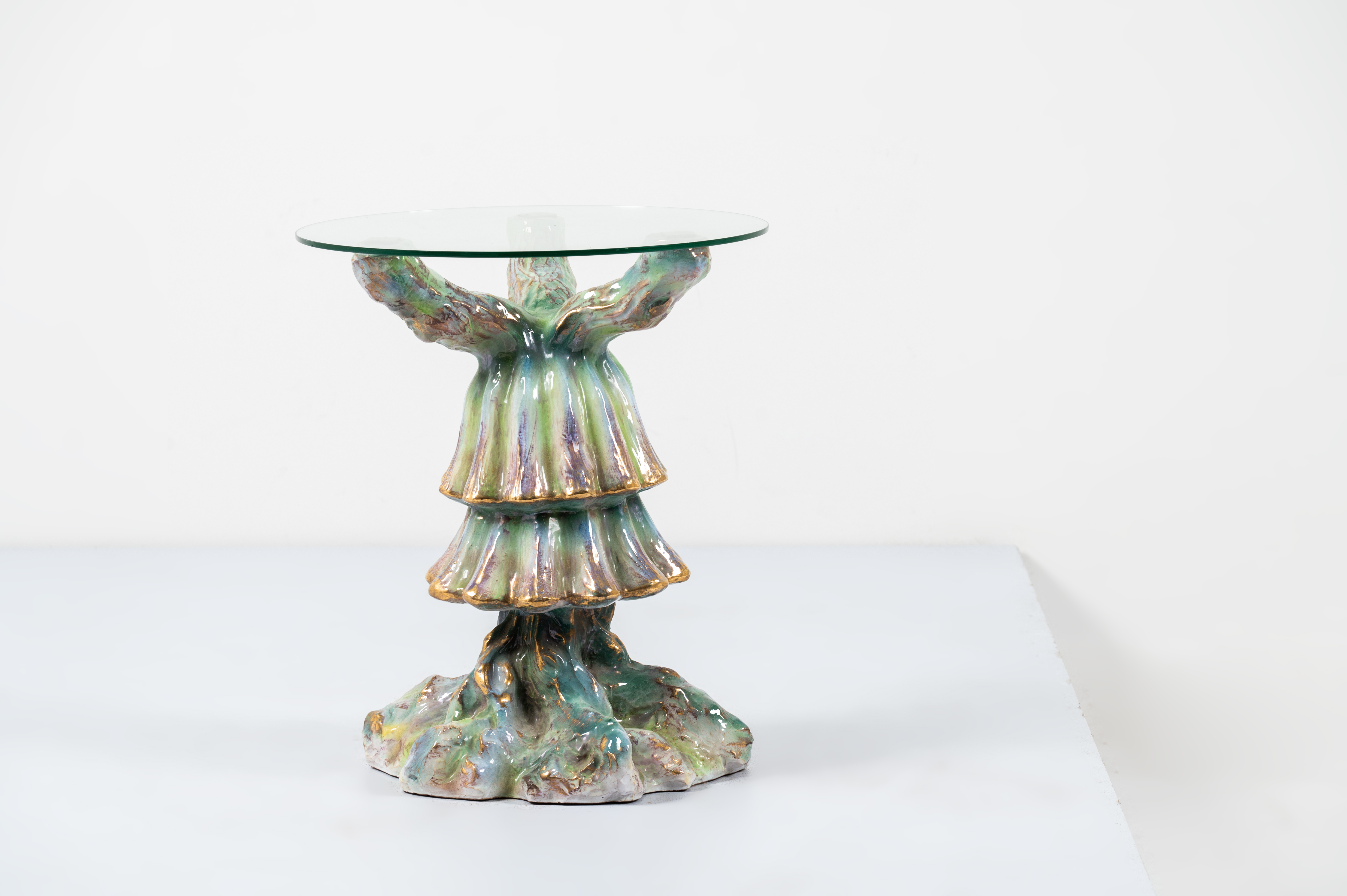 Tavolo da salotto con sostegno scultura in ceramica smaltata verde ed oro, piano circolare in vetro incolore.
