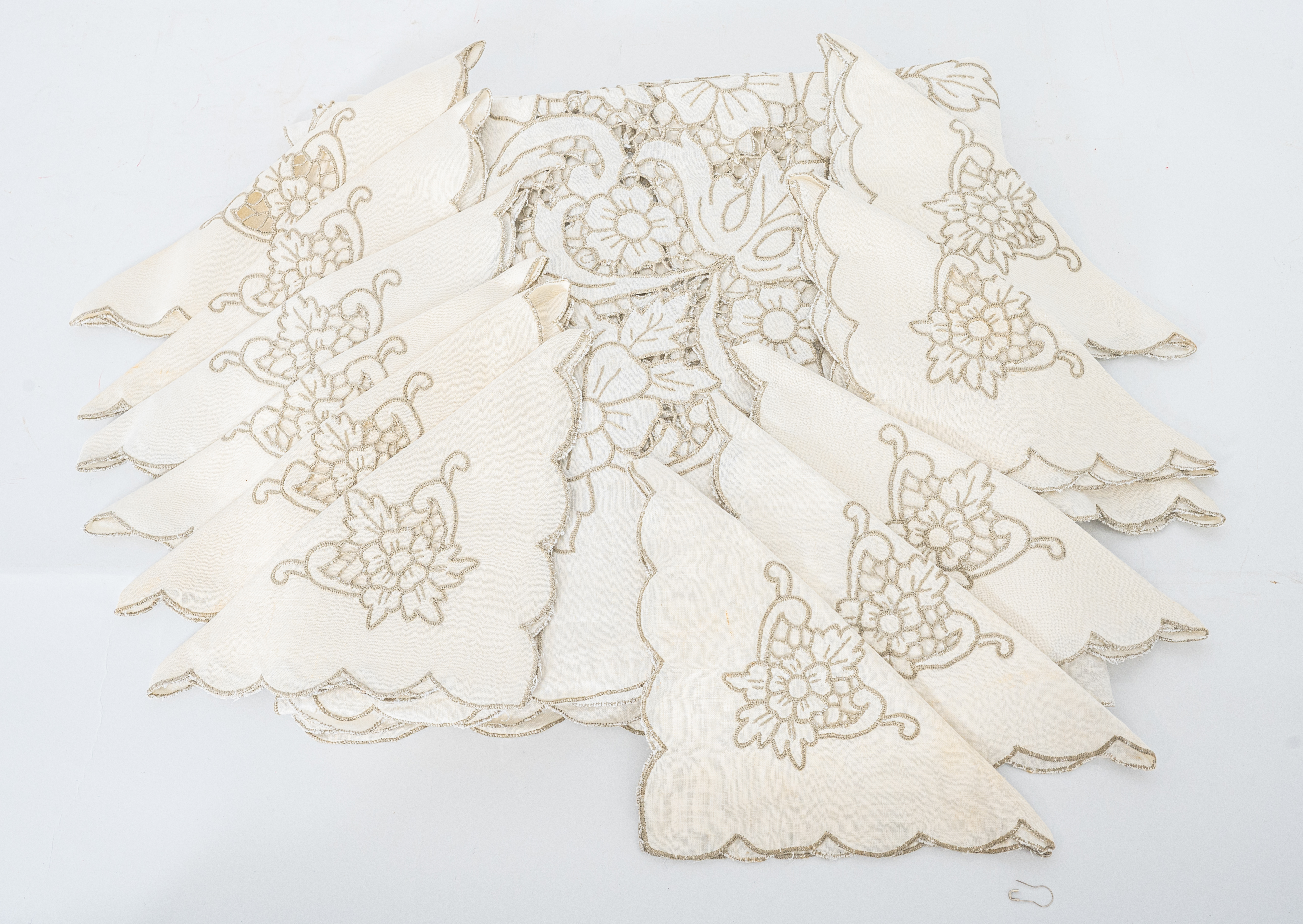 TOVAGLIA con dodici tovaglioli in lino bianco, ricami ad intaglio nei toni dell'ecrù (macchie).