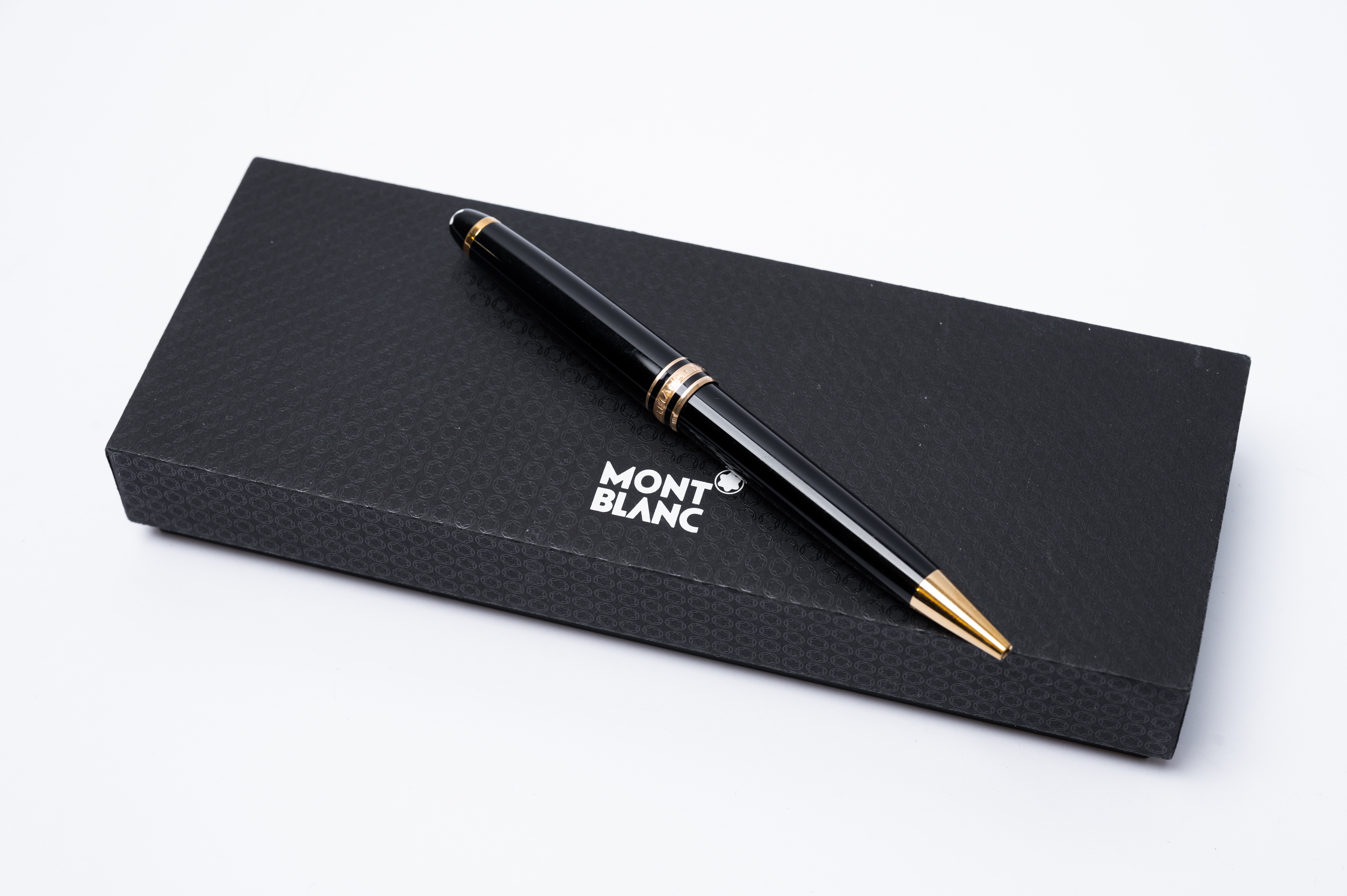 Penna a sfera Meisterstück in lacca nera e finiture in metallo dorato, cappuccio con logo Montblanc, custodia originale.