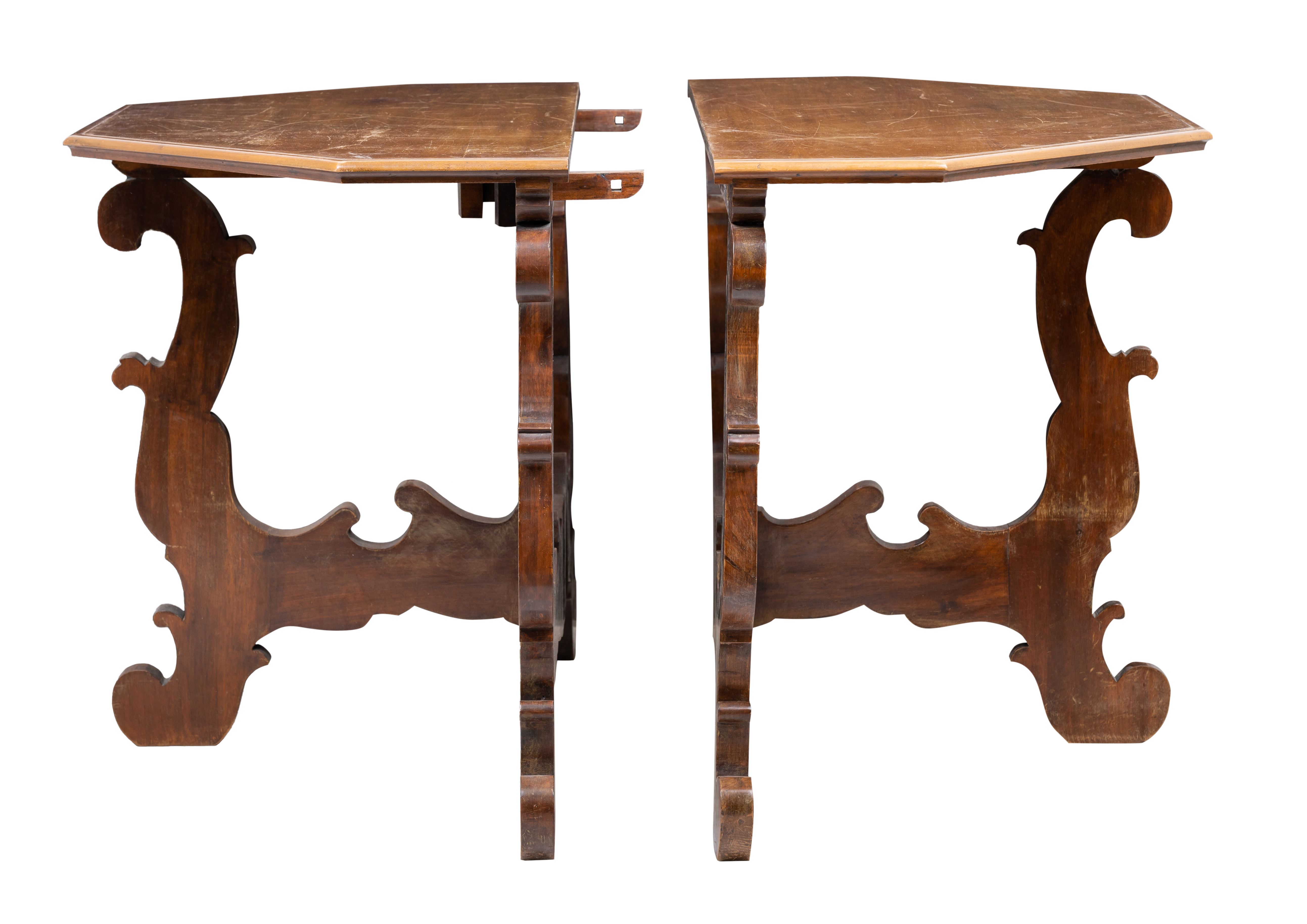Tavolo di forma ottagonale in legno di noce, divisibile in due consolle.
