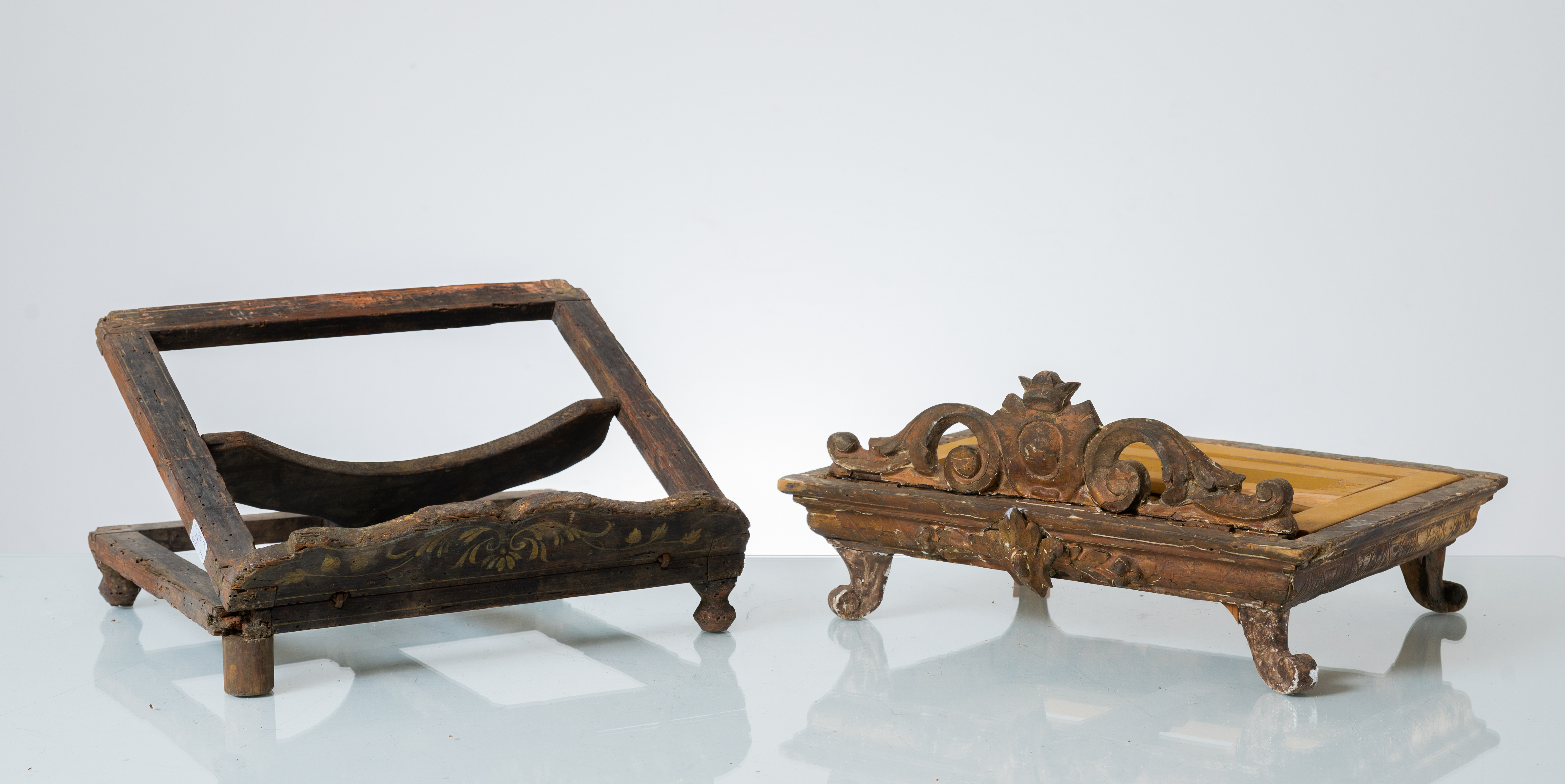 Due leggìi di cui uno in legno intagliato e dorato ed uno in legno laccato e decorato.