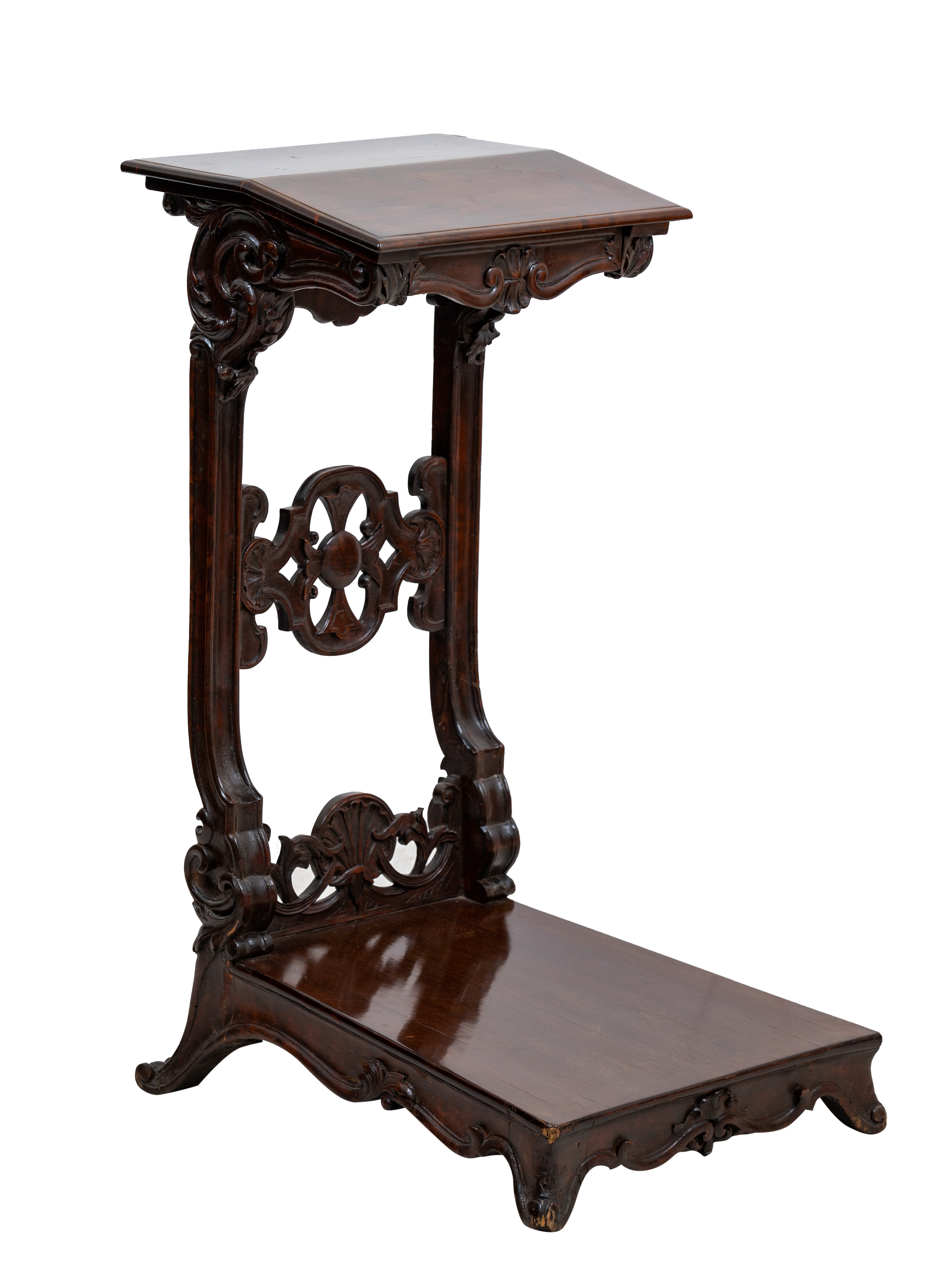 Inginocchiato in legno di noce con cuscino in stoffa lavorato a mano.