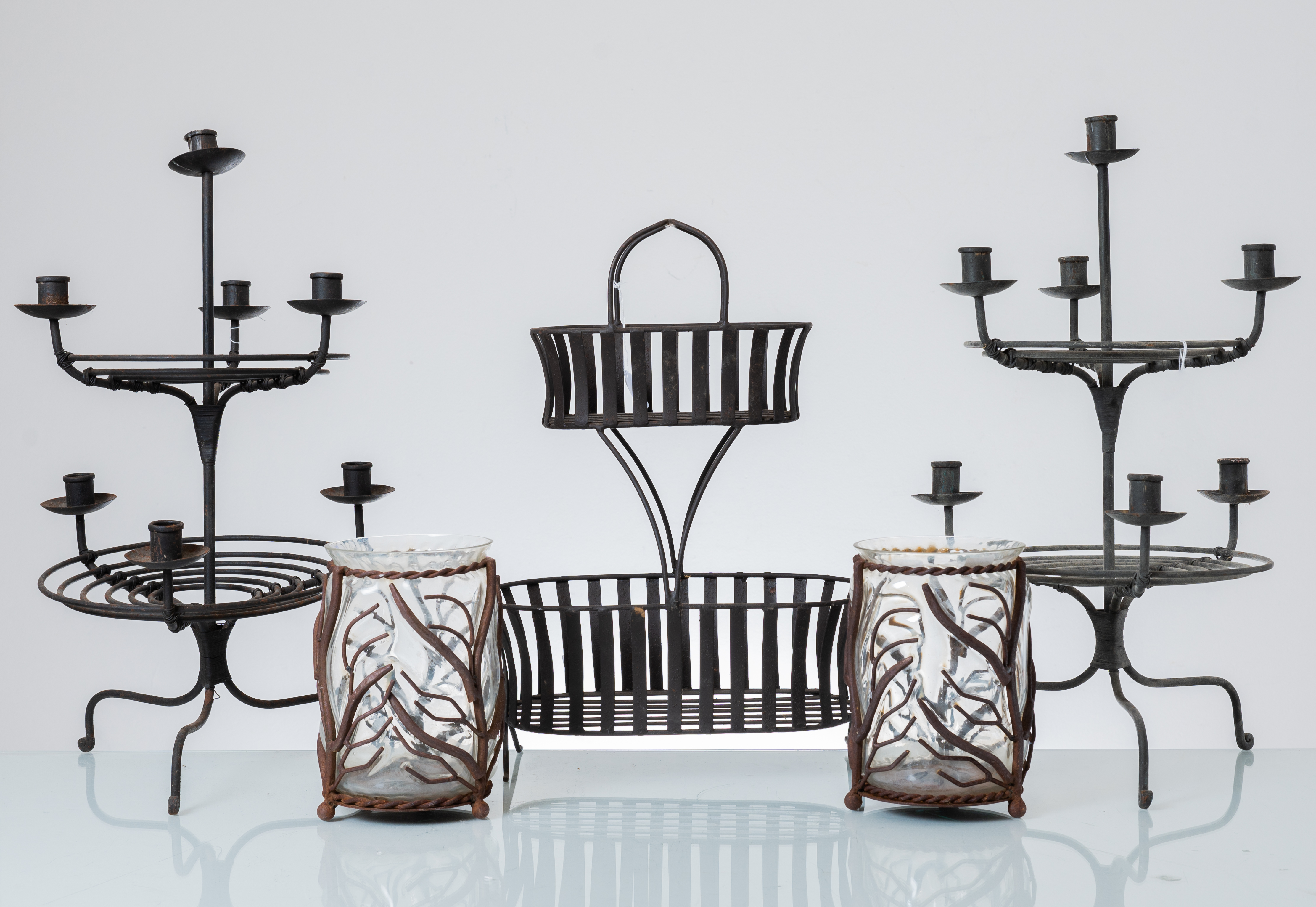 Nove portaceri, cestino ed un vassoio in ferro e peltro.