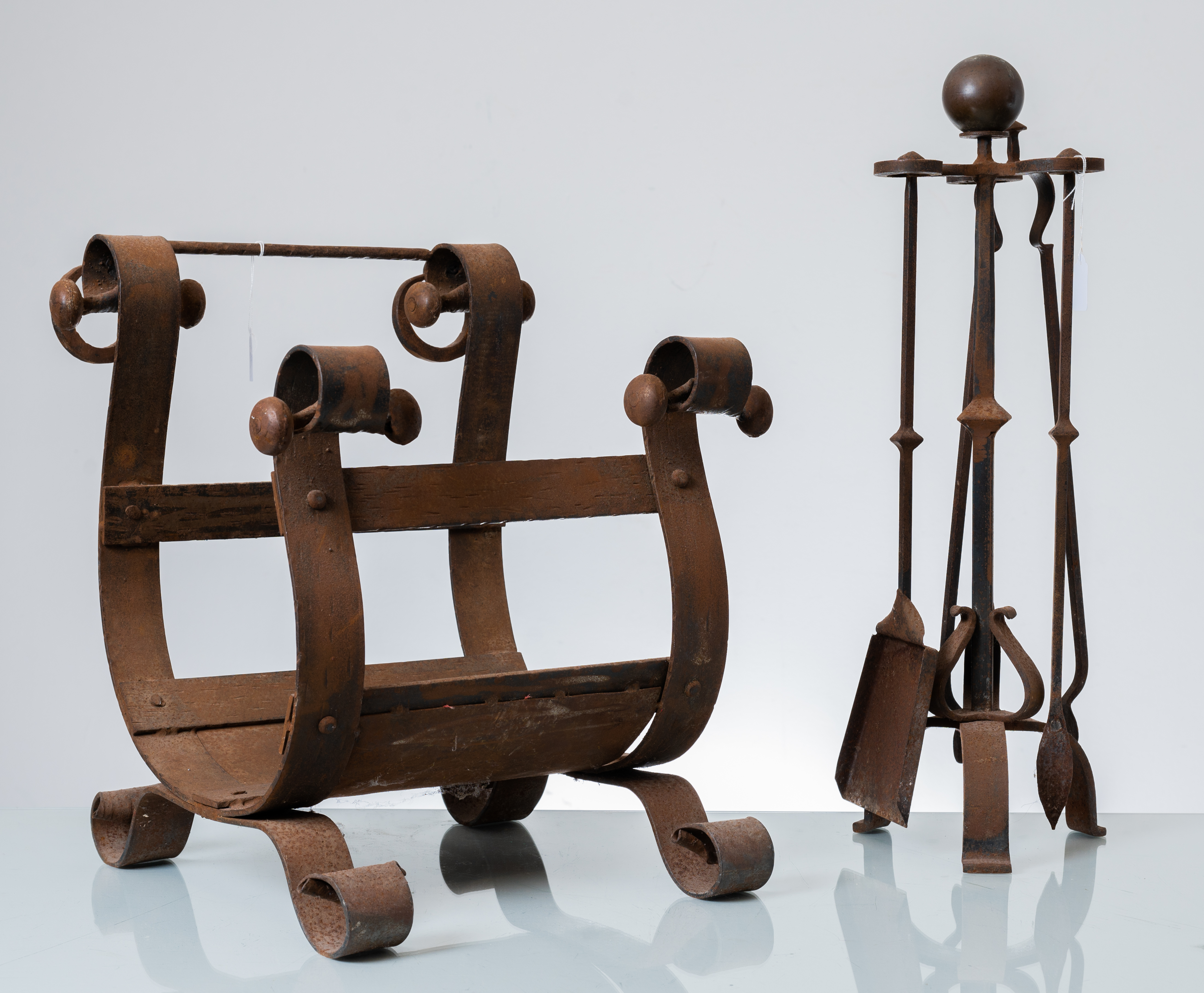 Quattro attrezzi in metallo; tre attrezzi in metallo con portattrezzi e portalegna.
