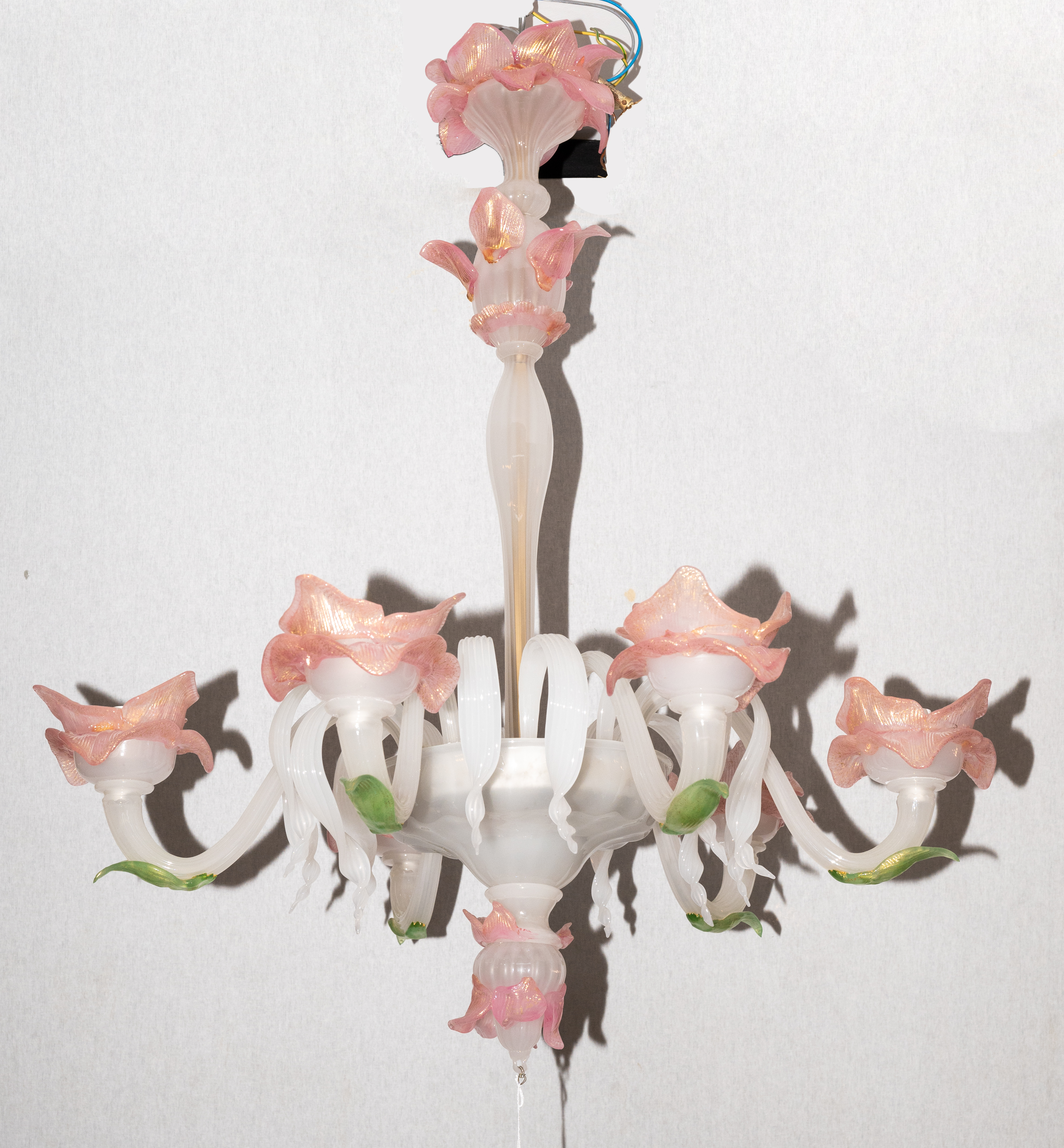 Lampadario a sei luci in vetro nei toni del bianco e del rosa (usure e mancanze).