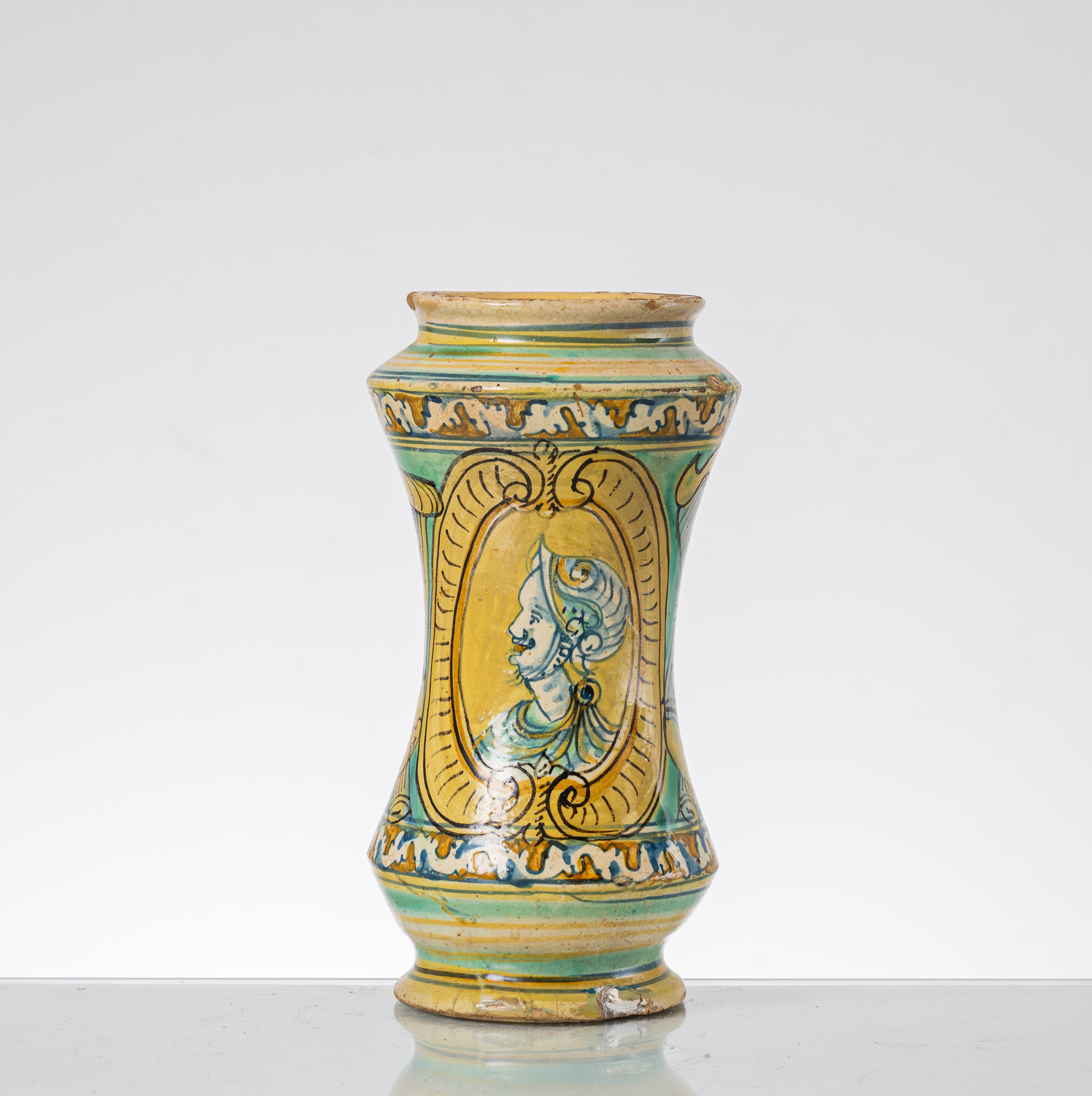 Albarello in ceramica decorata e smaltata con medaglione centrale raffigurante "Figura" (usure).